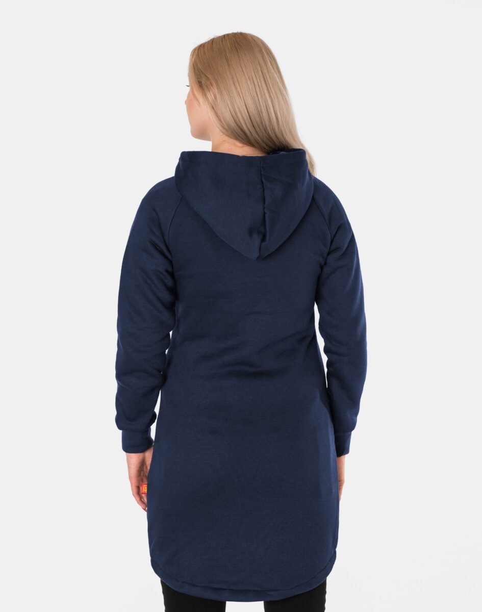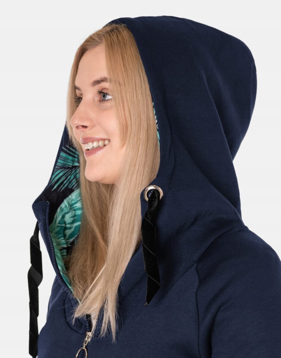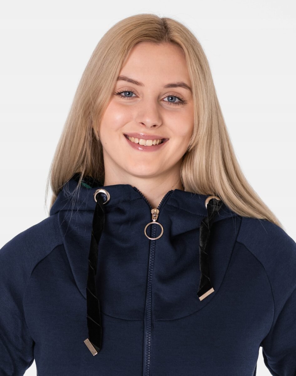 Znakomicie sprawdzi się w chłodniejsze dni, bo jest wyjątkowo ciepła i bardzo wygodna, a praktyczny kaptur ochroni Twoją głowę i szyję przed zimnem i wiatrem. Bluza/tunika zasuwana jest w całości, wraz z wysokim kołnierzem-stójką na zamek błyskawiczny i posiada dwie wpuszczane kieszenie na dłonie. Rękawy zakończone są szerokim elastycznym ściągaczem, co pozwala na precyzyjne dopasowanie bluzy do ciała i zapobiega utracie ciepła. Długość midi, asymetryczna – z tyłu dłuższa, a z przodu krótsza, która z powodzeniem zakrywa części ciała wrażliwe na chłód jak plecy na wysokości nerek i pośladki.