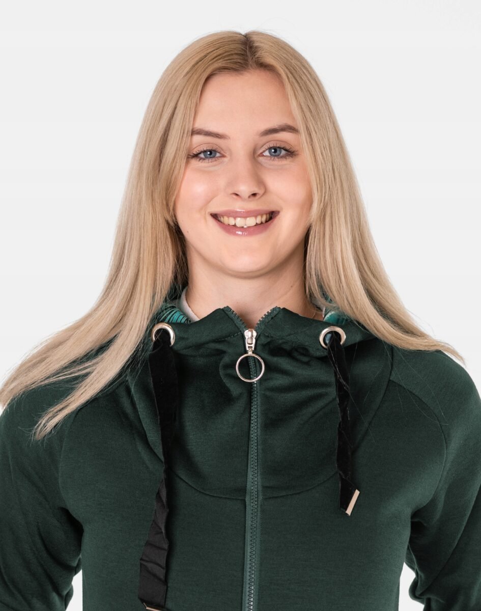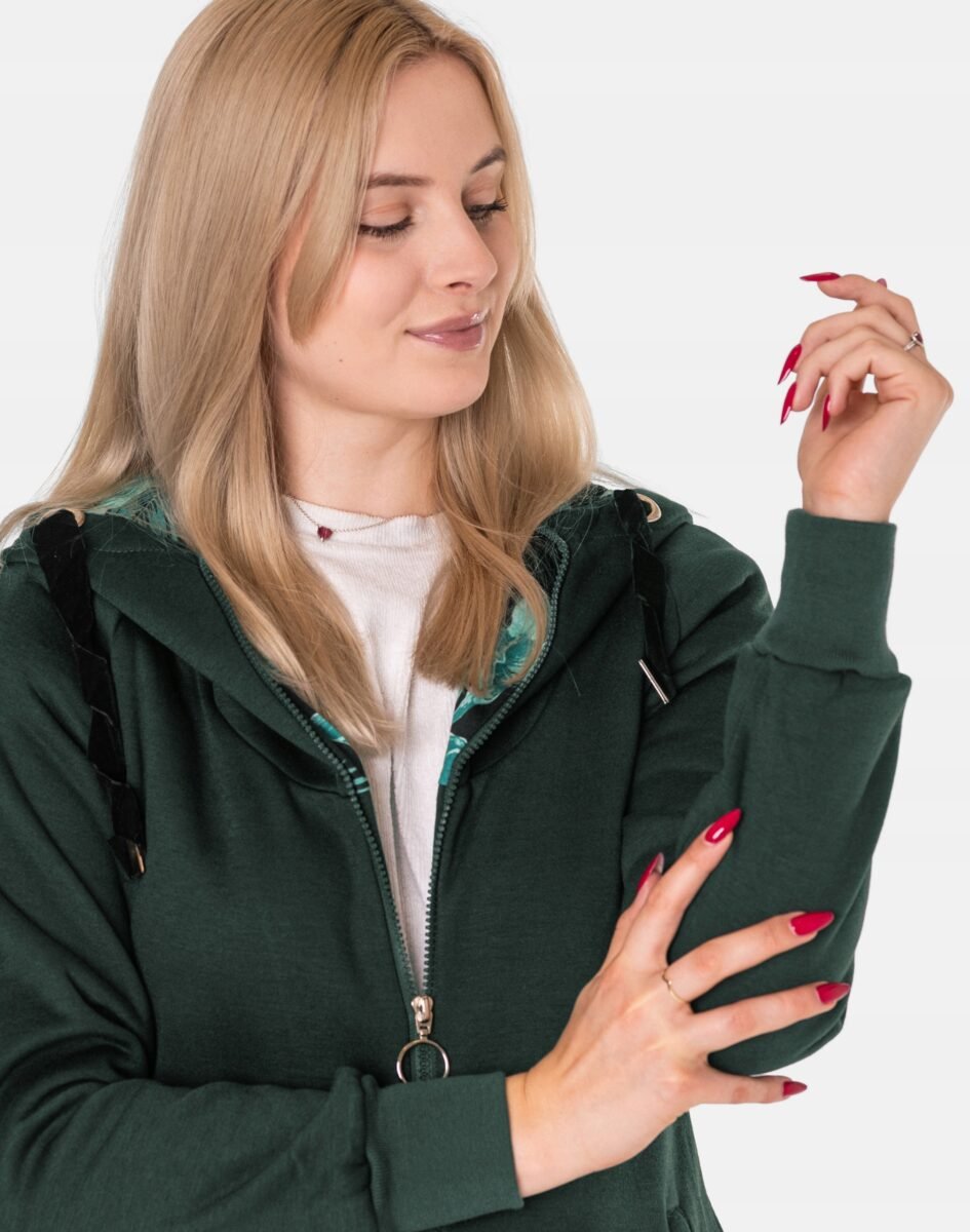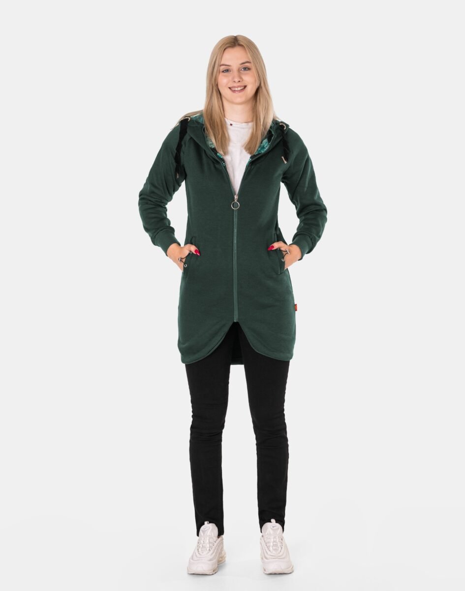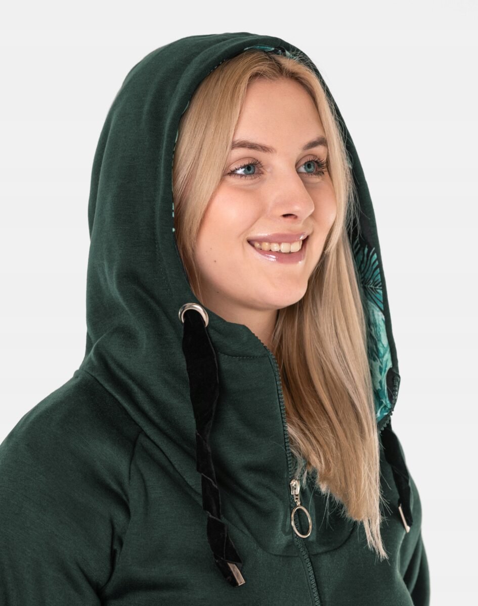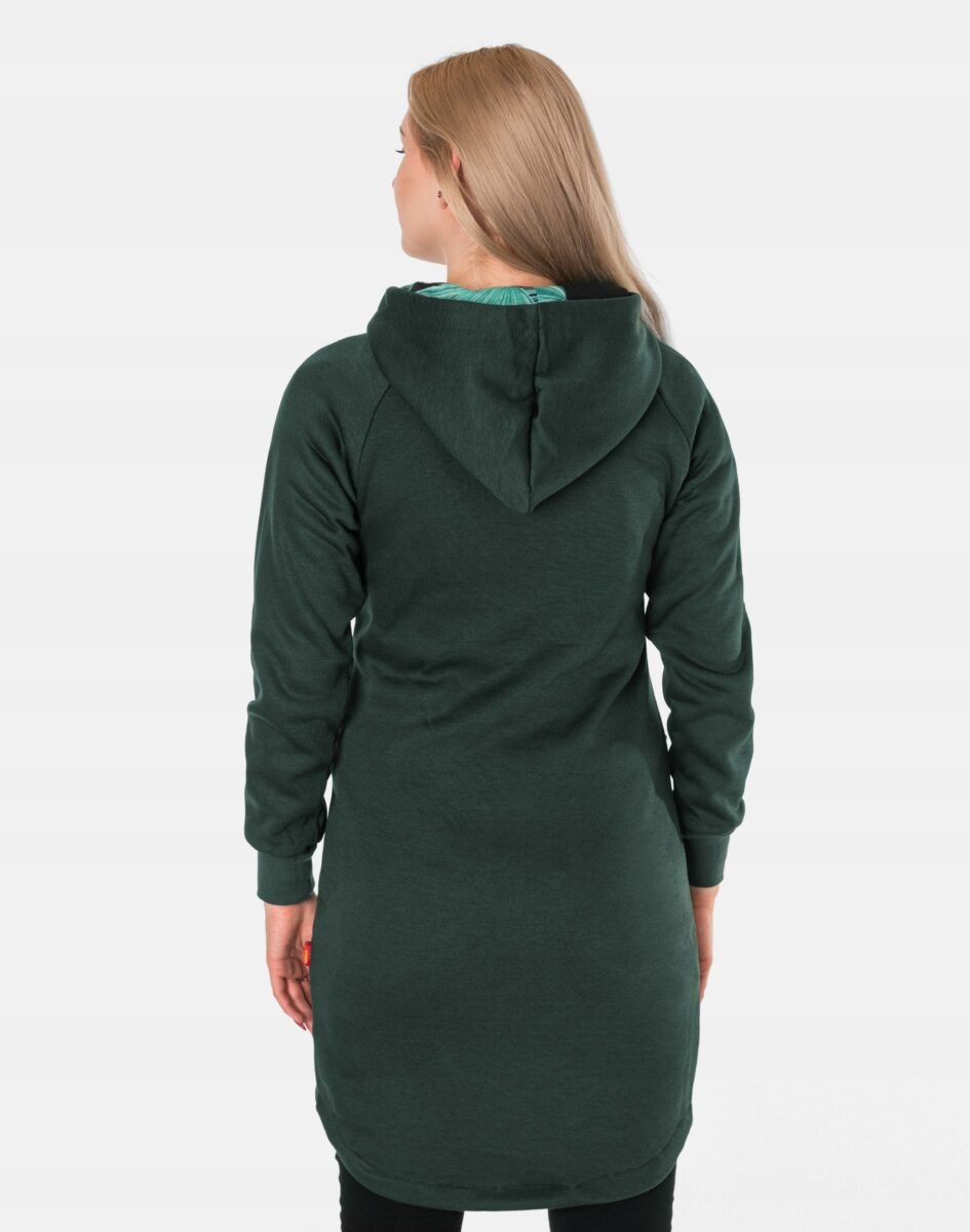 Znakomicie sprawdzi się w chłodniejsze dni, bo jest wyjątkowo ciepła i bardzo wygodna, a praktyczny kaptur ochroni Twoją głowę i szyję przed zimnem i wiatrem. Bluza/tunika zasuwana jest w całości, wraz z wysokim kołnierzem-stójką na zamek błyskawiczny i posiada dwie wpuszczane kieszenie na dłonie. Rękawy zakończone są szerokim elastycznym ściągaczem, co pozwala na precyzyjne dopasowanie bluzy do ciała i zapobiega utracie ciepła. Długość midi, asymetryczna – z tyłu dłuższa, a z przodu krótsza, która z powodzeniem zakrywa części ciała wrażliwe na chłód jak plecy na wysokości nerek i pośladki.