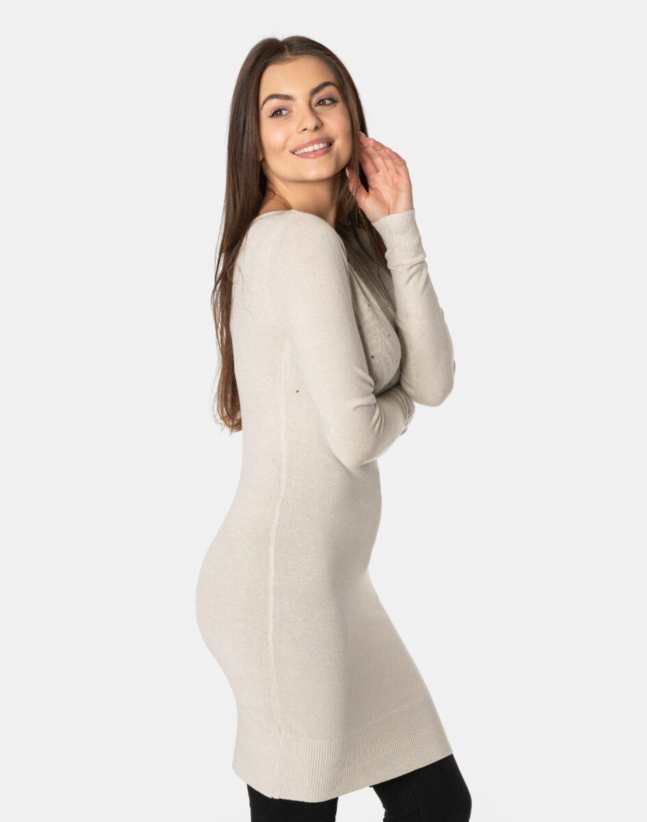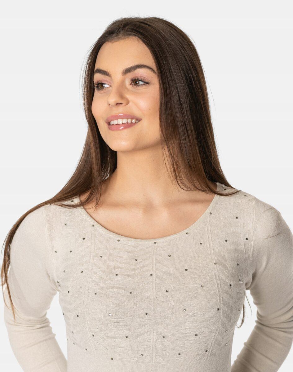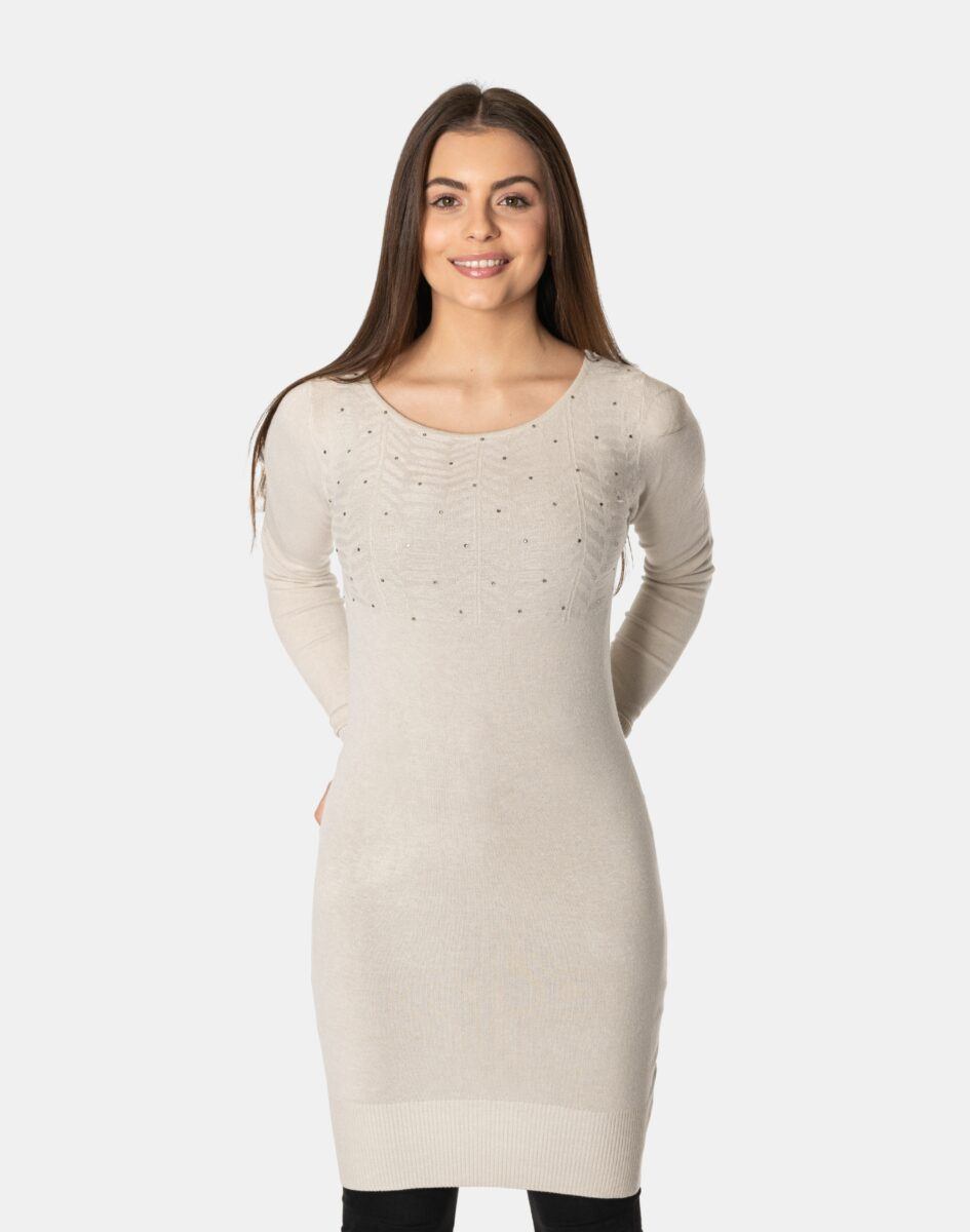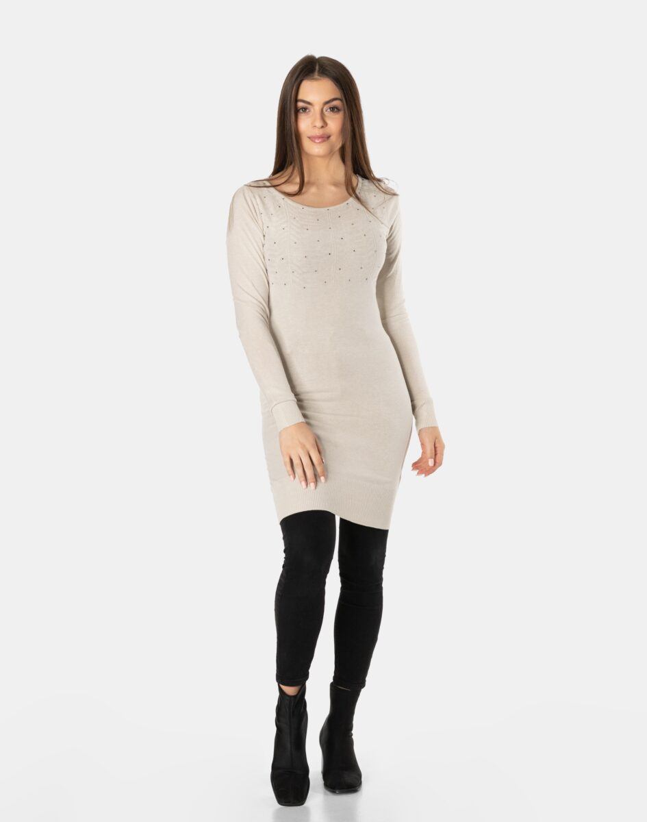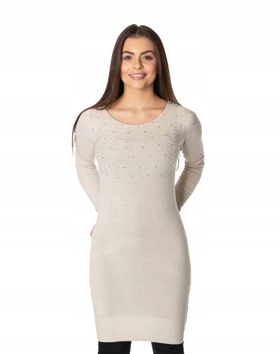 Efektowny długi sweterek/tunika o taliowanym kroju, wyprodukowany z wysokiej jakości cienkiej dzianiny sweterkowej będącej mieszanką bawełny, kaszmiru, wełny i elastanu zapewniającej maksymalną wygodę i komfort użytkowania, a także wyróżniający się zmysłową kobiecością, fenomenalnie podkreślając atuty kobiecej sylwetki. Miękka i elastyczna dzianina idealnie dopasowuje się do figury zapewniając wysoki komfort noszenia, a atrakcyjnie wycięty i ozdobiony drobnymi cyrkoniami dekolt dodaje całości mnóstwo seksapilu.