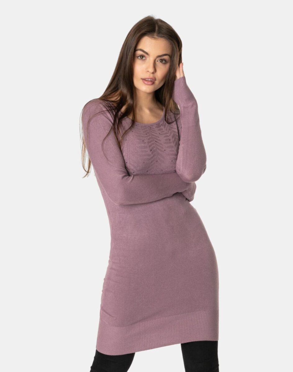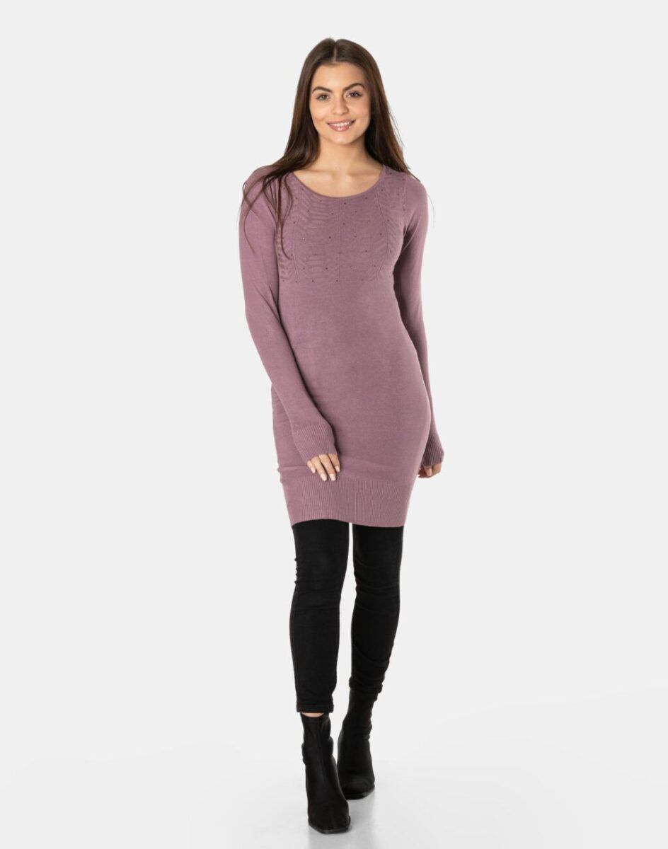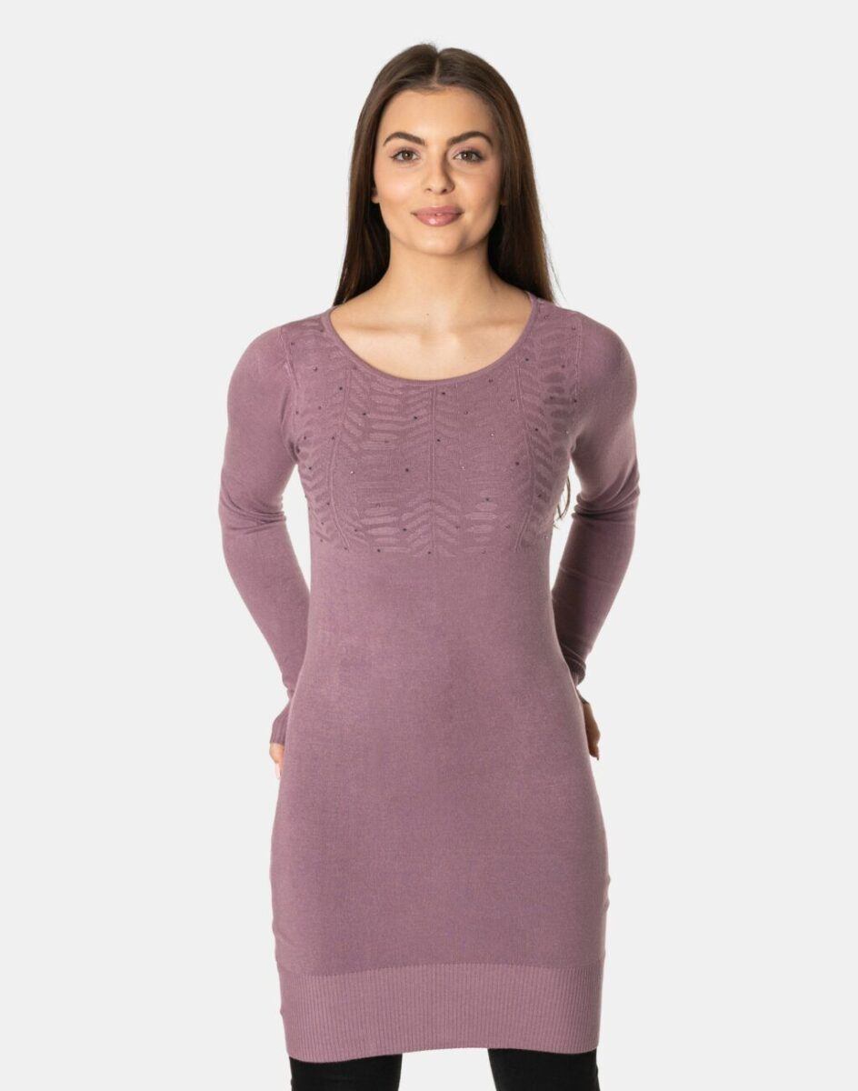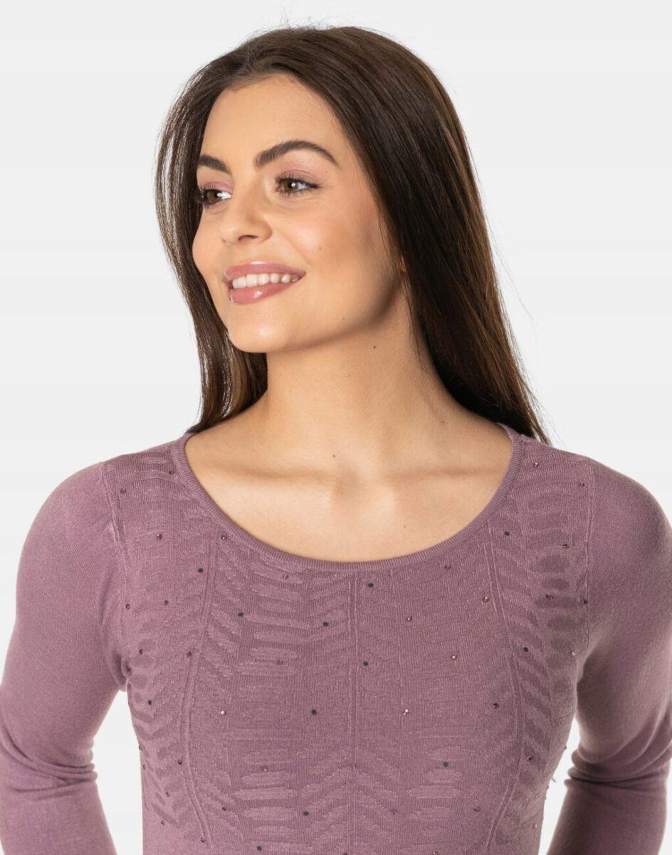 Efektowny długi sweterek/tunika o taliowanym kroju, wyprodukowany z wysokiej jakości cienkiej dzianiny sweterkowej będącej mieszanką bawełny, kaszmiru, wełny i elastanu zapewniającej maksymalną wygodę i komfort użytkowania, a także wyróżniający się zmysłową kobiecością, fenomenalnie podkreślając atuty kobiecej sylwetki. Miękka i elastyczna dzianina idealnie dopasowuje się do figury zapewniając wysoki komfort noszenia, a atrakcyjnie wycięty i ozdobiony drobnymi cyrkoniami dekolt dodaje całości mnóstwo seksapilu.