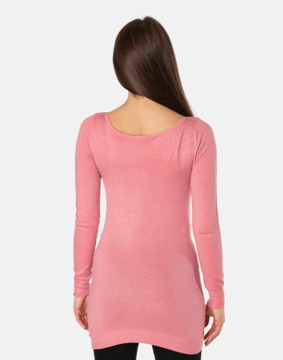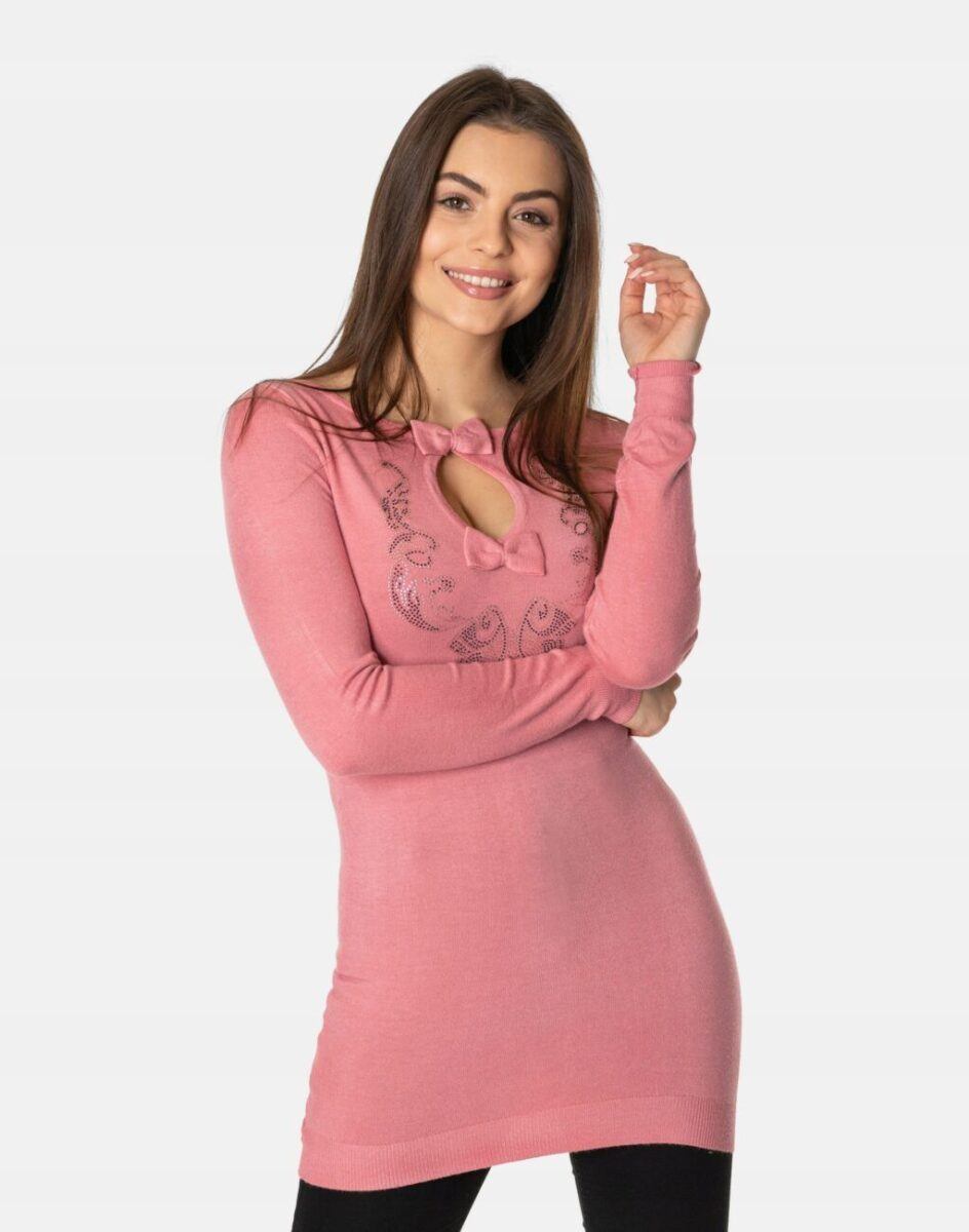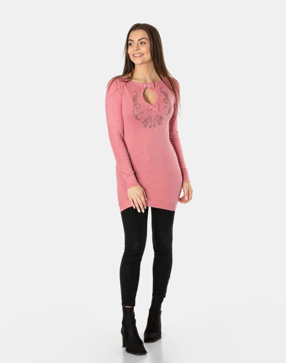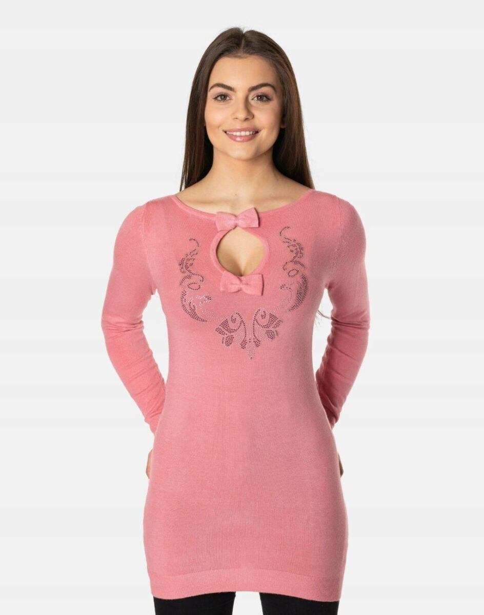 Efektowny długi sweterek/tunika o taliowanym kroju wyprodukowany z wysokiej jakości cienkiej dzianiny sweterkowej będącej mieszanką bawełny, kaszmiru, wełny i elastanu zapewniającej maksymalną wygodę i komfort użytkowania, a także wyróżniający się zmysłową kobiecością, fenomenalnie podkreślając atuty kobiecej sylwetki. Miękka i elastyczna dzianina idealnie dopasowuje się do figury zapewniając wysoki komfort noszenia, a atrakcyjnie wycięty i ozdobiony drobnymi cyrkoniami dekolt dodaje całości mnóstwo seksapilu.