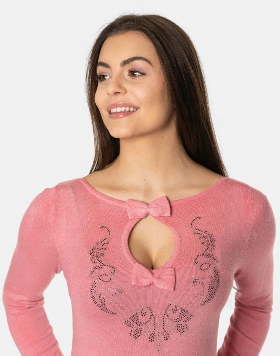 - Rodzaj dekoltu: okrągły, atrakcyjnie wycięty, z kokardą
