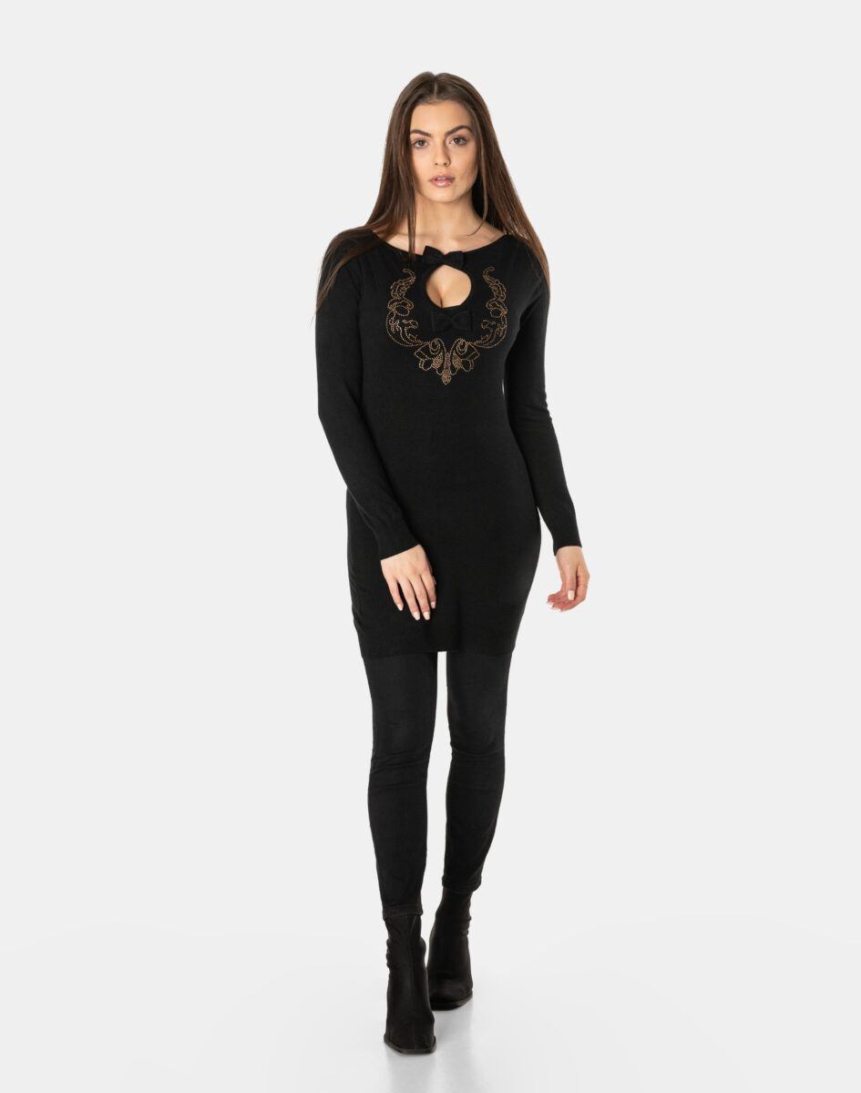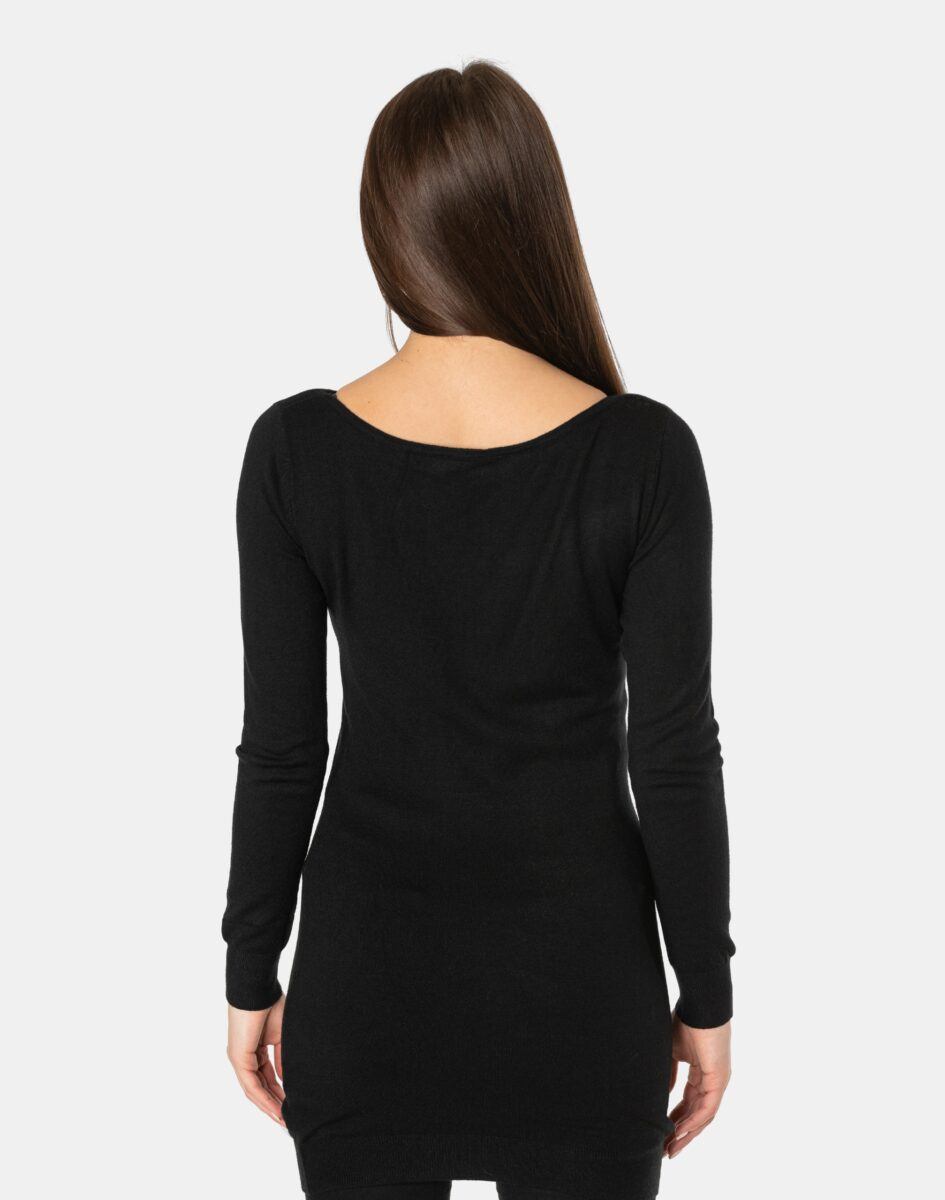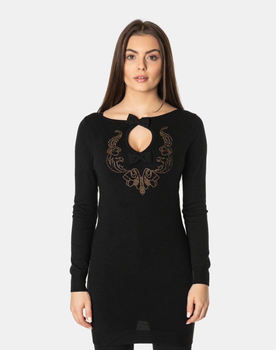 Efektowny długi sweterek/tunika o taliowanym kroju wyprodukowany z wysokiej jakości cienkiej dzianiny sweterkowej będącej mieszanką bawełny, kaszmiru, wełny i elastanu zapewniającej maksymalną wygodę i komfort użytkowania, a także wyróżniający się zmysłową kobiecością, fenomenalnie podkreślając atuty kobiecej sylwetki. Miękka i elastyczna dzianina idealnie dopasowuje się do figury zapewniając wysoki komfort noszenia, a atrakcyjnie wycięty i ozdobiony drobnymi cyrkoniami dekolt dodaje całości mnóstwo seksapilu.