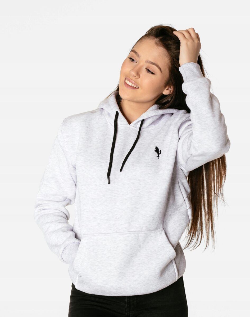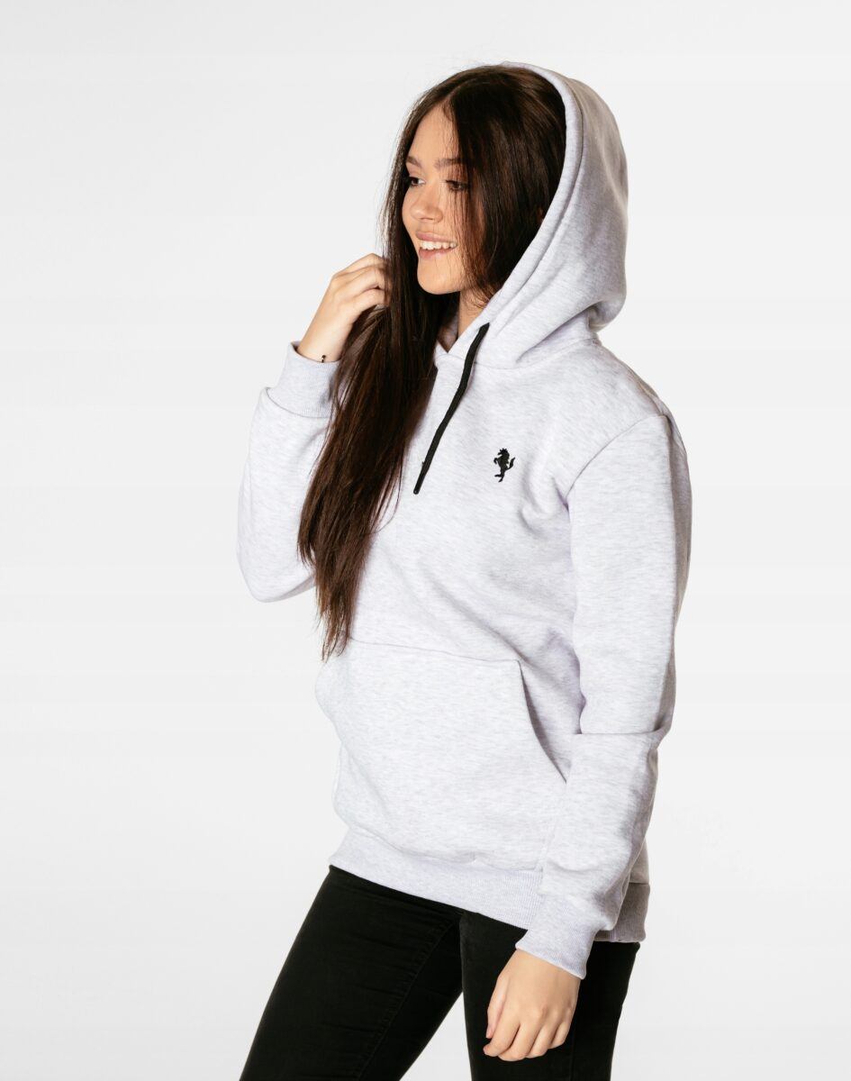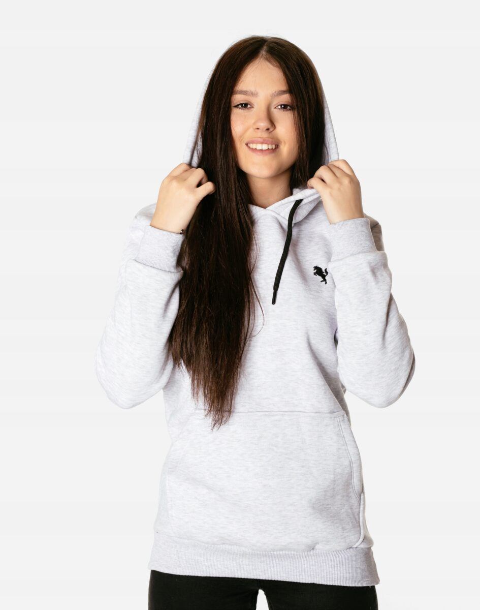 Sportowa bluza damska typu kangurka wyprodukowana z ciepłej dzianiny wiskozowej, zapewniającej maksymalną wygodę i komfort użytkowania. Wiskoza jest przewiewna i lekka produkowana jest z włókien celulozy, co sprawia iż gwarantuje ona dobre właściwości higroskopijne, wspaniałą izolację cieplną, świetnie pochłania pot i wodę i odprowadza je z powierzchni skóry. To z kolei sprawia, iż wilgotne ubrania nie przywierają do ciała i pozwalają skórze oddychać. Sam materiał nie uczula i odznacza się dużą miękkością. Wysoka jakość zastosowanej do produkcji dzianiny to także gwarancja pełnej swobody ruchów oraz stabilności rozmiarów i kolorów po wielokrotnym praniu. Klasyczna, gładka, wkładana przez głowę, posiada podwójną wygodną kieszeń tak zwaną „kangurkę” i zintegrowany kaptur z możliwością regulacji wielkości i dopasowania taśmowym ściągaczem. Ergonomiczny krój bluzy nie ogranicza swobody ruchów co wpływa pozytywnie na wygodę użytkowania.