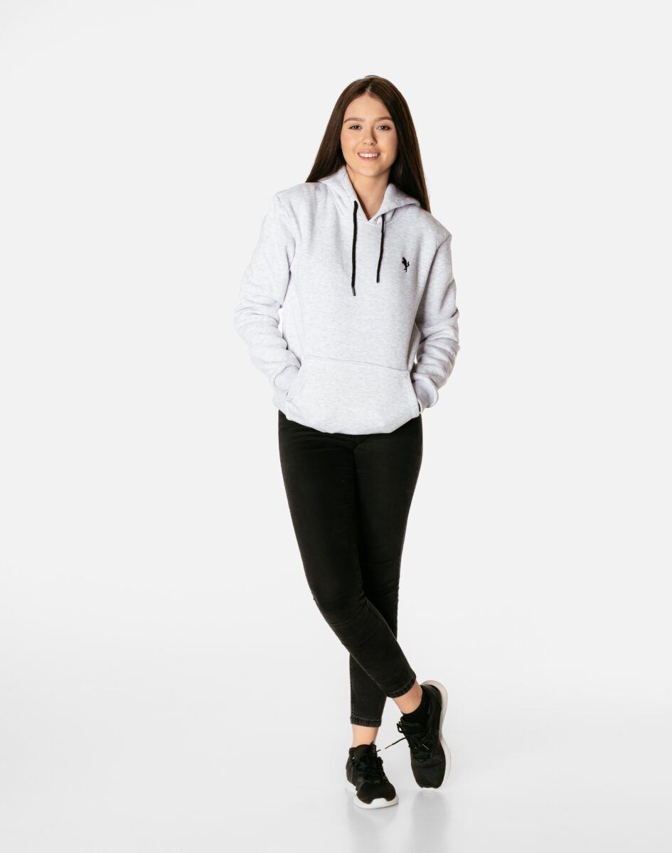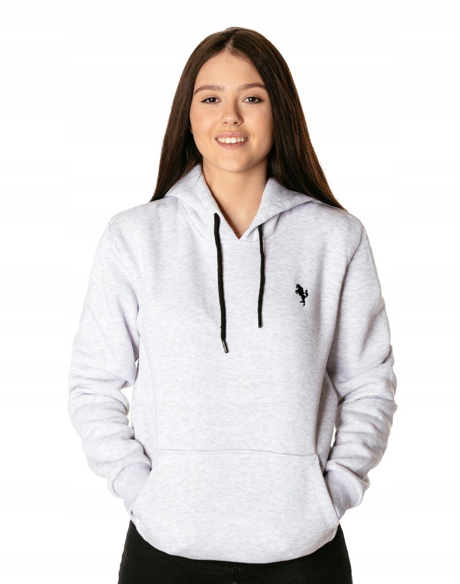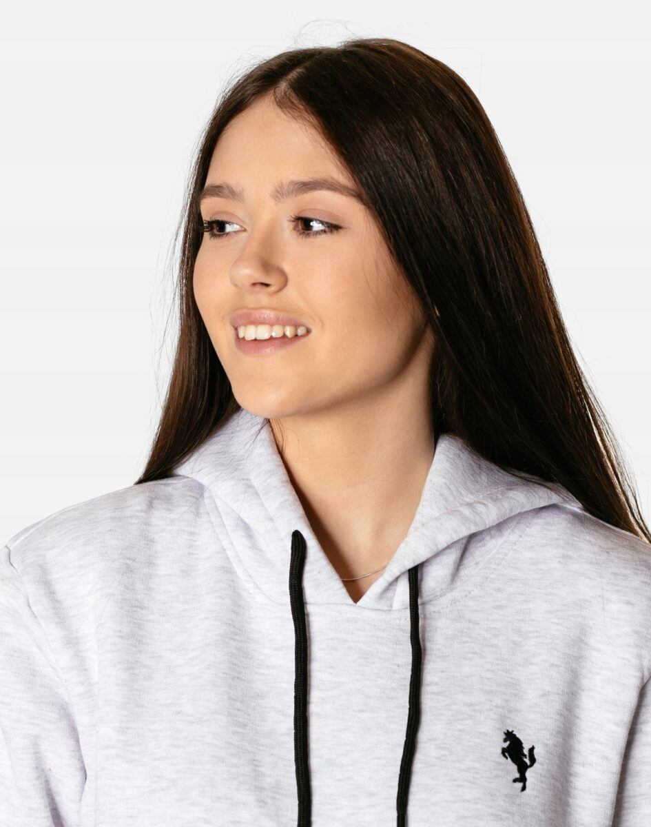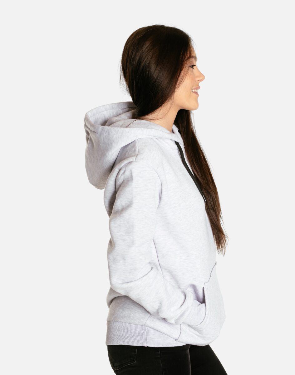 Sportowa bluza damska typu kangurka wyprodukowana z ciepłej dzianiny wiskozowej, zapewniającej maksymalną wygodę i komfort użytkowania. Wiskoza jest przewiewna i lekka produkowana jest z włókien celulozy, co sprawia iż gwarantuje ona dobre właściwości higroskopijne, wspaniałą izolację cieplną, świetnie pochłania pot i wodę i odprowadza je z powierzchni skóry. To z kolei sprawia, iż wilgotne ubrania nie przywierają do ciała i pozwalają skórze oddychać. Sam materiał nie uczula i odznacza się dużą miękkością. Wysoka jakość zastosowanej do produkcji dzianiny to także gwarancja pełnej swobody ruchów oraz stabilności rozmiarów i kolorów po wielokrotnym praniu. Klasyczna, gładka, wkładana przez głowę, posiada podwójną wygodną kieszeń tak zwaną „kangurkę” i zintegrowany kaptur z możliwością regulacji wielkości i dopasowania taśmowym ściągaczem. Ergonomiczny krój bluzy nie ogranicza swobody ruchów co wpływa pozytywnie na wygodę użytkowania.