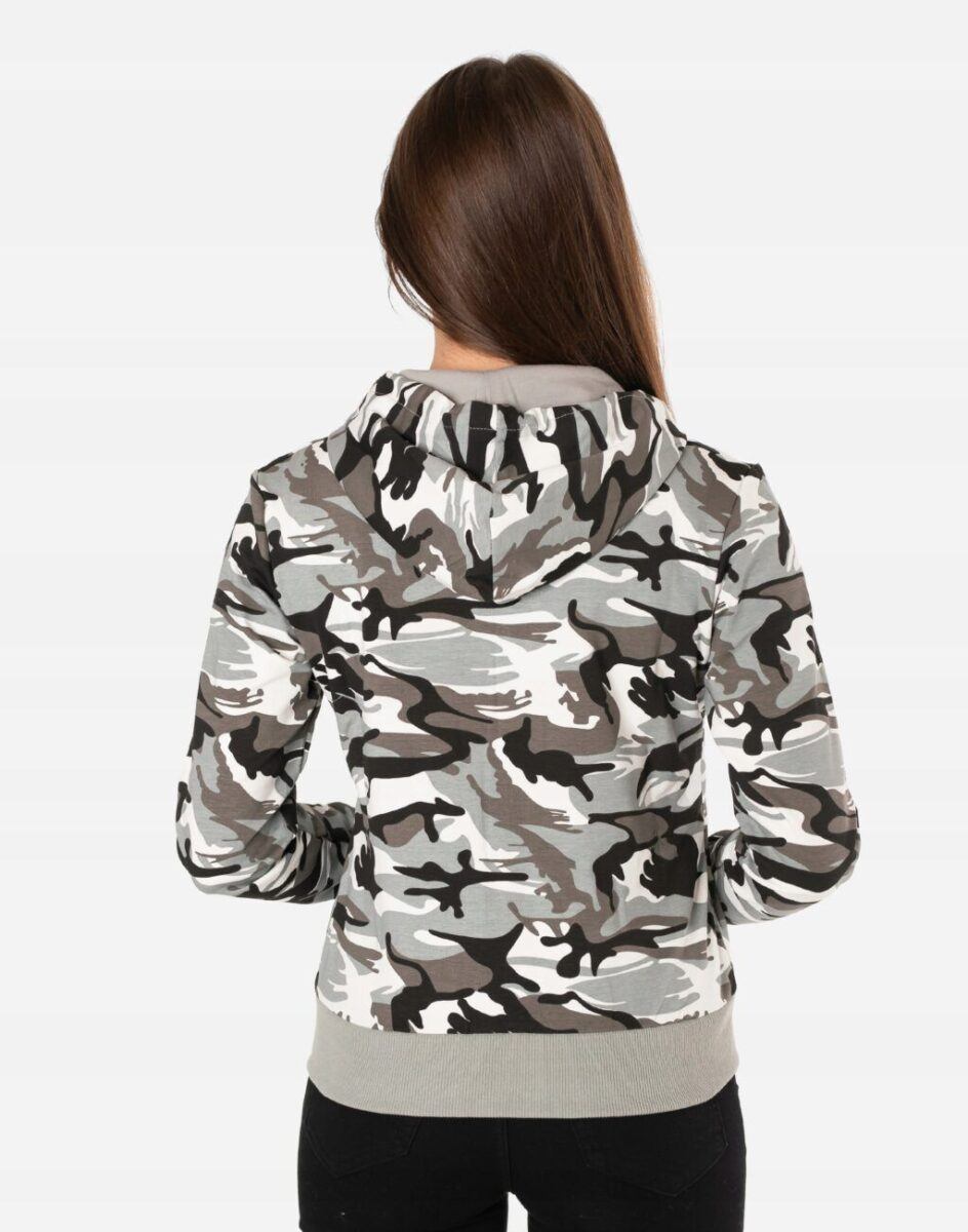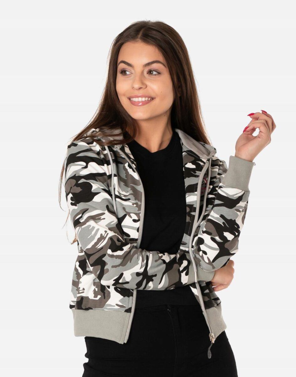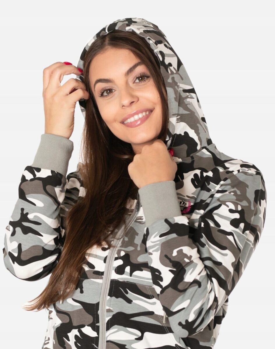 Sportowa damska bluza bawełniana moro, uszyta z cienkiej dzianiny dresowej z dodatkiem elastanu. Naturalna bawełna gwarantuje wchłanianie potu i oddychanie skóry, a sam materiał odznacza się dużą oddychalnością „Dry-Fit”. Dodatek elastanu to gwarancja pełnej swobody ruchów oraz stabilności rozmiarów i koloru po wielokrotnym praniu. Bluza zasuwana jest w całości na zamek błyskawiczny, posiada dwie przednie kieszenie na dłonie oraz zintegrowany kaptur z możliwością regulacji jego wielkości i dopasowania. Dół bluzy oraz rękawy wykończone szerokim elastycznym ściągaczem. Zewnętrzna powierzchnia bluzy jest ozdobiona w deseń inspirowany wojskowym wzorem moro CAMO, który znają wszyscy na świecie. Ten charakterystyczny wzór jest uwielbiany przez fanów i fanki militarnego stylu ubierania. Możesz w niej chodzić na co dzień, idealnie nadaje się również do uprawiania różnych dyscyplin sportu i rekreacji.