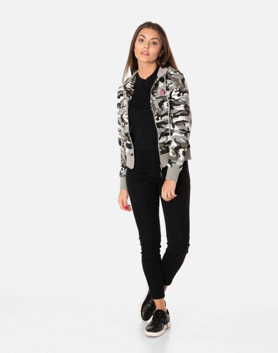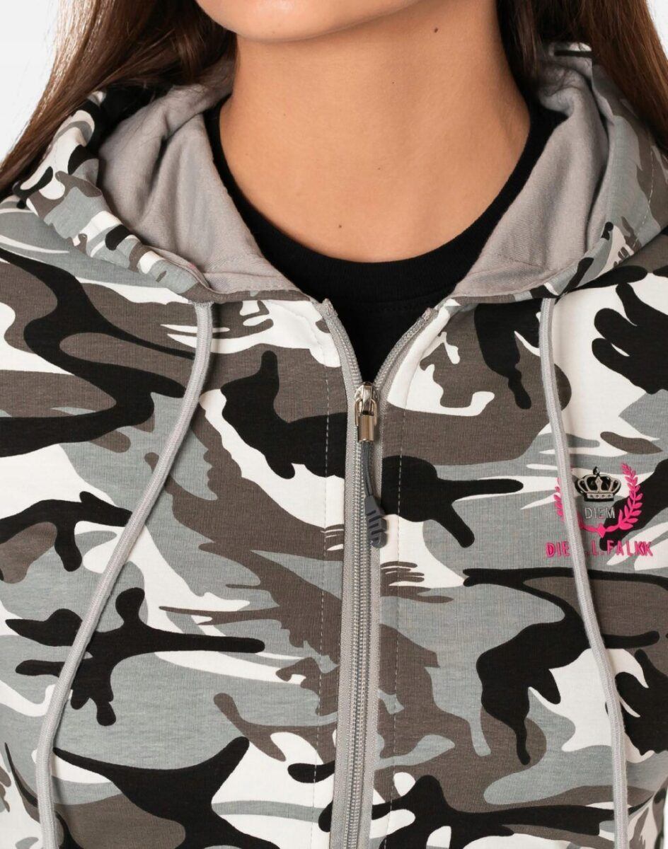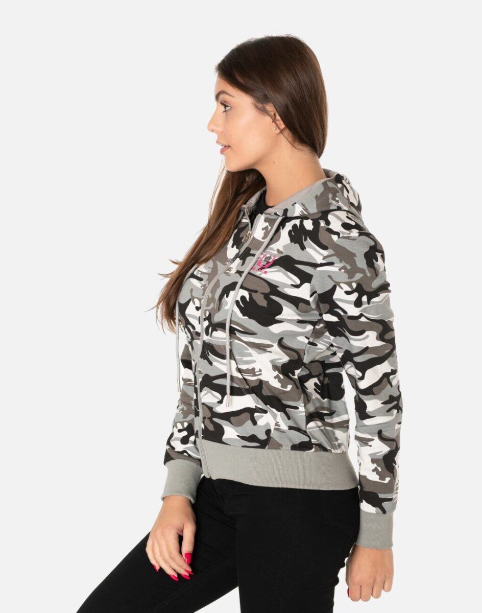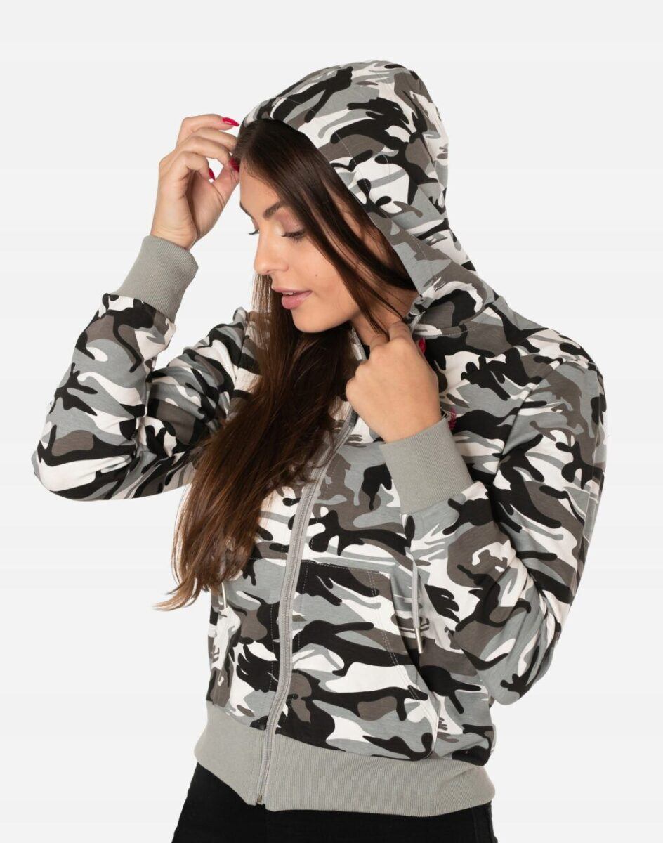 Sportowa damska bluza bawełniana moro, uszyta z cienkiej dzianiny dresowej z dodatkiem elastanu. Naturalna bawełna gwarantuje wchłanianie potu i oddychanie skóry, a sam materiał odznacza się dużą oddychalnością „Dry-Fit”. Dodatek elastanu to gwarancja pełnej swobody ruchów oraz stabilności rozmiarów i koloru po wielokrotnym praniu. Bluza zasuwana jest w całości na zamek błyskawiczny, posiada dwie przednie kieszenie na dłonie oraz zintegrowany kaptur z możliwością regulacji jego wielkości i dopasowania. Dół bluzy oraz rękawy wykończone szerokim elastycznym ściągaczem. Zewnętrzna powierzchnia bluzy jest ozdobiona w deseń inspirowany wojskowym wzorem moro CAMO, który znają wszyscy na świecie. Ten charakterystyczny wzór jest uwielbiany przez fanów i fanki militarnego stylu ubierania. Możesz w niej chodzić na co dzień, idealnie nadaje się również do uprawiania różnych dyscyplin sportu i rekreacji.
