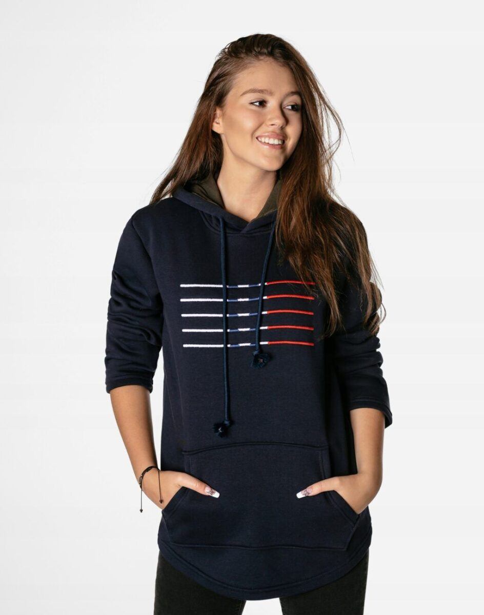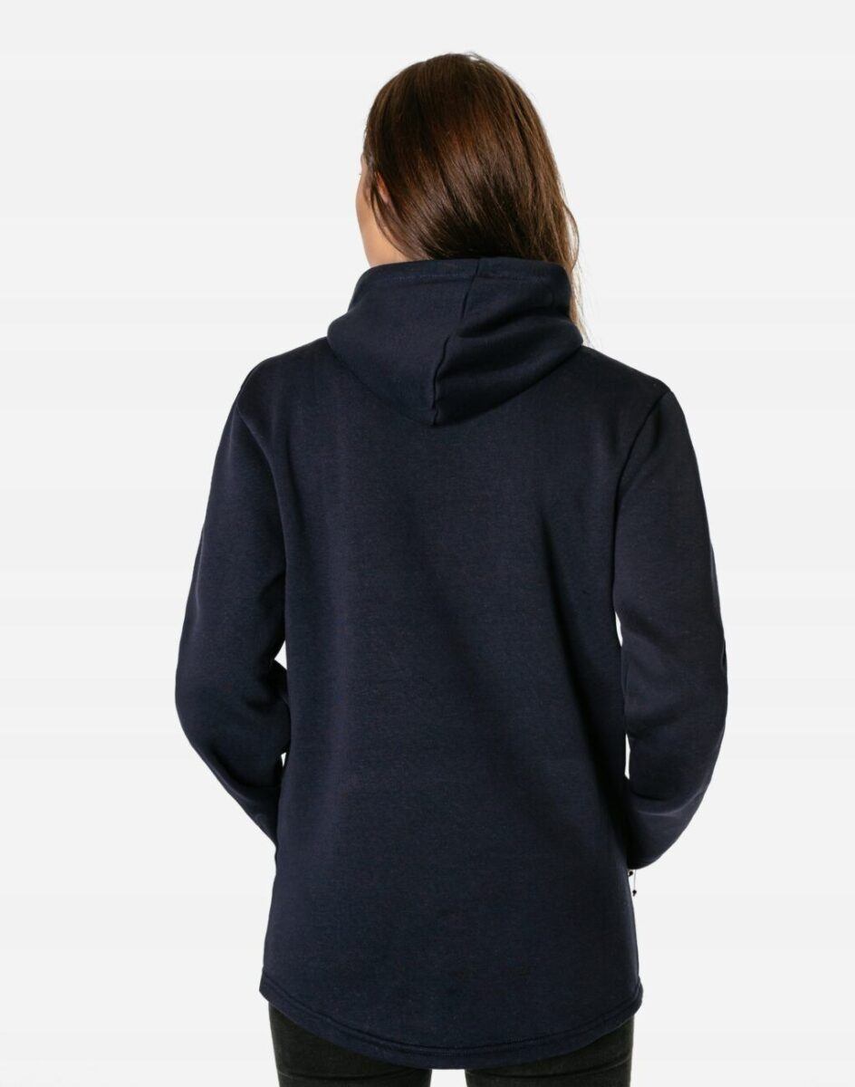 Sportowa bluza damska typu kangurka wyprodukowana z dzianiny bawełnianej z niewielkim dodatkiem lycry, zapewniającej maksymalną wygodę i komfort użytkowania. Naturalna bawełna gwarantuje wspaniałą izolację cieplną, wchłanianie potu i oddychanie skóry, a sam materiał odznacza się dużą miękkością. Wysoka jakość zastosowanej do produkcji dzianiny z niewielkim dodatkiem lycry to gwarancja pełnej swobody ruchów oraz stabilności rozmiarów i kolorów po wielokrotnym praniu. Klasyczna, gładka, wkładana przez głowę, przodem i tyłem dłuższa, bokami krótsza. Bluza posiada podwójną wygodną kieszeń tak zwaną „kangurkę” i zintegrowany kaptur z możliwością regulacji wielkości i dopasowania taśmowym ściągaczem. Ergonomiczny krój bluzy nie ogranicza swobody ruchów co wpływa pozytywnie na wygodę użytkowania.