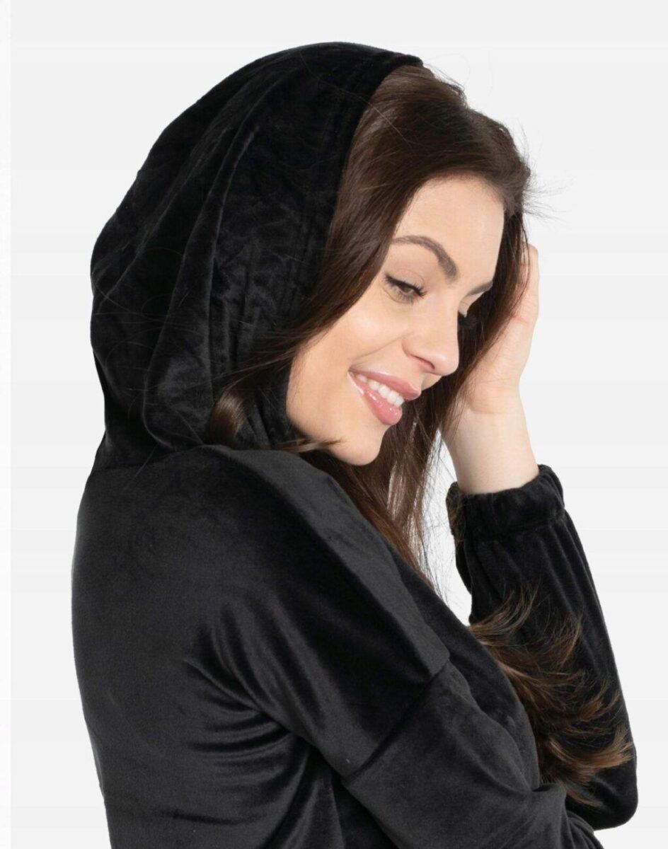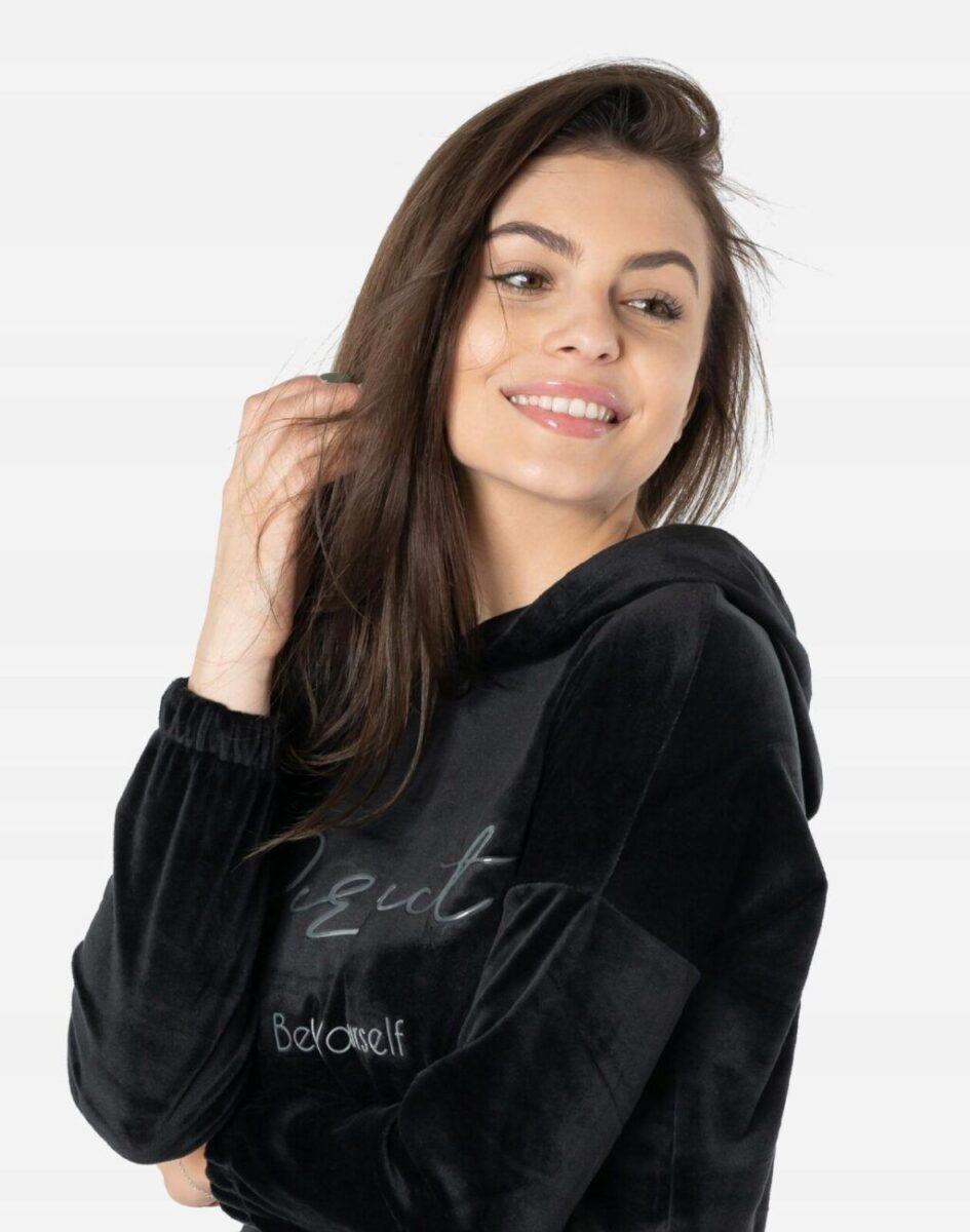 Jeśli kochasz swobodny i niezobowiązujący styl ze sportową nutą to ten wygodny komplet dresowy składający się z bluzy z kapturem i wygodnych sportowych spodni z lekko zwężaną nogawką zakończoną ściągaczem będzie dla Ciebie strzałem w dziesiątkę. Wykonany z miękkiej, przyjemnej w dotyku i odpornej na zmechacenie dzianiny welurowej z delikatnym włoskiem, zapewniającej wygodę oraz miękkie otulenie. Zastosowany materiał jest oddychający, odporny na promieniowanie UV, elastyczny, rozciągliwy w czterech kierunkach, idealnie dopasowuje się i jest bardzo komfortowy. Ergonomiczny krój spodni i bluzy nie ogranicza swobody ruchów, a odpowiednia dla odzieży sportowej gramatura wpływa pozytywnie na komfort użytkowania. Zastosowany welur będący synonimem miękkości, zdobył aprobatę tysięcy zadowolonych klientek i uznawany jest za jeden z najlepszych do produkcji sportowej odzieży damskiej.