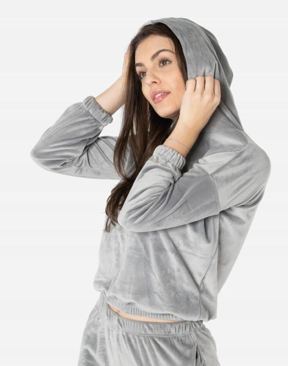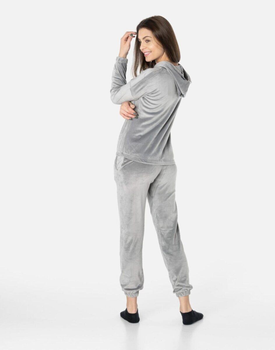 Jeśli kochasz swobodny i niezobowiązujący styl ze sportową nutą to ten wygodny komplet dresowy składający się z bluzy z kapturem i wygodnych sportowych spodni z lekko zwężaną nogawką zakończoną ściągaczem będzie dla Ciebie strzałem w dziesiątkę. Wykonany z miękkiej, przyjemnej w dotyku i odpornej na zmechacenie dzianiny welurowej z delikatnym włoskiem, zapewniającej wygodę oraz miękkie otulenie. Zastosowany materiał jest oddychający, odporny na promieniowanie UV, elastyczny, rozciągliwy w czterech kierunkach, idealnie dopasowuje się i jest bardzo komfortowy. Ergonomiczny krój spodni i bluzy nie ogranicza swobody ruchów, a odpowiednia dla odzieży sportowej gramatura wpływa pozytywnie na komfort użytkowania. Zastosowany welur będący synonimem miękkości, zdobył aprobatę tysięcy zadowolonych klientek i uznawany jest za jeden z najlepszych do produkcji sportowej odzieży damskiej.