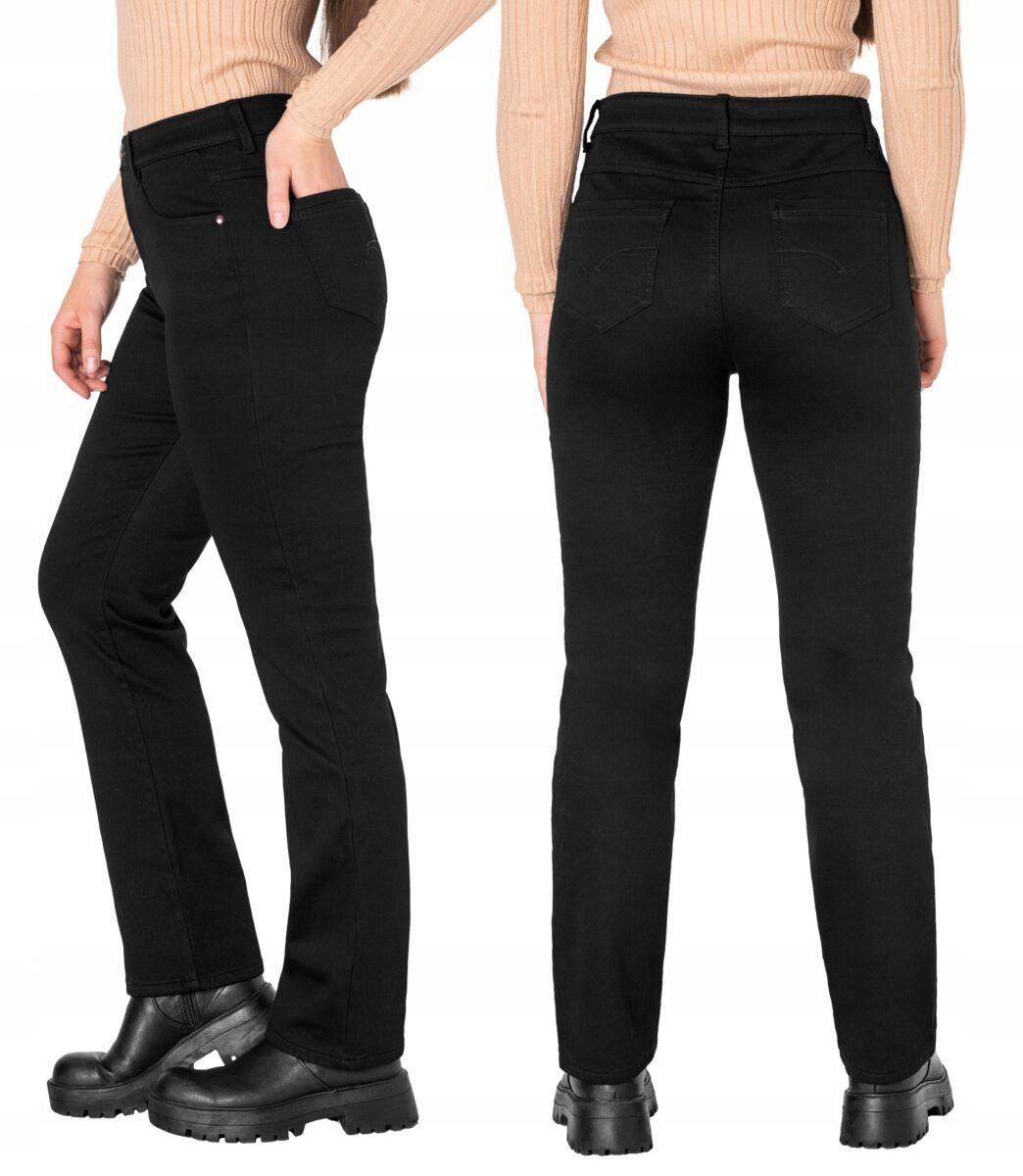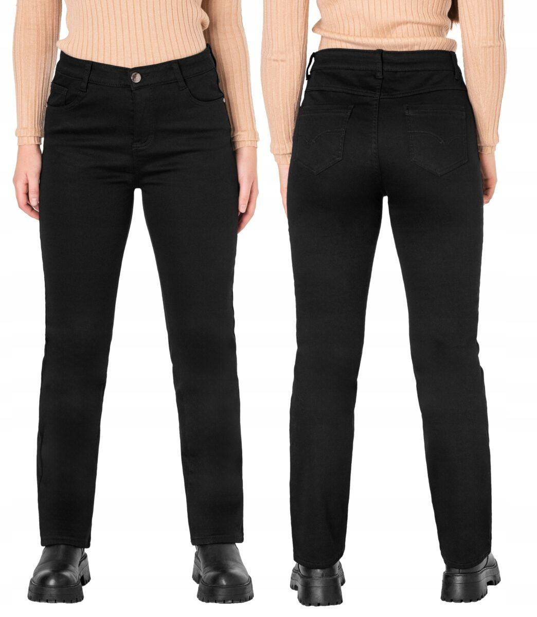 Ciepłe spodnie jeansowe damskie w kolorze czarnym „Super Black” na jesień/zimę ocieplone od wewnętrznej strony polarem, z klasycznymi prostymi nogawkami i wyszczuplającym optycznie kobiecą sylwetkę fasonie i wyższym stanie. Zapinane są na kryty zamek błyskawiczny i metalowy guzik sygnowany logiem firmy. Z przodu mają dwie kieszonki zaokrąglone oraz mniejszą kieszonkę tzw. bilonówkę, a na tyle klasyczne kieszenie naszywane jak w typowych spodniach jeansowych. W pasie szlufki umożliwiające stylizacje z paskiem. Wykonane z wysokiej jakości, trwałej i mocnej, delikatnie elastycznej tkaniny bawełnianej o jednolitym czarnym wybarwieniu. Niewielki dodatek elastanu (lycra) sprawia, że spodnie są bardziej elastyczne, dobrze dopasowują się do sylwetki, i są bardzo komfortowe w użytkowaniu. Łatwo się je zakłada i są znacznie wygodniejsze od spodni, które lycry nie mają. Poza tym bawełna ma tendencję do kurczenia się w praniu, dlatego lycra sprawia, że spodnie są wyjątkowo praktyczne i można je bez problemu założyć po wysuszeniu. Pozwalają na pełną swobodę ruchów, co daje wygodę przy siadaniu i zapewnia ogromny komfort noszenia.