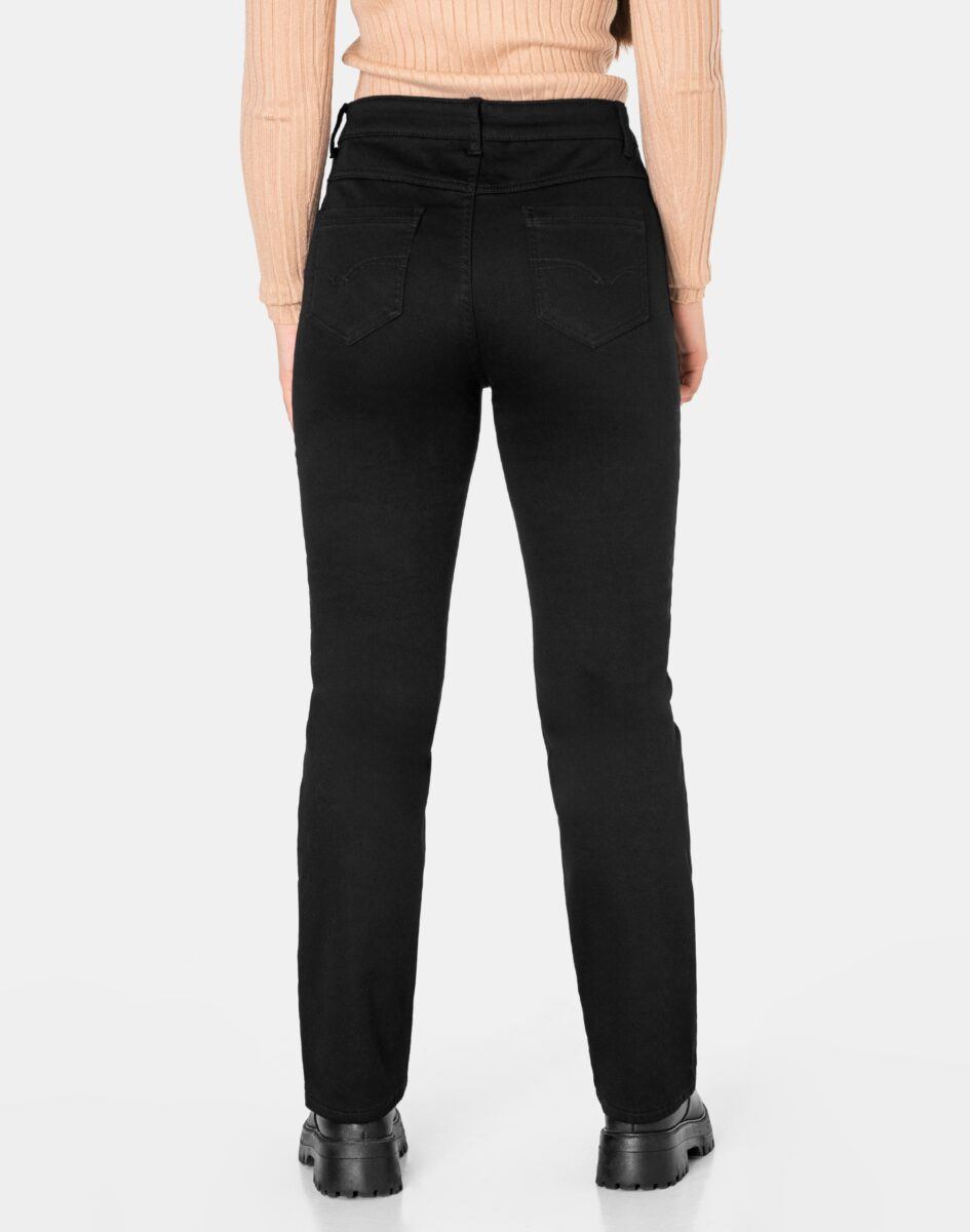 Ciepłe spodnie jeansowe damskie w kolorze czarnym „Super Black” na jesień/zimę ocieplone od wewnętrznej strony polarem, z klasycznymi prostymi nogawkami i wyszczuplającym optycznie kobiecą sylwetkę fasonie i wyższym stanie. Zapinane są na kryty zamek błyskawiczny i metalowy guzik sygnowany logiem firmy. Z przodu mają dwie kieszonki zaokrąglone oraz mniejszą kieszonkę tzw. bilonówkę, a na tyle klasyczne kieszenie naszywane jak w typowych spodniach jeansowych. W pasie szlufki umożliwiające stylizacje z paskiem. Wykonane z wysokiej jakości, trwałej i mocnej, delikatnie elastycznej tkaniny bawełnianej o jednolitym czarnym wybarwieniu. Niewielki dodatek elastanu (lycra) sprawia, że spodnie są bardziej elastyczne, dobrze dopasowują się do sylwetki, i są bardzo komfortowe w użytkowaniu. Łatwo się je zakłada i są znacznie wygodniejsze od spodni, które lycry nie mają. Poza tym bawełna ma tendencję do kurczenia się w praniu, dlatego lycra sprawia, że spodnie są wyjątkowo praktyczne i można je bez problemu założyć po wysuszeniu. Pozwalają na pełną swobodę ruchów, co daje wygodę przy siadaniu i zapewnia ogromny komfort noszenia.