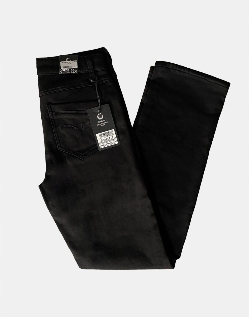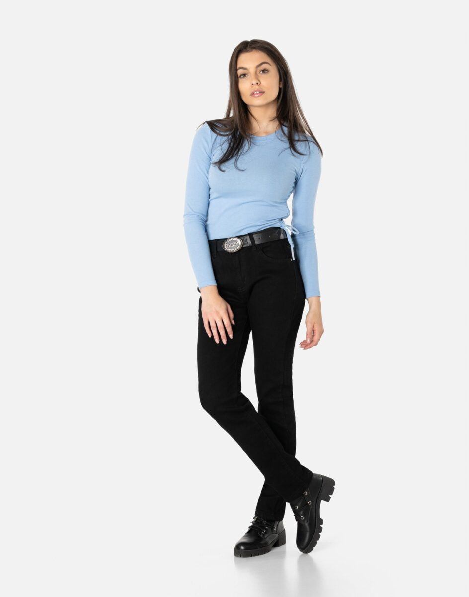 Ciepłe spodnie jeansowe damskie w kolorze czarnym „Super Black” na jesień/zimę ocieplone od wewnętrznej strony polarem, z klasycznymi prostymi nogawkami i wyszczuplającym optycznie kobiecą sylwetkę fasonie i wyższym stanie. Zapinane są na kryty zamek błyskawiczny i metalowy guzik sygnowany logiem firmy. Z przodu mają dwie kieszonki zaokrąglone oraz mniejszą kieszonkę tzw. bilonówkę, a na tyle klasyczne kieszenie naszywane jak w typowych spodniach jeansowych. W pasie szlufki umożliwiające stylizacje z paskiem. Najbardziej podatne na uszkodzenia miejsca wzmocnione są dodatkowymi przeszyciami oraz ozdobnymi nitami. Uszyte z mocnego denimu z niewielkim dodatkiem lycry (elastan) dzięki czemu spodnie są bardziej elastyczne co pozwala na pełną swobodę ruchów, daje komfort przy siadaniu i zapewnia ogromny komfort noszenia.