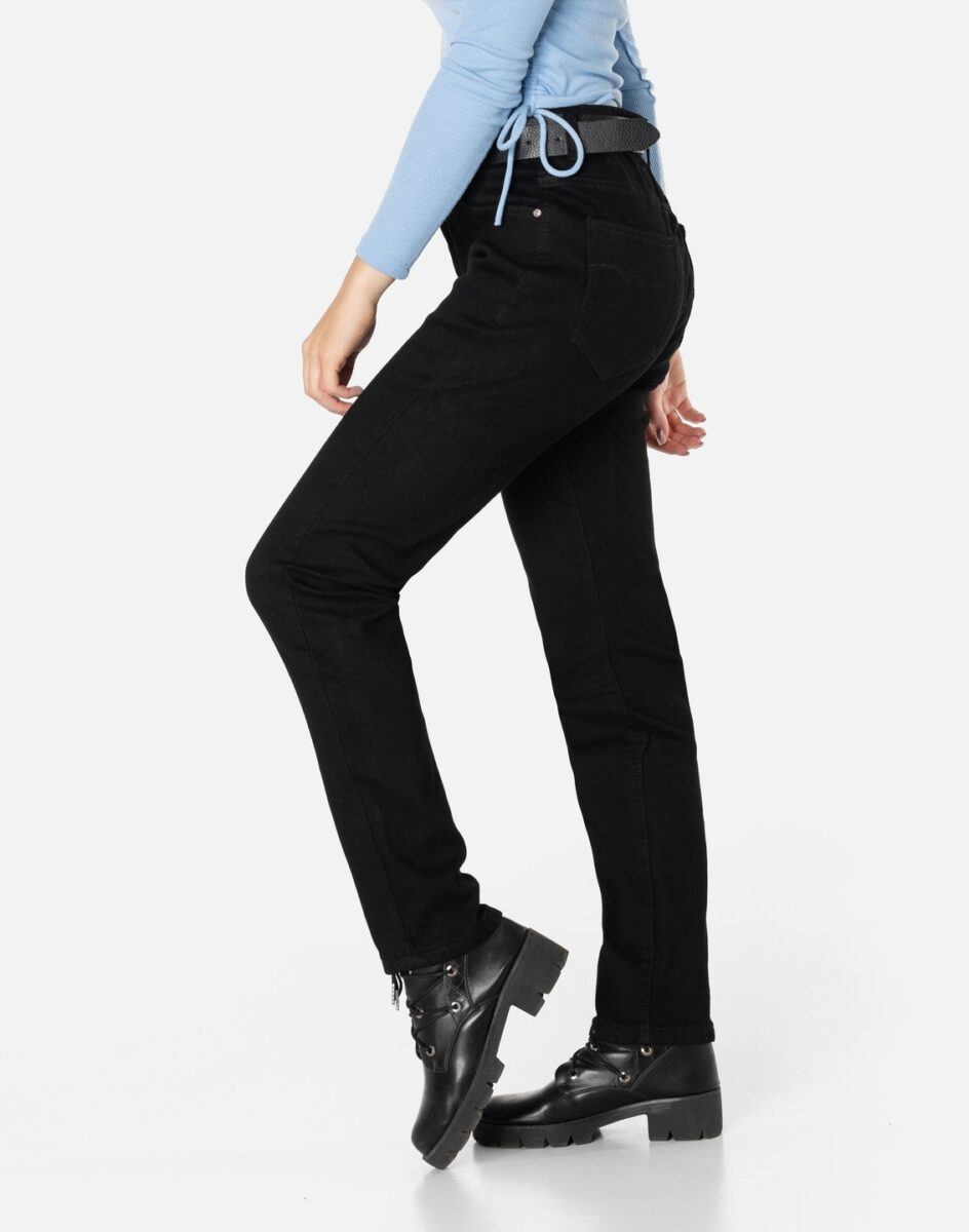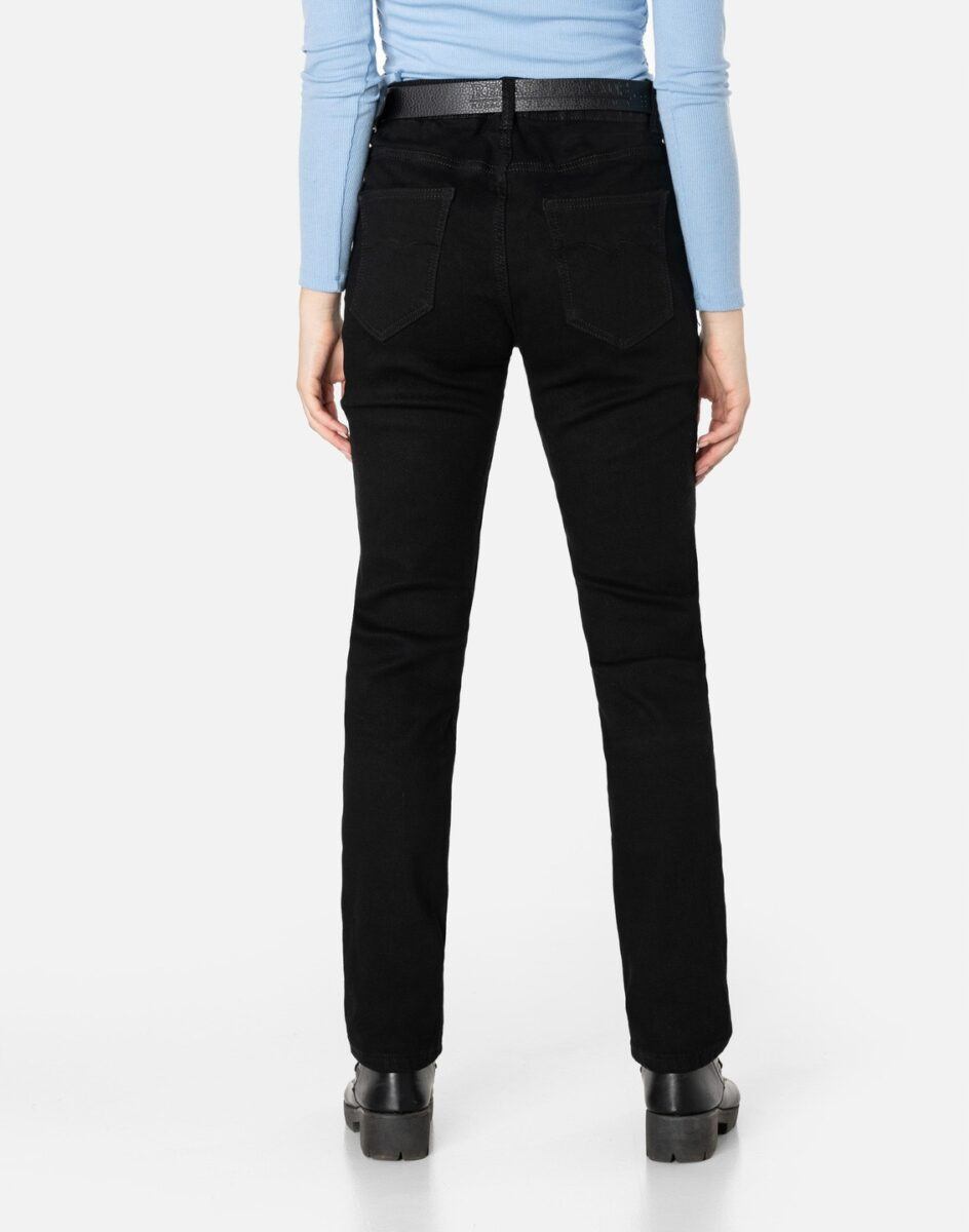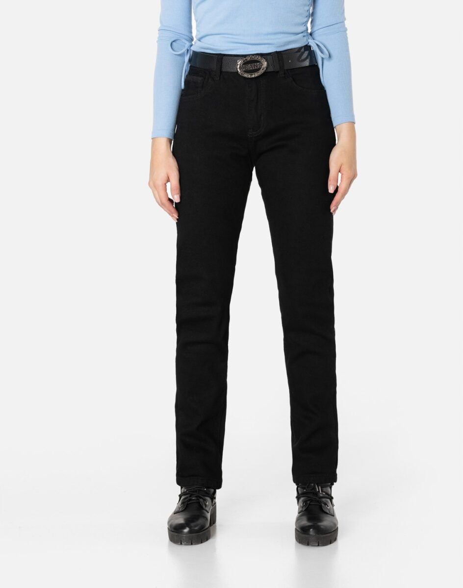 Ciepłe spodnie jeansowe damskie w kolorze czarnym „Super Black” na jesień/zimę ocieplone od wewnętrznej strony polarem, z klasycznymi prostymi nogawkami i wyszczuplającym optycznie kobiecą sylwetkę fasonie i wyższym stanie. Zapinane są na kryty zamek błyskawiczny i metalowy guzik sygnowany logiem firmy. Z przodu mają dwie kieszonki zaokrąglone oraz mniejszą kieszonkę tzw. bilonówkę, a na tyle klasyczne kieszenie naszywane jak w typowych spodniach jeansowych. W pasie szlufki umożliwiające stylizacje z paskiem. Najbardziej podatne na uszkodzenia miejsca wzmocnione są dodatkowymi przeszyciami oraz ozdobnymi nitami. Uszyte z mocnego denimu z niewielkim dodatkiem lycry (elastan) dzięki czemu spodnie są bardziej elastyczne co pozwala na pełną swobodę ruchów, daje komfort przy siadaniu i zapewnia ogromny komfort noszenia.