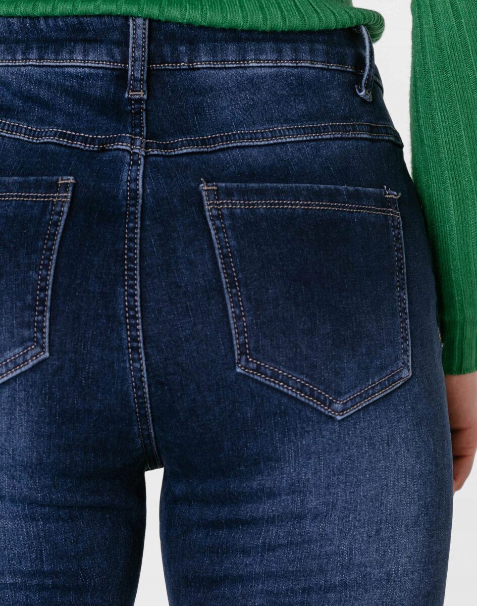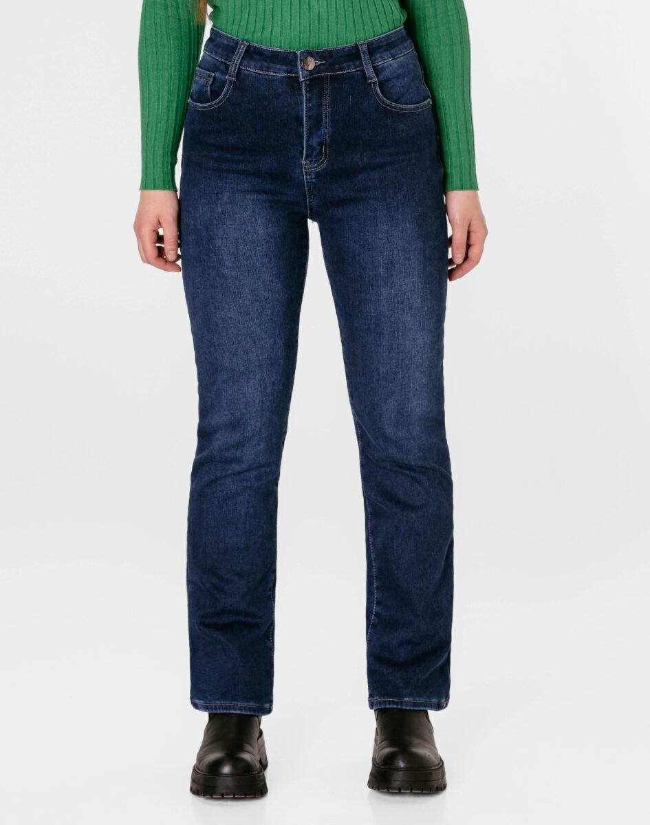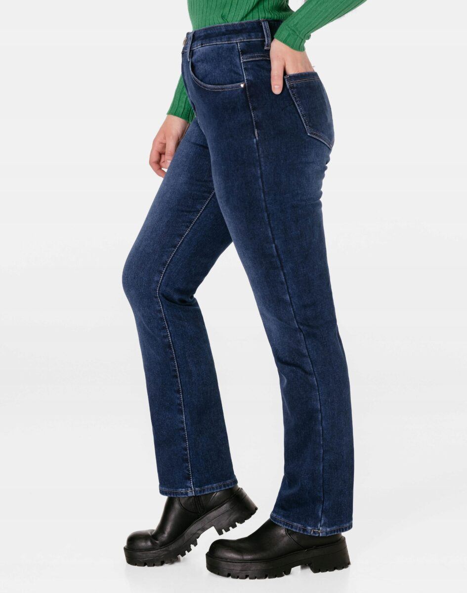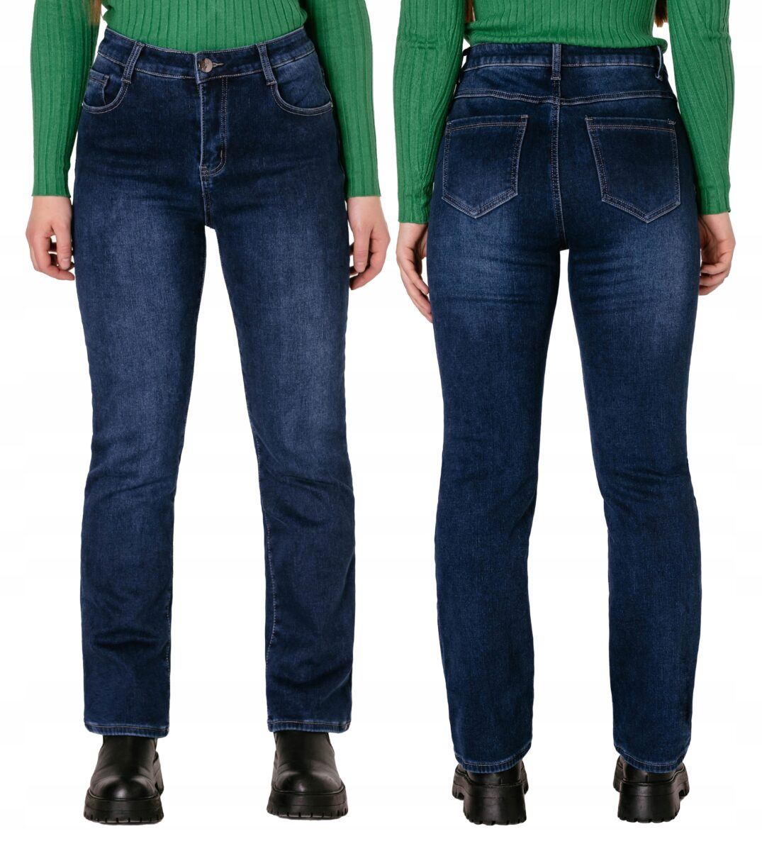 Ciepłe spodnie jeansowe damskie w kolorze granatowym "Dark Blue" na jesień/zimę ocieplone od wewnętrznej strony polarem, z klasycznymi prostymi nogawkami i wyszczuplającym optycznie kobiecą sylwetkę fasonie i wyższym stanie. Zapinane są na kryty zamek błyskawiczny i metalowy guzik sygnowany logiem firmy. Z przodu mają dwie kieszonki zaokrąglone oraz mniejszą kieszonkę tzw. bilonówkę, a na tyle klasyczne kieszenie naszywane jak w typowych spodniach jeansowych. W pasie szlufki umożliwiające stylizacje z paskiem. Wykonane z wysokiej jakości, trwałej i mocnej, delikatnie elastycznej tkaniny bawełnianej o granatowym wybarwieniu z delikatnymi przetarciami. Niewielki dodatek elastanu (lycra) sprawia, że spodnie są bardziej elastyczne, dobrze dopasowują się do sylwetki, i są bardzo komfortowe w użytkowaniu. Łatwo się je zakłada i są znacznie wygodniejsze od spodni, które lycry nie mają. Poza tym bawełna ma tendencję do kurczenia się w praniu, dlatego lycra sprawia, że spodnie są wyjątkowo praktyczne i można je bez problemu założyć po wysuszeniu. Pozwalają na pełną swobodę ruchów, co daje wygodę przy siadaniu i zapewnia ogromny komfort noszenia.