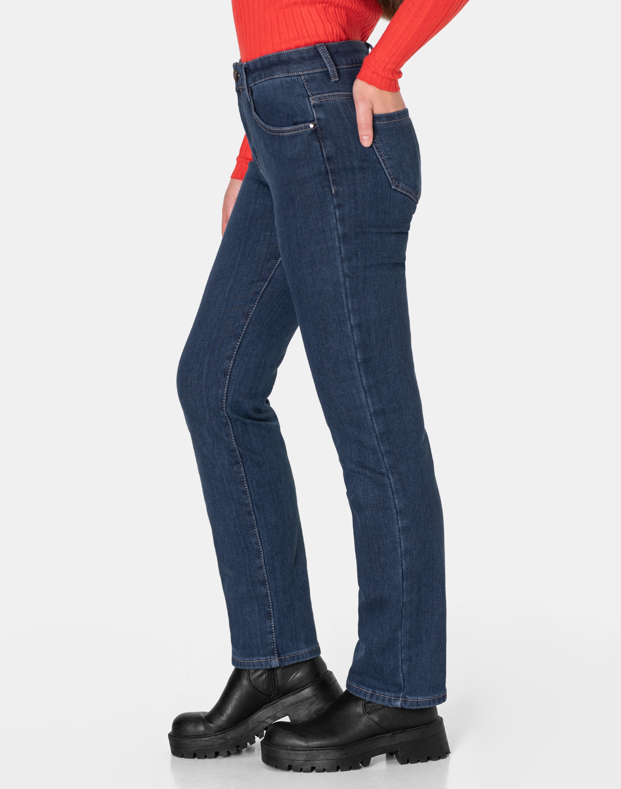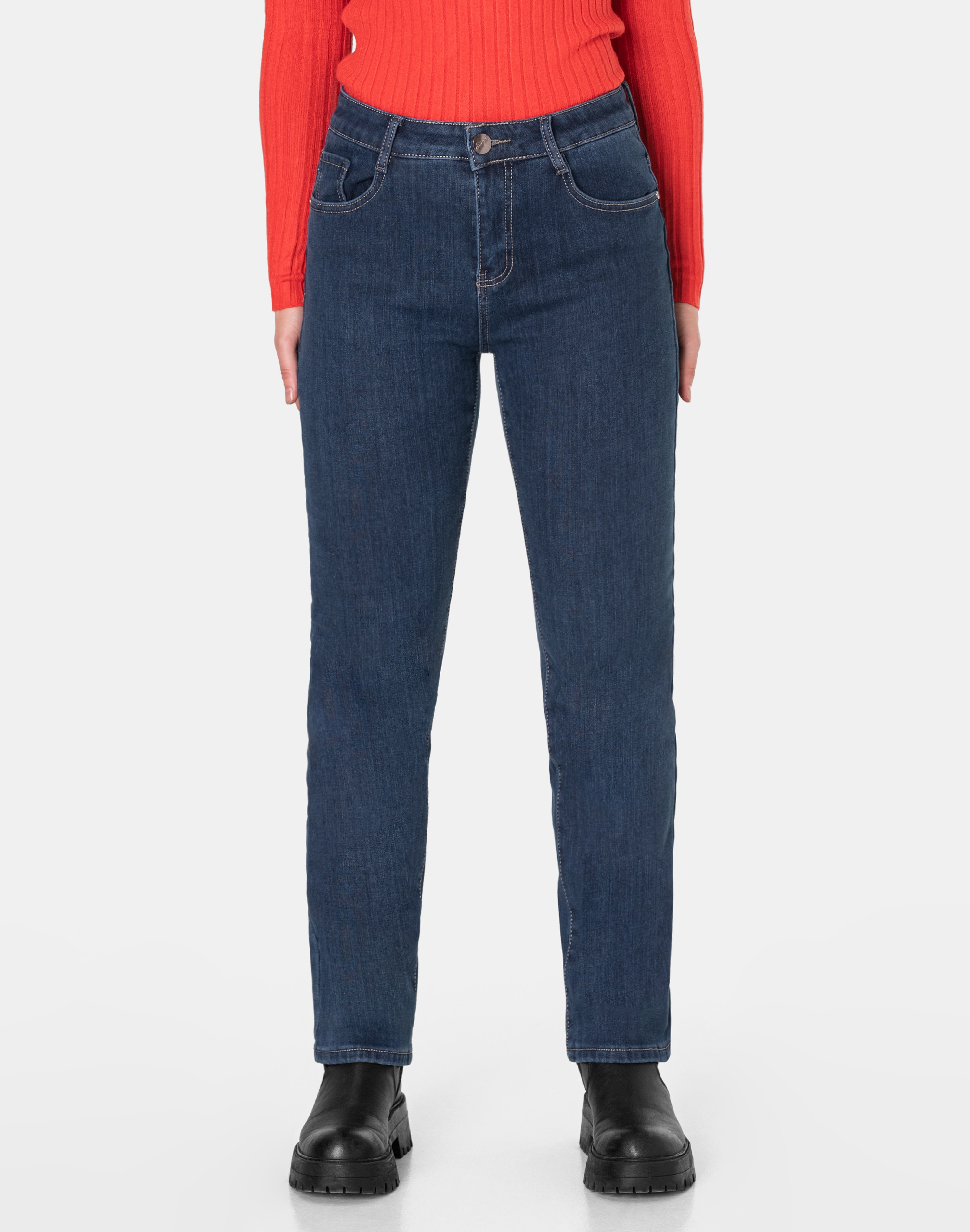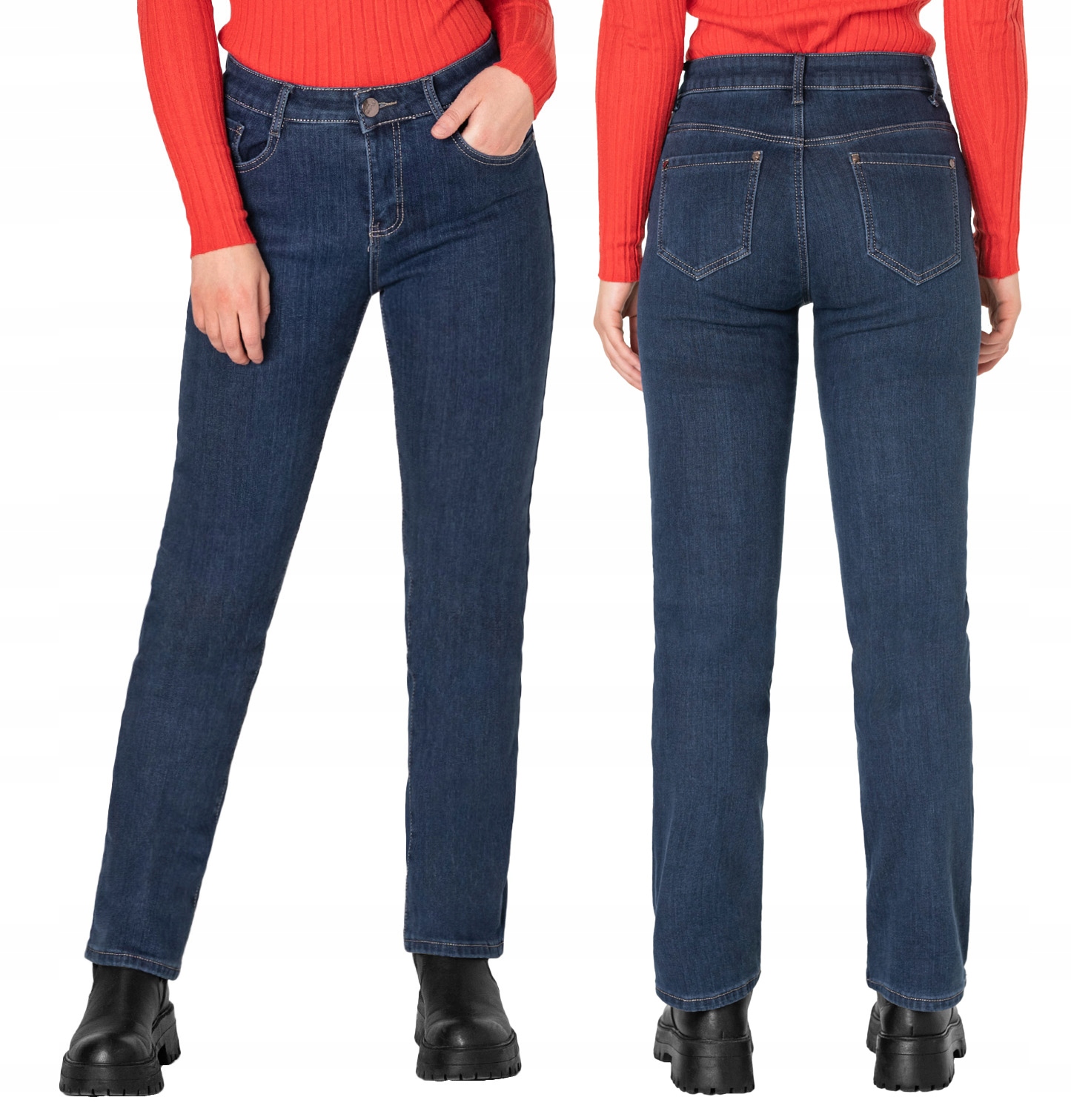 Ciepłe spodnie jeansowe damskie w kolorze granatowym "Dark Blue" na jesień/zimę ocieplone od wewnętrznej strony polarem, z klasycznymi prostymi nogawkami Regular Fit i wyszczuplającym optycznie kobiecą sylwetkę fasonie i wyższym stanie. Zapinane są na kryty zamek błyskawiczny i metalowy guzik sygnowany logiem firmy. Z przodu mają dwie kieszonki zaokrąglone oraz mniejszą kieszonkę tzw. bilonówkę, a na tyle klasyczne kieszenie naszywane jak w typowych spodniach jeansowych. W pasie szlufki umożliwiające stylizacje z paskiem. Wykonane z wysokiej jakości, trwałej i mocnej, delikatnie elastycznej tkaniny bawełnianej o jednolitym granatowym wybarwieniu. Niewielki dodatek elastanu (lycra) sprawia, że spodnie są bardziej elastyczne, dobrze dopasowują się do sylwetki, i są bardzo komfortowe w użytkowaniu. Łatwo się je zakłada i są znacznie wygodniejsze od spodni, które lycry nie mają. Poza tym bawełna ma tendencję do kurczenia się w praniu, dlatego lycra sprawia, że spodnie są wyjątkowo praktyczne i można je bez problemu założyć po wysuszeniu. Pozwalają na pełną swobodę ruchów, co daje wygodę przy siadaniu i zapewnia ogromny komfort noszenia.