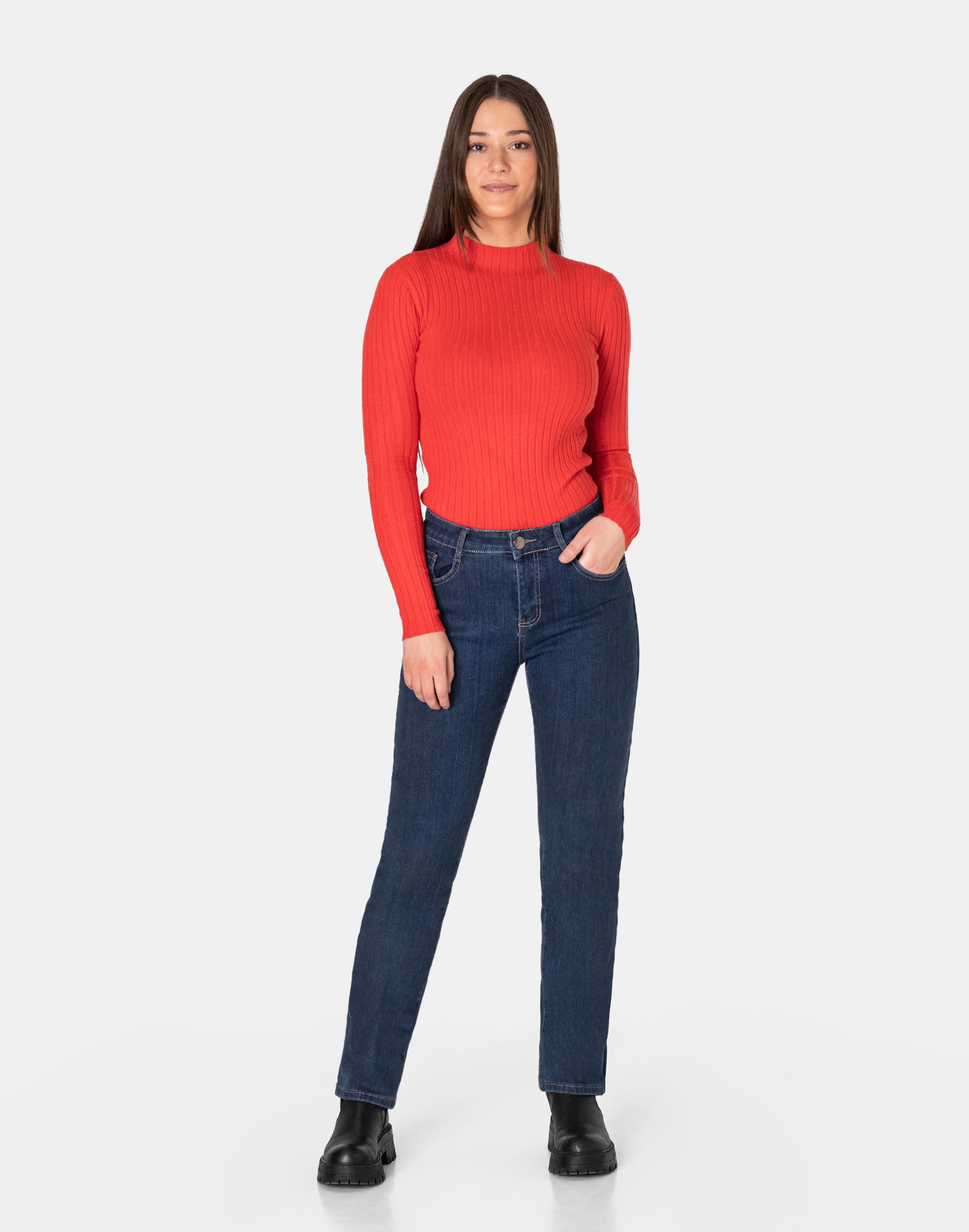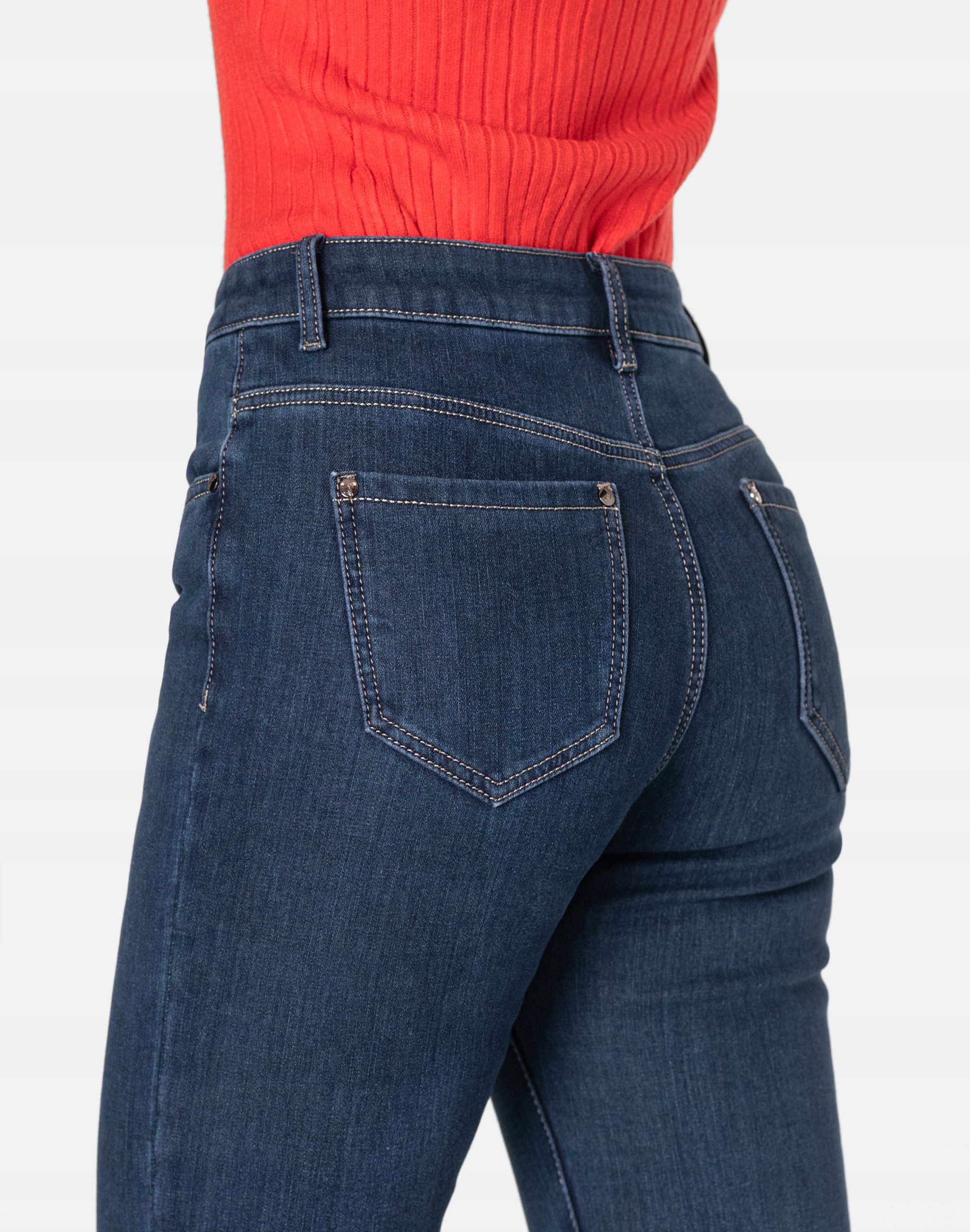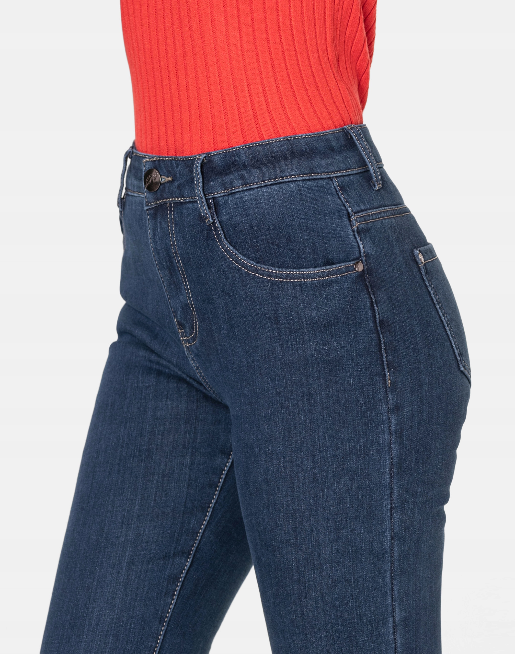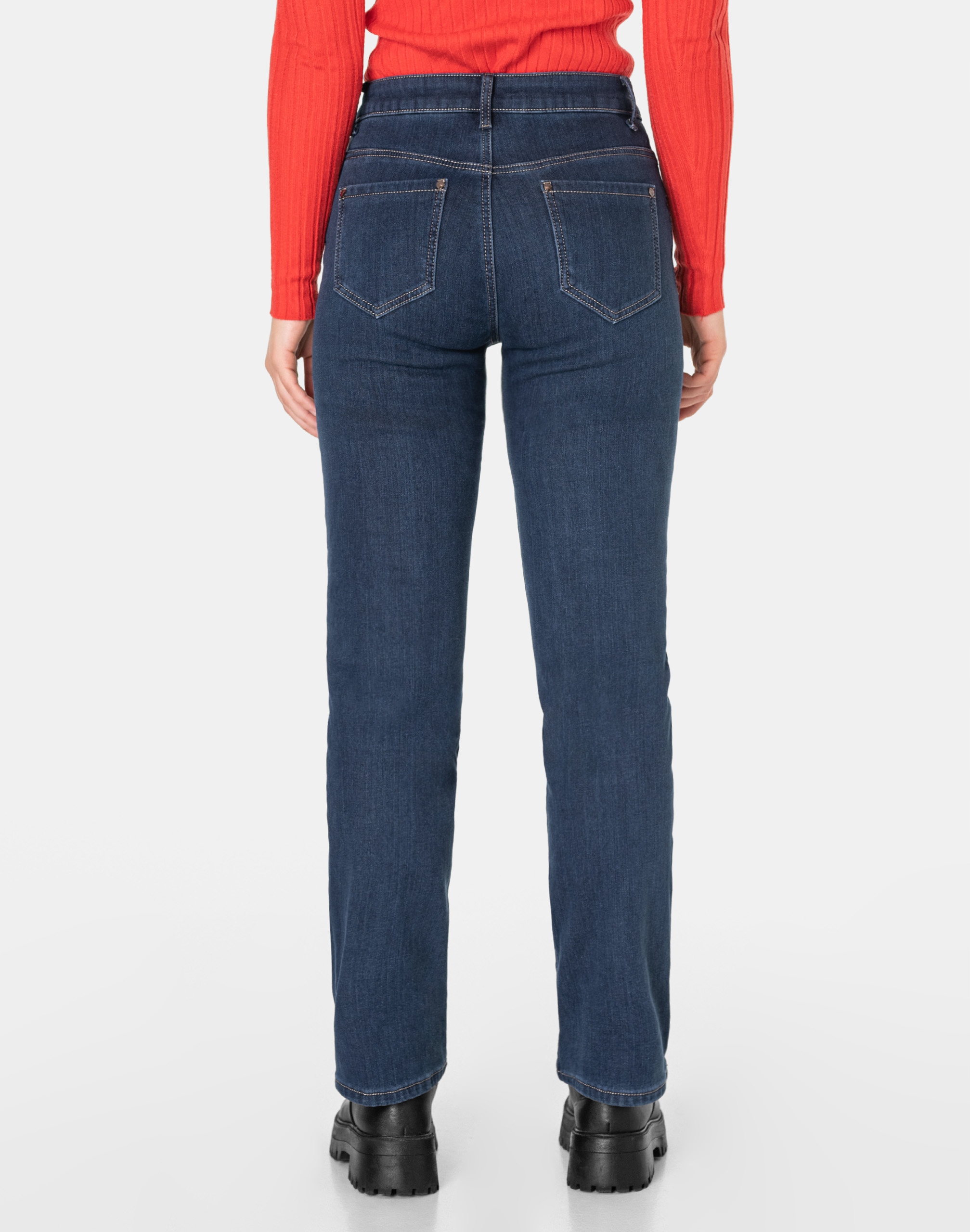 Ciepłe spodnie jeansowe damskie w kolorze granatowym "Dark Blue" na jesień/zimę ocieplone od wewnętrznej strony polarem, z klasycznymi prostymi nogawkami Regular Fit i wyszczuplającym optycznie kobiecą sylwetkę fasonie i wyższym stanie. Zapinane są na kryty zamek błyskawiczny i metalowy guzik sygnowany logiem firmy. Z przodu mają dwie kieszonki zaokrąglone oraz mniejszą kieszonkę tzw. bilonówkę, a na tyle klasyczne kieszenie naszywane jak w typowych spodniach jeansowych. W pasie szlufki umożliwiające stylizacje z paskiem. Wykonane z wysokiej jakości, trwałej i mocnej, delikatnie elastycznej tkaniny bawełnianej o jednolitym granatowym wybarwieniu. Niewielki dodatek elastanu (lycra) sprawia, że spodnie są bardziej elastyczne, dobrze dopasowują się do sylwetki, i są bardzo komfortowe w użytkowaniu. Łatwo się je zakłada i są znacznie wygodniejsze od spodni, które lycry nie mają. Poza tym bawełna ma tendencję do kurczenia się w praniu, dlatego lycra sprawia, że spodnie są wyjątkowo praktyczne i można je bez problemu założyć po wysuszeniu. Pozwalają na pełną swobodę ruchów, co daje wygodę przy siadaniu i zapewnia ogromny komfort noszenia.