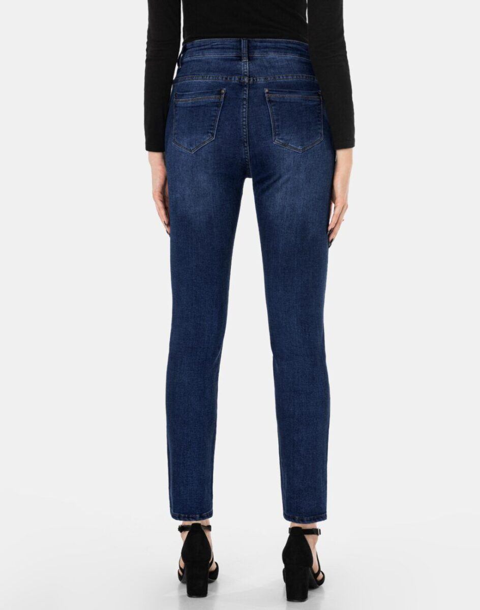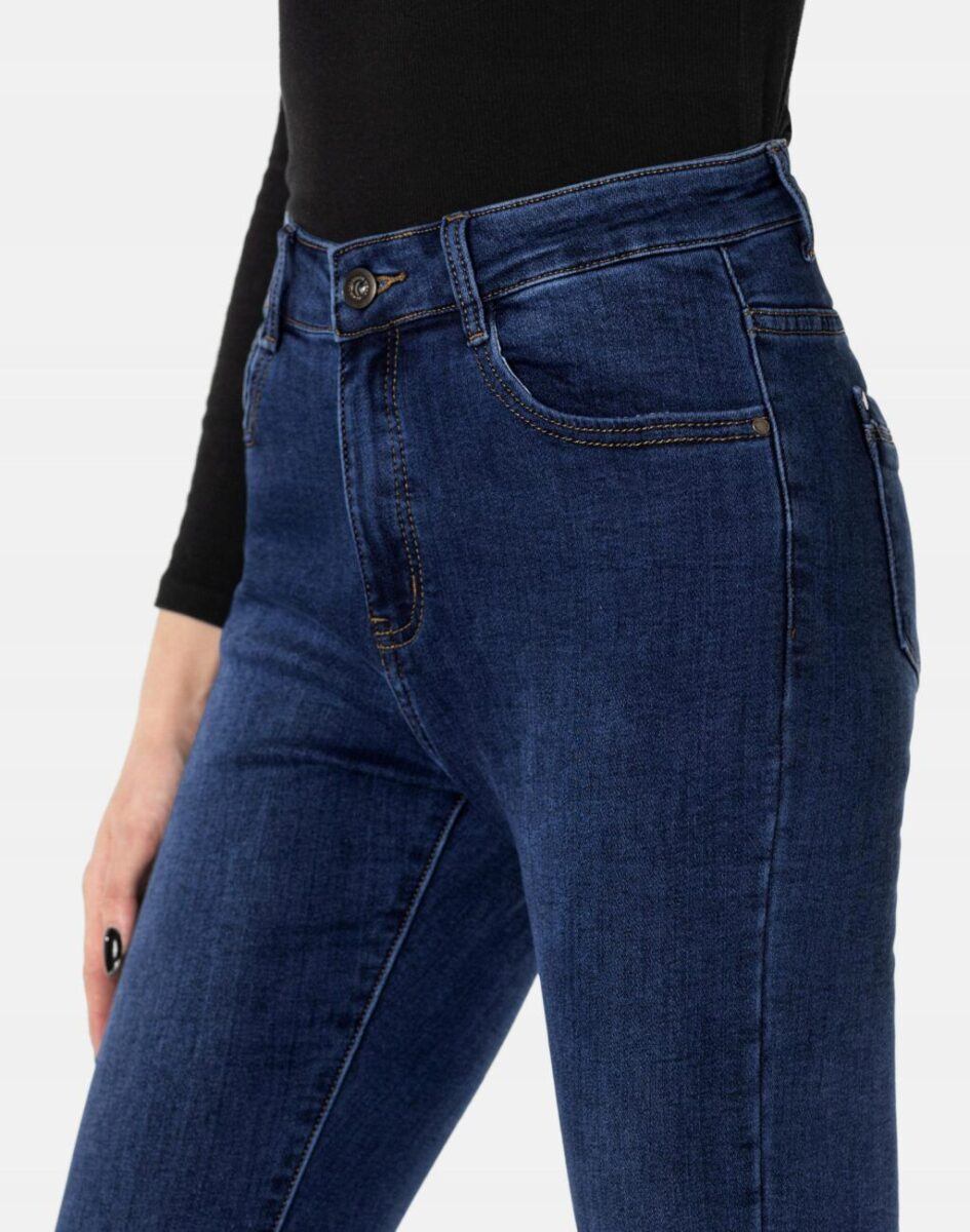 Ciepłe Jeansy damskie model 2185 to klasyczne, bardzo szykowne „rurki” w kolorze granatowym „Dark Blue”, ocieplone od wewnętrznej strony mikropolarem, o wyszczuplającym optycznie kobiecą sylwetkę fasonie i wyższym stanie. Zapinane są na kryty zamek błyskawiczny i metalowy guzik sygnowany logiem firmy. Z przodu mają dwie kieszonki zaokrąglone oraz mniejszą kieszonkę tzw. bilonówkę, a na tyle klasyczne kieszenie naszywane jak w typowych spodniach jeansowych. W pasie szlufki umożliwiające stylizacje z paskiem. Najbardziej podatne na uszkodzenia miejsca wzmocnione są dodatkowymi przeszyciami oraz ozdobnymi nitami. Uszyte z mocnego jeansu z dodatkiem lycry (strecz) dzięki czemu spodnie są bardziej elastyczne co pozwala na pełną swobodę ruchów, daje komfort przy siadaniu i zapewnia ogromny komfort noszenia.