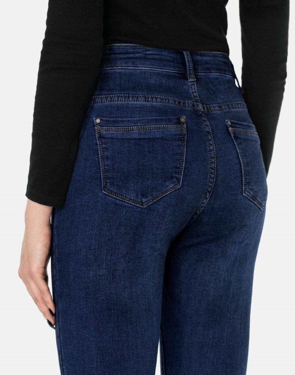 Ciepłe Jeansy damskie model 2185 to klasyczne, bardzo szykowne „rurki” w kolorze granatowym „Dark Blue”, ocieplone od wewnętrznej strony mikropolarem, o wyszczuplającym optycznie kobiecą sylwetkę fasonie i wyższym stanie. Zapinane są na kryty zamek błyskawiczny i metalowy guzik sygnowany logiem firmy. Z przodu mają dwie kieszonki zaokrąglone oraz mniejszą kieszonkę tzw. bilonówkę, a na tyle klasyczne kieszenie naszywane jak w typowych spodniach jeansowych. W pasie szlufki umożliwiające stylizacje z paskiem. Najbardziej podatne na uszkodzenia miejsca wzmocnione są dodatkowymi przeszyciami oraz ozdobnymi nitami. Uszyte z mocnego jeansu z dodatkiem lycry (strecz) dzięki czemu spodnie są bardziej elastyczne co pozwala na pełną swobodę ruchów, daje komfort przy siadaniu i zapewnia ogromny komfort noszenia.