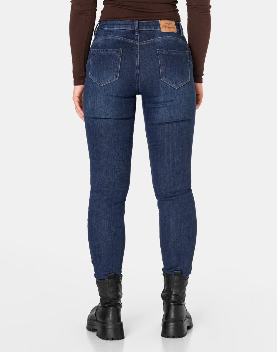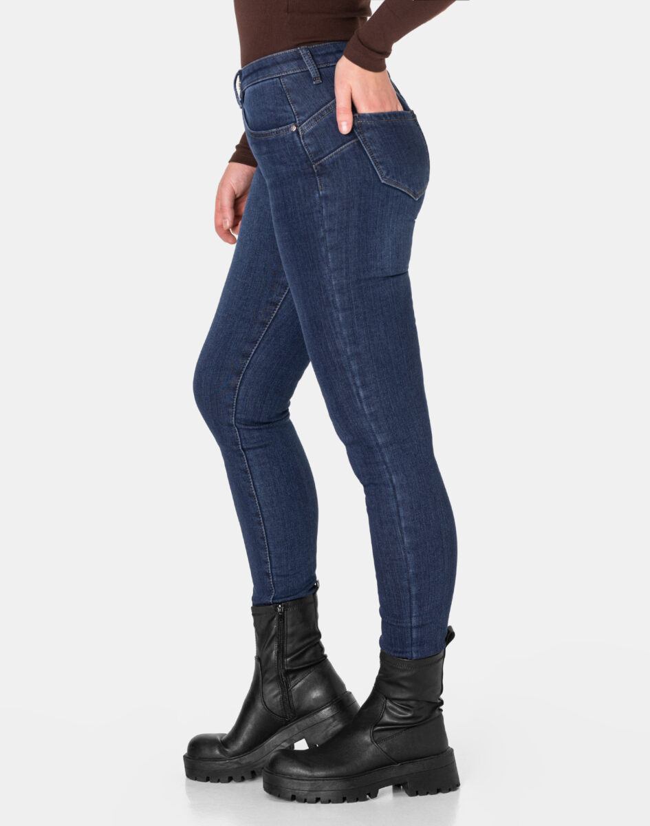 Ciepłe Jeansy damskie model 1102# to klasyczne, bardzo szykowne rurki w kolorze granatowym "Dark Blue", ocieplone od wewnętrznej strony polarem, o wyszczuplającym optycznie kobiecą sylwetkę fasonie i wyższym stanie. Zapinane na kryty zamek błyskawiczny i metalowy guzik sygnowany logiem firmy. Z przodu mają dwie kieszonki zaokrąglone oraz mniejszą kieszonkę tzw. bilonówkę, a na tyle klasyczne kieszenie naszywane jak w typowych spodniach jeansowych. W pasie szlufki umożliwiające stylizacje z paskiem. Najbardziej podatne na uszkodzenia miejsca wzmocnione są dodatkowymi przeszyciami oraz ozdobnymi nitami. Uszyte z wysokiej jakości, trwałej i mocnej, delikatnie elastycznej tkaniny jeansowej z niewielkim dodatkiem lycry (elastan) dzięki czemu spodnie są bardziej elastyczne, co pozwala na pełną swobodę ruchów, daje komfort przy siadaniu i zapewnia ogromny komfort noszenia. Łatwo się je zakłada i są znacznie wygodniejsze od spodni, które lycry nie mają. Poza tym bawełna ma tendencję do kurczenia się w praniu, dlatego lycra sprawia, że spodnie są wyjątkowo praktyczne i można je bez problemu założyć po wysuszeniu.