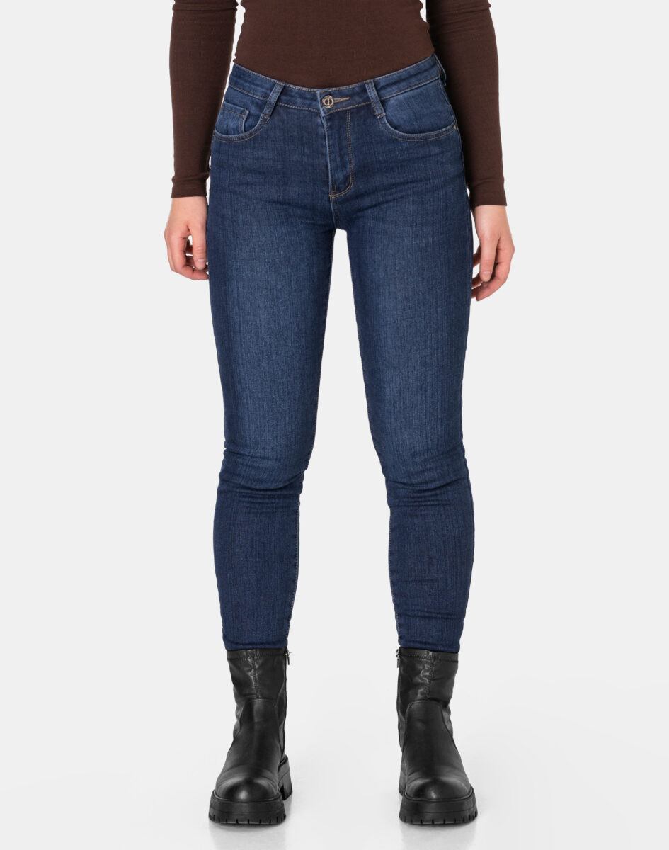 Ciepłe Jeansy damskie model 1102# to klasyczne, bardzo szykowne rurki w kolorze granatowym "Dark Blue", ocieplone od wewnętrznej strony polarem, o wyszczuplającym optycznie kobiecą sylwetkę fasonie i wyższym stanie. Zapinane na kryty zamek błyskawiczny i metalowy guzik sygnowany logiem firmy. Z przodu mają dwie kieszonki zaokrąglone oraz mniejszą kieszonkę tzw. bilonówkę, a na tyle klasyczne kieszenie naszywane jak w typowych spodniach jeansowych. W pasie szlufki umożliwiające stylizacje z paskiem. Najbardziej podatne na uszkodzenia miejsca wzmocnione są dodatkowymi przeszyciami oraz ozdobnymi nitami. Uszyte z wysokiej jakości, trwałej i mocnej, delikatnie elastycznej tkaniny jeansowej z niewielkim dodatkiem lycry (elastan) dzięki czemu spodnie są bardziej elastyczne, co pozwala na pełną swobodę ruchów, daje komfort przy siadaniu i zapewnia ogromny komfort noszenia. Łatwo się je zakłada i są znacznie wygodniejsze od spodni, które lycry nie mają. Poza tym bawełna ma tendencję do kurczenia się w praniu, dlatego lycra sprawia, że spodnie są wyjątkowo praktyczne i można je bez problemu założyć po wysuszeniu.