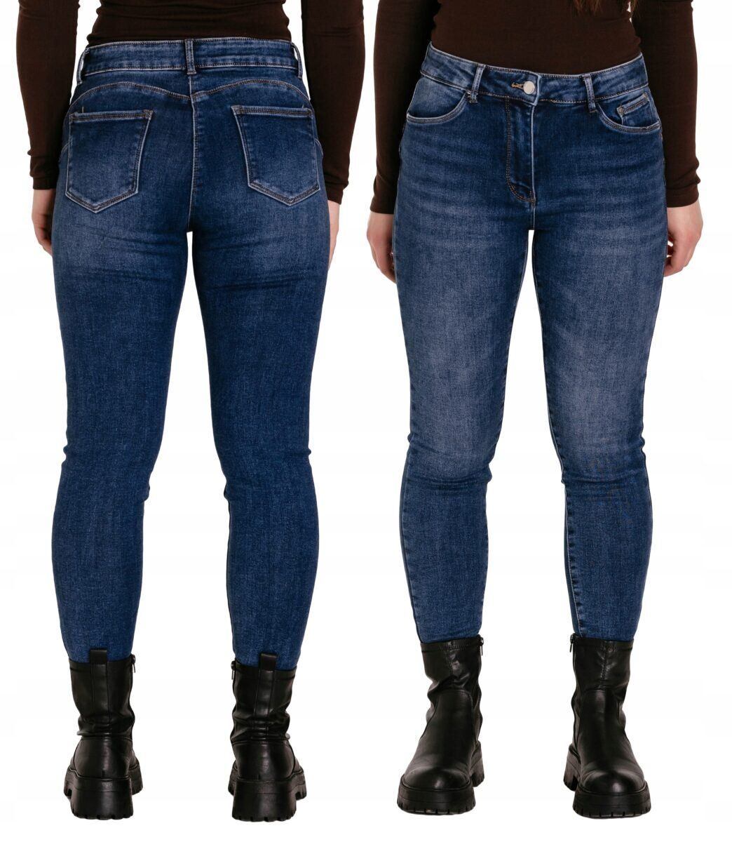 Ciepłe Jeansy damskie model 38703# to klasyczne, bardzo szykowne rurki w kolorze granatowym „Dark Blue”, lekko ocieplone od wewnętrznej strony mikropolarem, o wyszczuplającym optycznie kobiecą sylwetkę fasonie i wyższym stanie. Zapinane na kryty zamek błyskawiczny i metalowy guzik sygnowany logiem firmy. Z przodu mają dwie kieszonki zaokrąglone oraz mniejszą kieszonkę tzw. bilonówkę, a na tyle klasyczne kieszenie naszywane jak w typowych spodniach jeansowych. W pasie szlufki umożliwiające stylizacje z paskiem. Najbardziej podatne na uszkodzenia miejsca wzmocnione są dodatkowymi przeszyciami oraz ozdobnymi nitami. Uszyte z wysokiej jakości, trwałej i mocnej, delikatnie elastycznej tkaniny jeansowej z niewielkim dodatkiem lycry (elastan) dzięki czemu spodnie są bardziej elastyczne, co pozwala na pełną swobodę ruchów, daje komfort przy siadaniu i zapewnia ogromny komfort noszenia. Łatwo się je zakłada i są znacznie wygodniejsze od spodni, które lycry nie mają. Poza tym bawełna ma tendencję do kurczenia się w praniu, dlatego lycra sprawia, że spodnie są wyjątkowo praktyczne i można je bez problemu założyć po wysuszeniu.