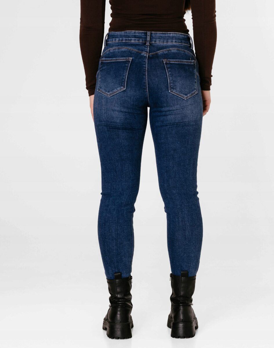 Ciepłe Jeansy damskie model 38703# to klasyczne, bardzo szykowne rurki w kolorze granatowym „Dark Blue”, lekko ocieplone od wewnętrznej strony mikropolarem, o wyszczuplającym optycznie kobiecą sylwetkę fasonie i wyższym stanie. Zapinane na kryty zamek błyskawiczny i metalowy guzik sygnowany logiem firmy. Z przodu mają dwie kieszonki zaokrąglone oraz mniejszą kieszonkę tzw. bilonówkę, a na tyle klasyczne kieszenie naszywane jak w typowych spodniach jeansowych. W pasie szlufki umożliwiające stylizacje z paskiem. Najbardziej podatne na uszkodzenia miejsca wzmocnione są dodatkowymi przeszyciami oraz ozdobnymi nitami. Uszyte z wysokiej jakości, trwałej i mocnej, delikatnie elastycznej tkaniny jeansowej z niewielkim dodatkiem lycry (elastan) dzięki czemu spodnie są bardziej elastyczne, co pozwala na pełną swobodę ruchów, daje komfort przy siadaniu i zapewnia ogromny komfort noszenia. Łatwo się je zakłada i są znacznie wygodniejsze od spodni, które lycry nie mają. Poza tym bawełna ma tendencję do kurczenia się w praniu, dlatego lycra sprawia, że spodnie są wyjątkowo praktyczne i można je bez problemu założyć po wysuszeniu.
