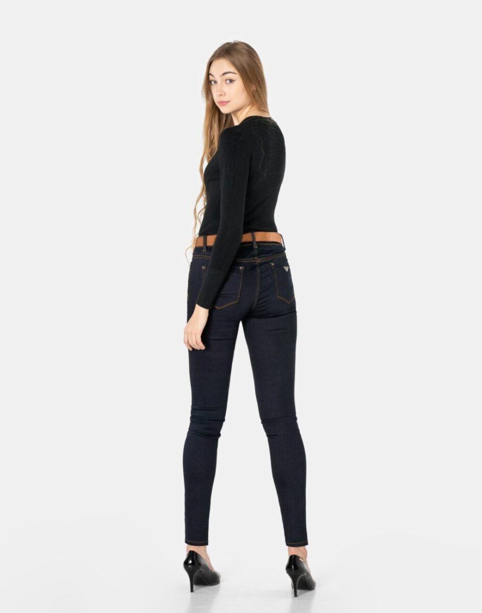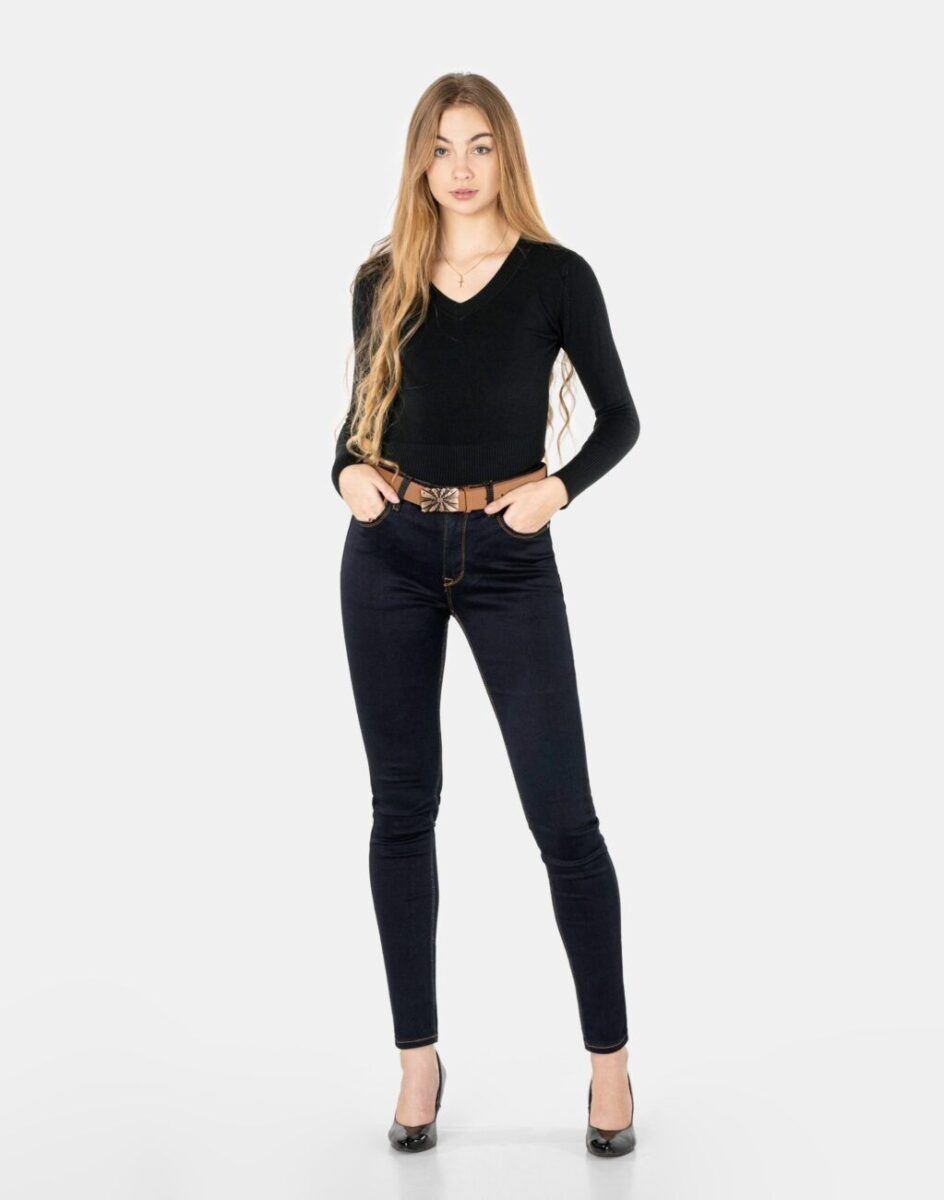 Ciepłe Jeansy damskie model 2040 to klasyczne, bardzo szykowne rurki w kolorze granatowym „Dark Blue”, ocieplone od wewnętrznej strony mikropolarem, z wąskimi nogawkami o wyszczuplającym optycznie kobiecą sylwetkę fasonie i wyższym stanie. Zapinane są na kryty zamek błyskawiczny i metalowy guzik sygnowany logiem firmy. Z przodu mają dwie kieszonki zaokrąglone oraz mniejszą kieszonkę tzw. bilonówkę, a na tyle klasyczne kieszenie naszywane jak w typowych spodniach jeansowych. W pasie szlufki umożliwiające stylizacje z paskiem. Najbardziej podatne na uszkodzenia miejsca wzmocnione są dodatkowymi przeszyciami oraz ozdobnymi nitami. Uszyte z mocnego jeansu z niewielkim dodatkiem lycry (elastan) dzięki czemu spodnie są bardziej elastyczne co pozwala na pełną swobodę ruchów, daje komfort przy siadaniu i zapewnia ogromny komfort noszenia.