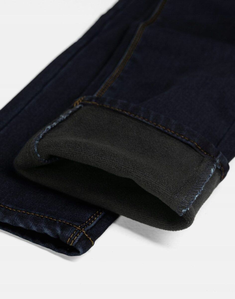 - Struktura/rodzaj materiału: Gruby, ciepły, Denim Jeans ocieplony od wewnętrznej strony polarem, elastyczny, gładki, matowy