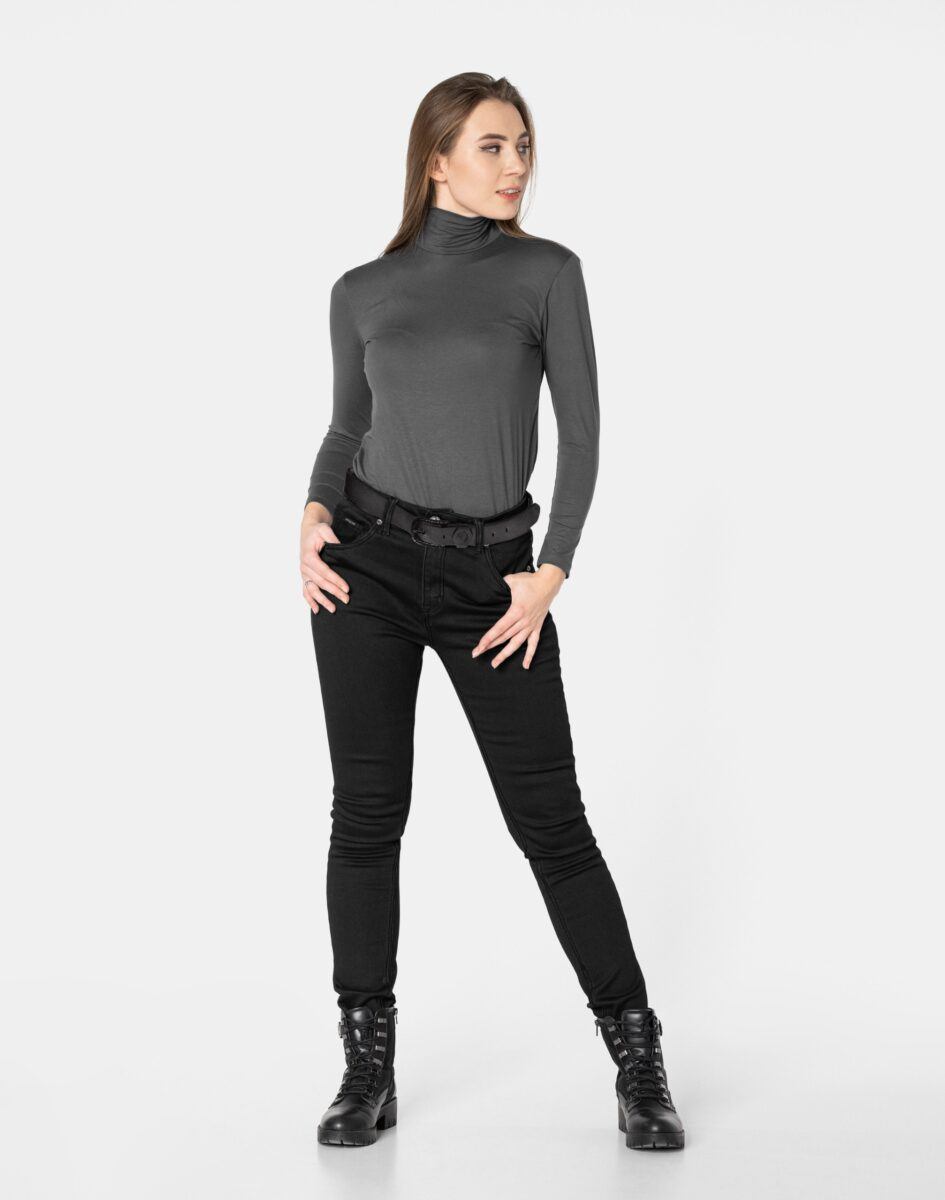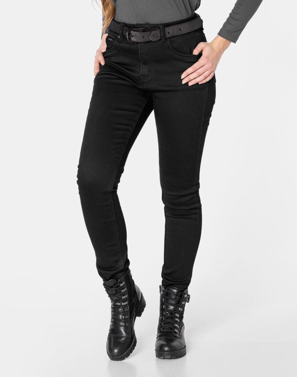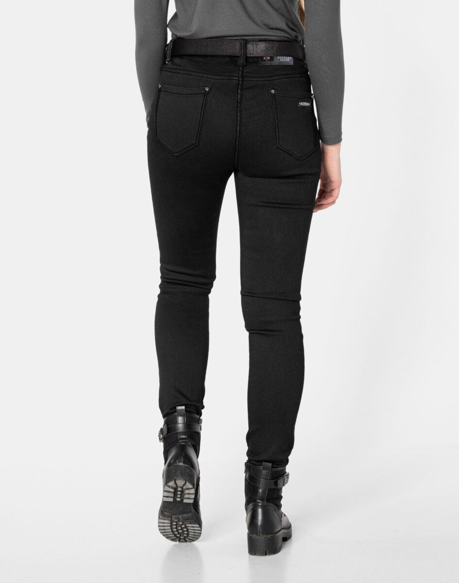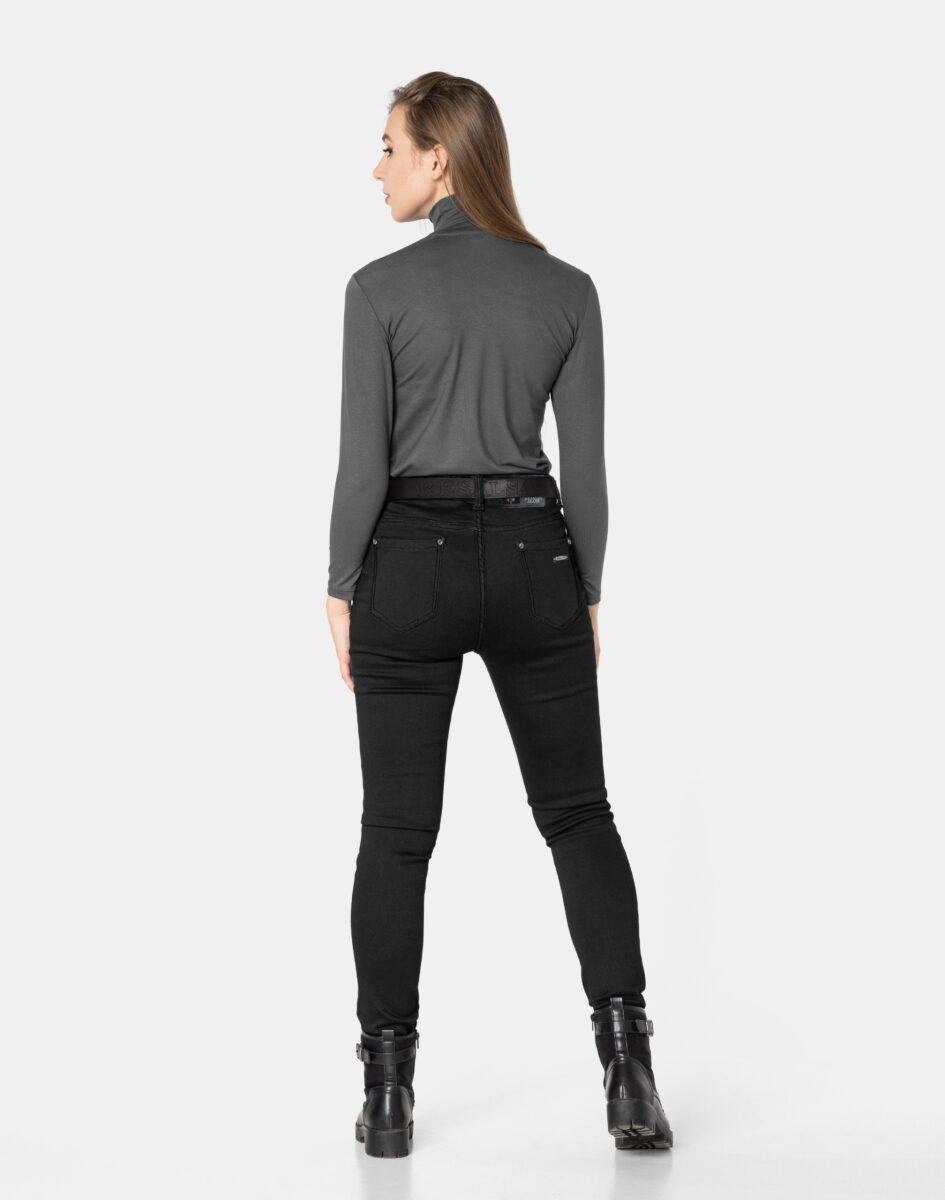 Ciepłe Jeansy damskie model 2063 to klasyczne, bardzo szykowne rurki w kolorze czarnym „Super Black”, ocieplone od wewnętrznej strony mikropolarem, z wąskimi nogawkami o wyszczuplającym optycznie kobiecą sylwetkę fasonie i wyższym stanie. Zapinane są na kryty zamek błyskawiczny i metalowy guzik sygnowany logiem firmy. Z przodu mają dwie kieszonki zaokrąglone oraz mniejszą kieszonkę tzw. bilonówkę, a na tyle klasyczne kieszenie naszywane jak w typowych spodniach jeansowych. W pasie szlufki umożliwiające stylizacje z paskiem. Najbardziej podatne na uszkodzenia miejsca wzmocnione są dodatkowymi przeszyciami oraz ozdobnymi nitami. Uszyte z mocnego jeansu z niewielkim dodatkiem lycry (elastan) dzięki czemu spodnie są bardziej elastyczne co pozwala na pełną swobodę ruchów, daje komfort przy siadaniu i zapewnia ogromny komfort noszenia.