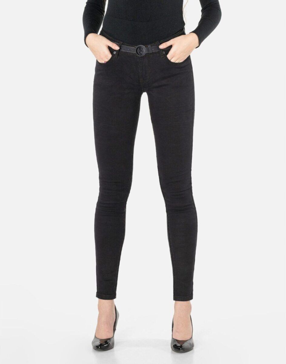 Ciepłe Jeansy damskie model 6183 to klasyczne, bardzo szykowne rurki w kolorze czarnym „Super Black”, ocieplone od wewnętrznej strony mikropolarem, z wąskimi nogawkami o wyszczuplającym optycznie kobiecą sylwetkę fasonie i wyższym stanie. Zapinane są na kryty zamek błyskawiczny i metalowy guzik sygnowany logiem firmy. Z przodu mają dwie kieszonki zaokrąglone oraz mniejszą kieszonkę tzw. bilonówkę, a na tyle klasyczne kieszenie naszywane jak w typowych spodniach jeansowych. W pasie szlufki umożliwiające stylizacje z paskiem. Najbardziej podatne na uszkodzenia miejsca wzmocnione są dodatkowymi przeszyciami oraz ozdobnymi nitami. Uszyte z mocnego jeansu z niewielkim dodatkiem lycry (elastan) dzięki czemu spodnie są bardziej elastyczne co pozwala na pełną swobodę ruchów, daje komfort przy siadaniu i zapewnia ogromny komfort noszenia.