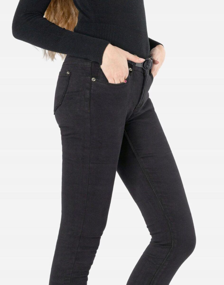 Ciepłe Jeansy damskie model 6183 to klasyczne, bardzo szykowne rurki w kolorze czarnym „Super Black”, ocieplone od wewnętrznej strony mikropolarem, z wąskimi nogawkami o wyszczuplającym optycznie kobiecą sylwetkę fasonie i wyższym stanie. Zapinane są na kryty zamek błyskawiczny i metalowy guzik sygnowany logiem firmy. Z przodu mają dwie kieszonki zaokrąglone oraz mniejszą kieszonkę tzw. bilonówkę, a na tyle klasyczne kieszenie naszywane jak w typowych spodniach jeansowych. W pasie szlufki umożliwiające stylizacje z paskiem. Najbardziej podatne na uszkodzenia miejsca wzmocnione są dodatkowymi przeszyciami oraz ozdobnymi nitami. Uszyte z mocnego jeansu z niewielkim dodatkiem lycry (elastan) dzięki czemu spodnie są bardziej elastyczne co pozwala na pełną swobodę ruchów, daje komfort przy siadaniu i zapewnia ogromny komfort noszenia.