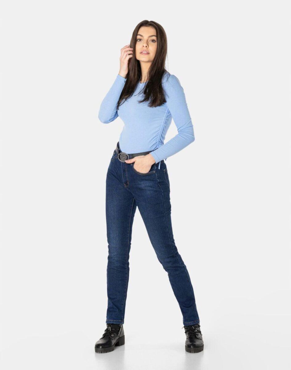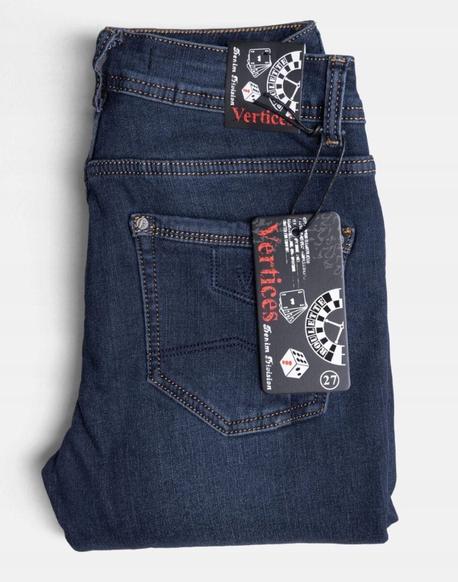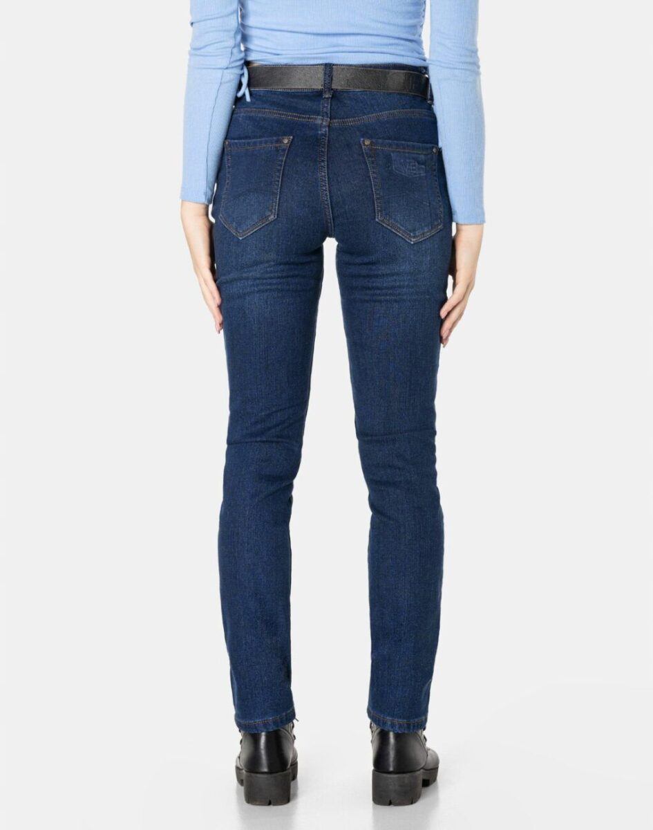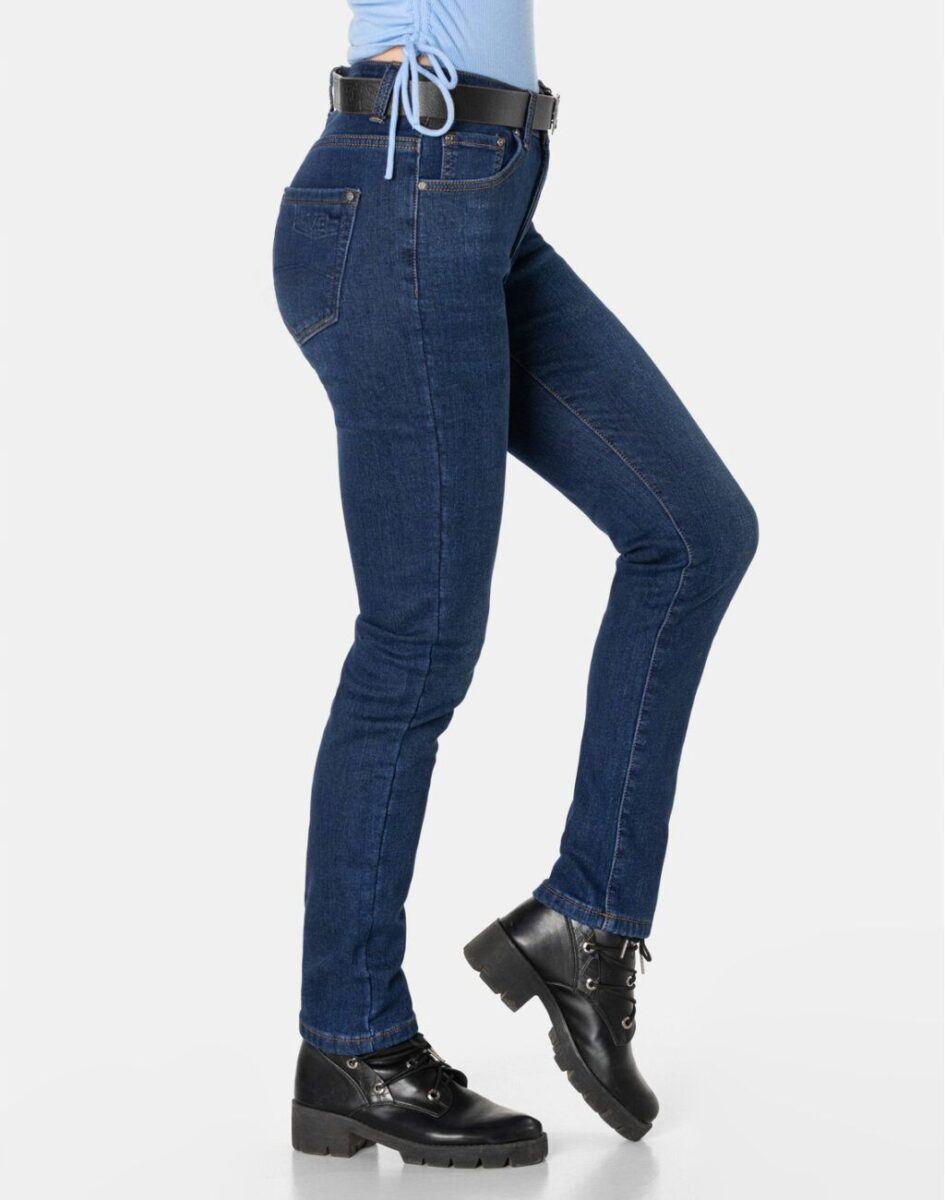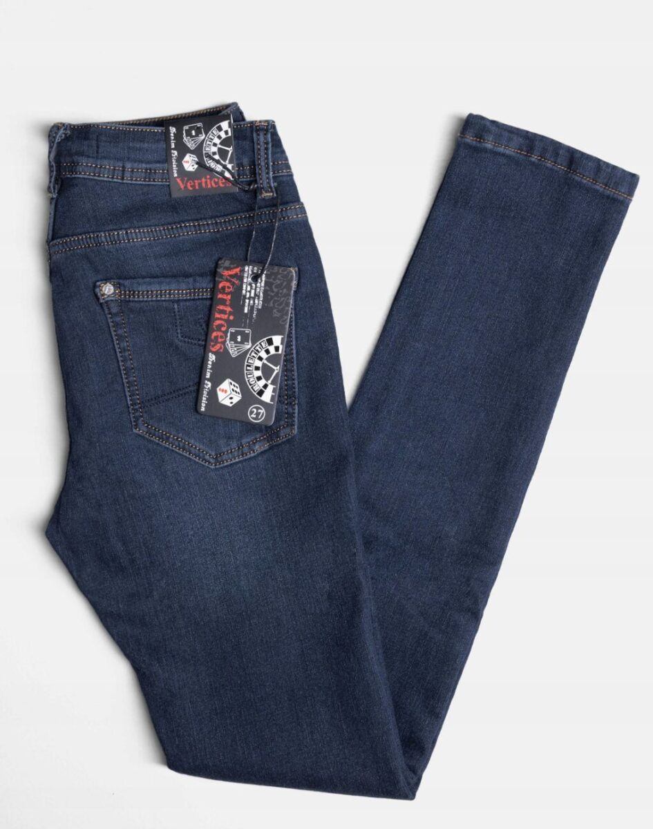 Ciepłe Jeansy damskie model 970 to klasyczne, bardzo szykowne rurki w kolorze granatowym „Dark Blue”, ocieplone od wewnętrznej strony mikropolarem, z wąskimi nogawkami o wyszczuplającym optycznie kobiecą sylwetkę fasonie i wyższym stanie. Zapinane są na kryty zamek błyskawiczny i metalowy guzik sygnowany logiem firmy. Z przodu mają dwie kieszonki zaokrąglone oraz mniejszą kieszonkę tzw. bilonówkę, a na tyle klasyczne kieszenie naszywane jak w typowych spodniach jeansowych. W pasie szlufki umożliwiające stylizacje z paskiem. Najbardziej podatne na uszkodzenia miejsca wzmocnione są dodatkowymi przeszyciami oraz ozdobnymi nitami. Uszyte z mocnego jeansu z niewielkim dodatkiem lycry (elastan) dzięki czemu spodnie są bardziej elastyczne co pozwala na pełną swobodę ruchów, daje komfort przy siadaniu i zapewnia ogromny komfort noszenia.