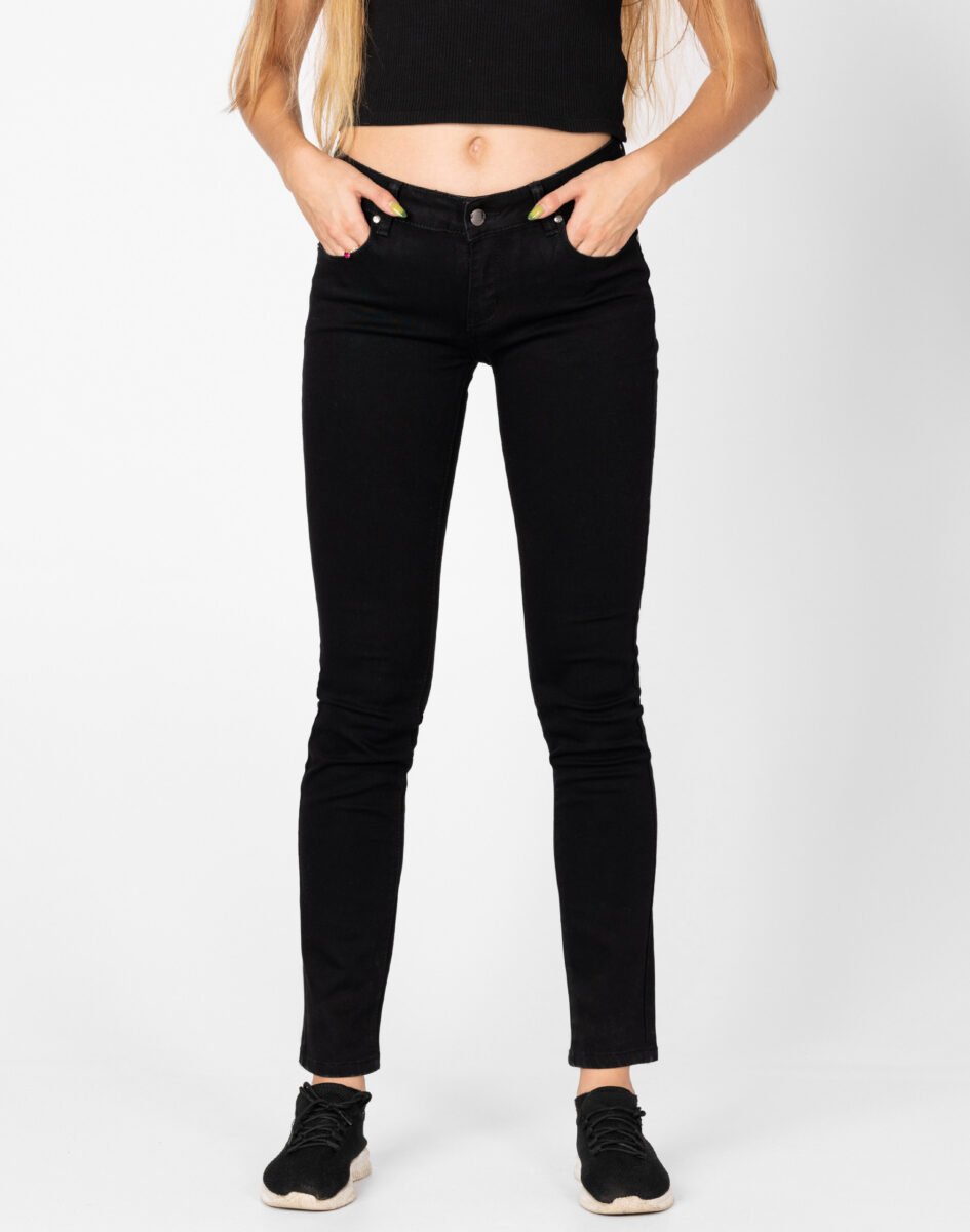 Spodnie damskie model 3101 to klasyczne, bardzo szykowne rurki damskie w kolorze czarnym "Super Black" z wąskimi nogawkami o wyszczuplającym optycznie kobiecą sylwetkę fasonie i średnim stanie. Zapinane są na kryty zamek błyskawiczny i metalowy guzik sygnowany logiem firmy. Z przodu mają dwie kieszonki zaokrąglone oraz mniejszą kieszonkę tzw. bilonówkę, a na tyle klasyczne kieszenie naszywane jak w typowych spodniach jeansowych. W pasie szlufki umożliwiające stylizacje z paskiem. Najbardziej podatne na uszkodzenia miejsca wzmocnione są dodatkowymi przeszyciami oraz ozdobnymi nitami.