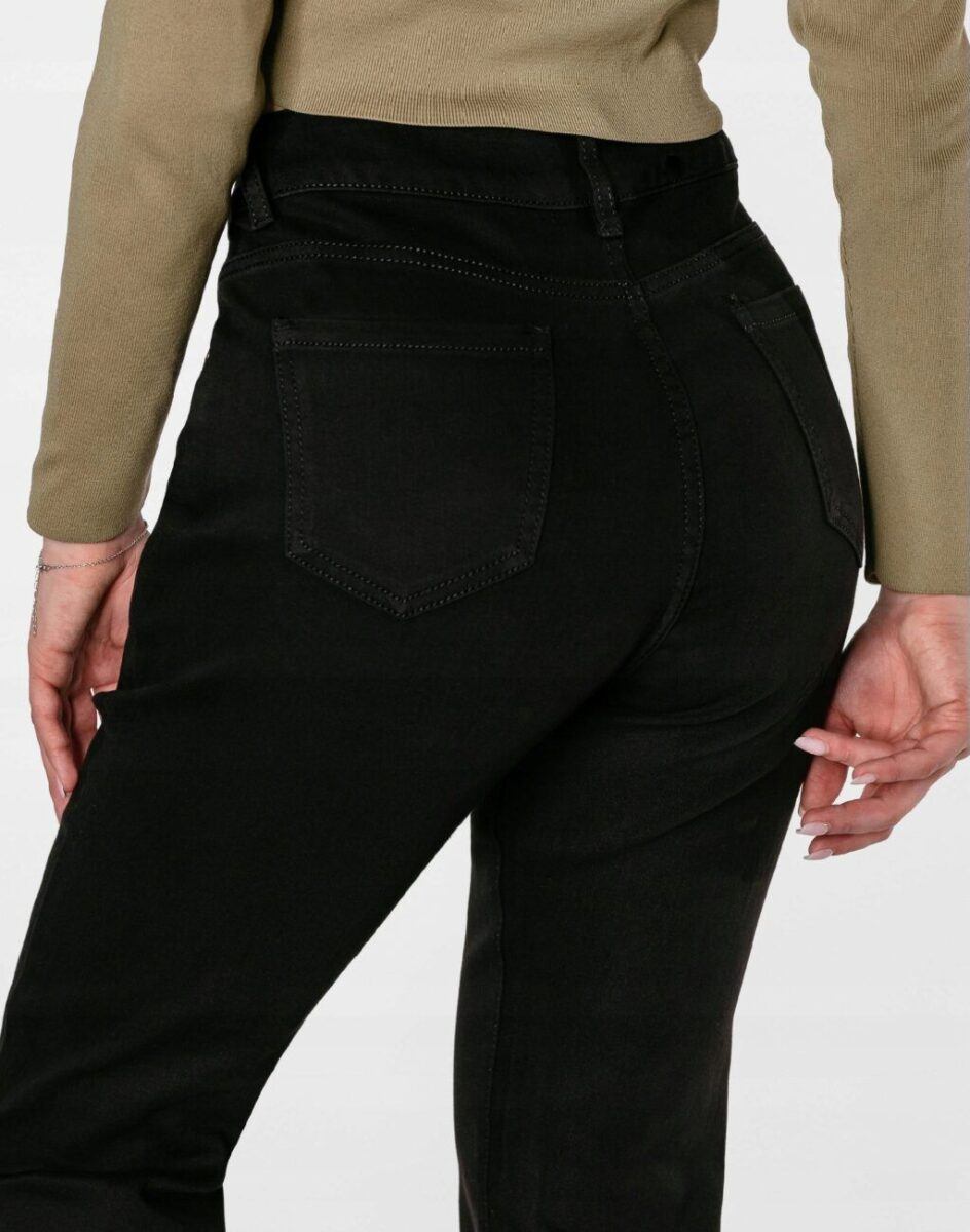 Oferowane przez nas spodnie uszyte są z wysokiej jakości czarnej tkaniny jeansowej typu „Denim Super Black” z domieszką lycry, która odznacza się wysoką elastycznością, co gwarantuje że spodnie nie będą się deformować i odkształcać nawet po długim użytkowaniu. Jeansy świetnie przylegają do ciała i pozwalają na pełną swobodę ruchów, co daje wygodę przy siadaniu i zapewnia ogromny komfort noszenia. Możesz je śmiało łączyć zarówno ze szpilkami (idealnie wydłużają kobiece nogi), jak i obuwiem sportowym. Dobrze wyglądają również z podwiniętymi nogawkami. Niepozorne podwinięcie nogawek nadaje stylizacjom ciekawej nonszalancji i zadziorności. Zapewniają poczucie atrakcyjności przy jednoczesnym zachowaniu wygody i pełnej swobody ruchów.
