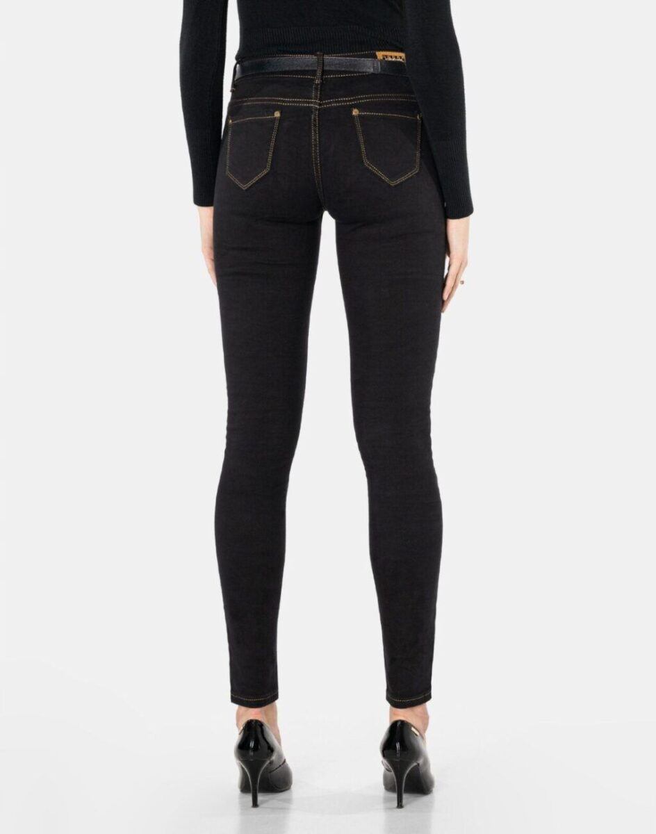 Jeansy damskie model 80961 to klasyczne, bardzo szykowne rurki w kolorze czarnym „Super Black” z wąskimi nogawkami o wyszczuplającym optycznie kobiecą sylwetkę fasonie i średnim stanie. Zapinane są na kryty zamek błyskawiczny i metalowy guzik sygnowany logiem firmy. Z przodu mają dwie kieszonki zaokrąglone oraz mniejszą kieszonkę tzw. bilonówkę, a na tyle klasyczne kieszenie naszywane jak w typowych spodniach jeansowych. W pasie szlufki umożliwiające stylizacje z paskiem. Najbardziej podatne na uszkodzenia miejsca wzmocnione są dodatkowymi przeszyciami oraz ozdobnymi nitami.