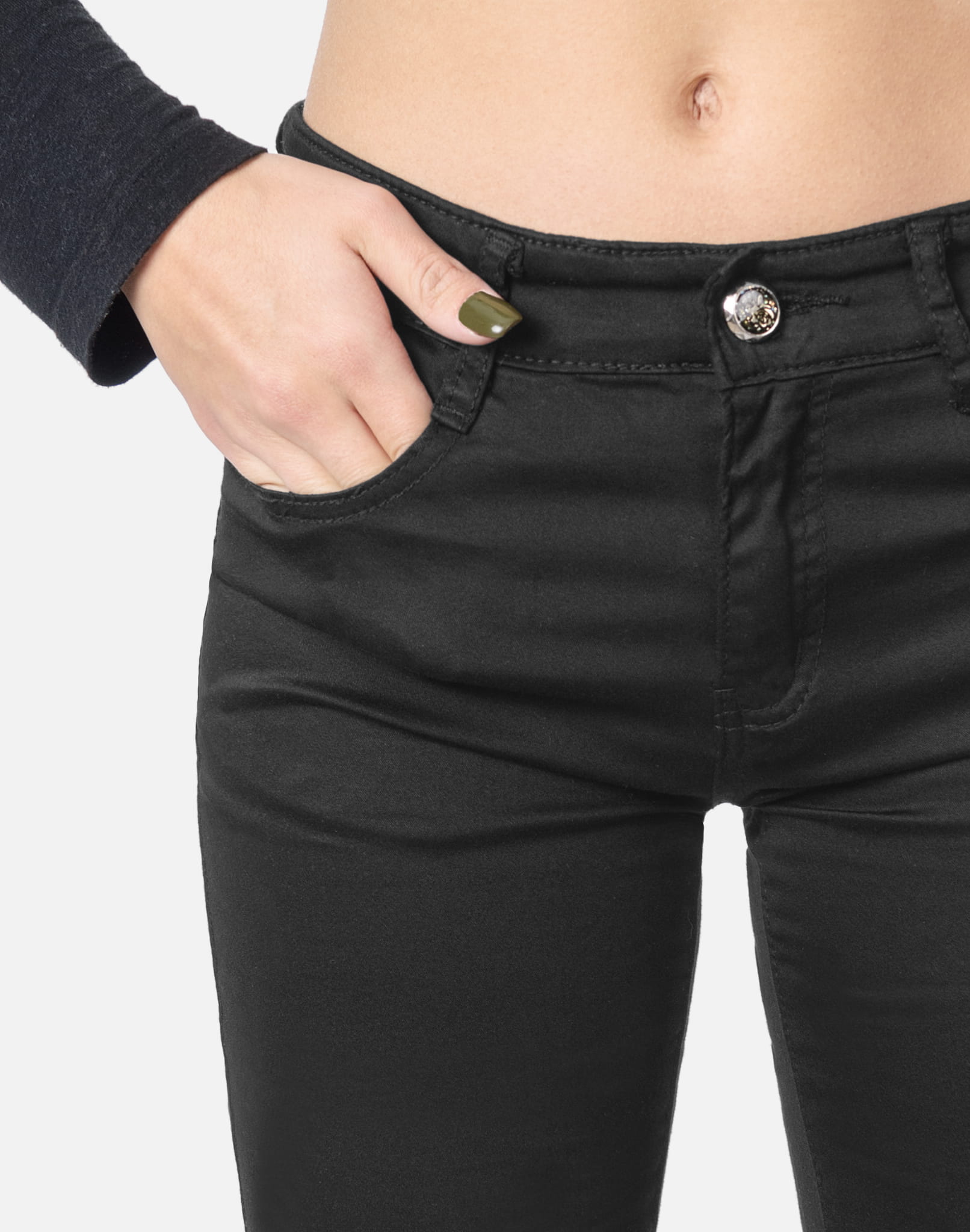 Spodnie damskie model S443 to klasyczne, bardzo wygodne rurki damskie w kolorze czarnym "Super Black" z wąskimi nogawkami o wyszczuplającym optycznie kobiecą sylwetkę fasonie i wyższym stanie. Zapinane są na kryty zamek błyskawiczny i metalowy guzik sygnowany logiem firmy. Z przodu mają dwie kieszonki zaokrąglone oraz mniejszą kieszonkę tzw. bilonówkę, a na tyle klasyczne kieszenie naszywane jak w typowych spodniach jeansowych. W pasie szlufki umożliwiające stylizacje z paskiem. Doły nogawek zostały wykończone eleganckimi krytymi zameczkami z możliwością ich rozsuwania. Najbardziej podatne na uszkodzenia miejsca wzmocnione są dodatkowymi przeszyciami oraz ozdobnymi nitami.