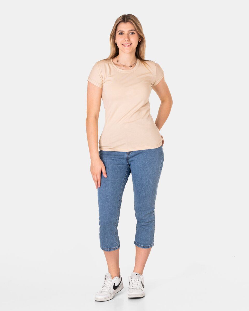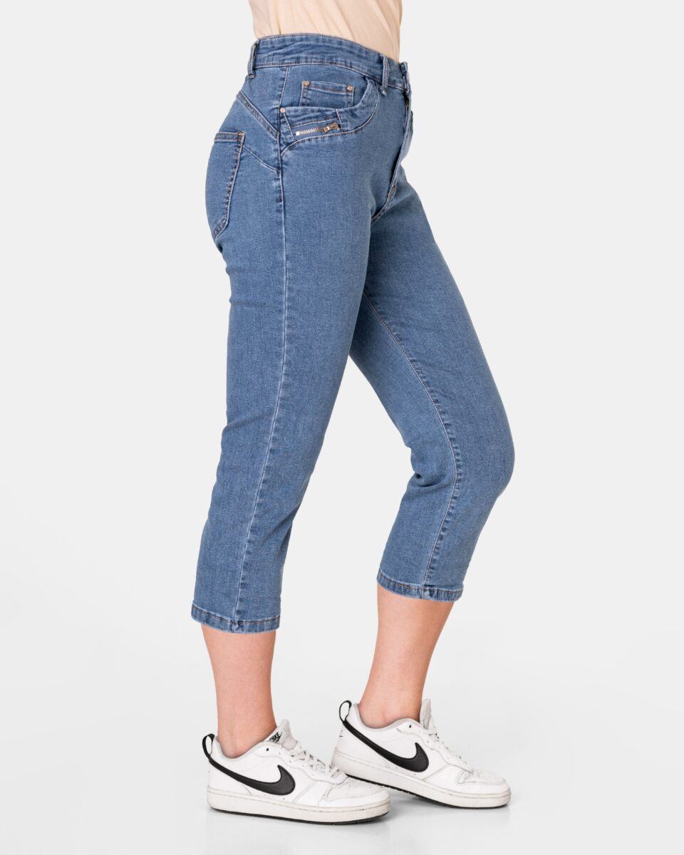 Cienkie i przewiewne rybaczki jeansowe damskie model 6310# z wysokim stanem i krótszą nogawką 3/4 to jeden z najczęściej wybieranych na ciepłe i gorące dni wiosny i lata modeli spodni. Wykonane z wysokiej jakości cienkiej i zwiewnej delikatnie elastycznej tkaniny „Light Blue Denim Jeans” z niewielkim dodatkiem elastanu (lycra). Niewielki dodatek lycry sprawia, że spodnie są bardziej elastyczne, ładnie dopasowują się do sylwetki i są bardzo komfortowe w użytkowaniu. Łatwo się je zakłada i są znacznie wygodniejsze od jeansów, które lycry nie mają. Poza tym bawełna ma tendencję do kurczenia się w praniu, dlatego lycra sprawia, że spodnie są wyjątkowo praktyczne i można je bez problemu założyć po wysuszeniu. Pozwalają na pełną swobodę ruchów, co daje wygodę przy siadaniu i zapewnia ogromny komfort noszenia. Odpowiedni na wysokie temperatury krój spodni nie ogranicza swobody ruchów, a niewielka gramatura tkaniny (290 g/m2) pozytywnie wpływa na komfort użytkowania.