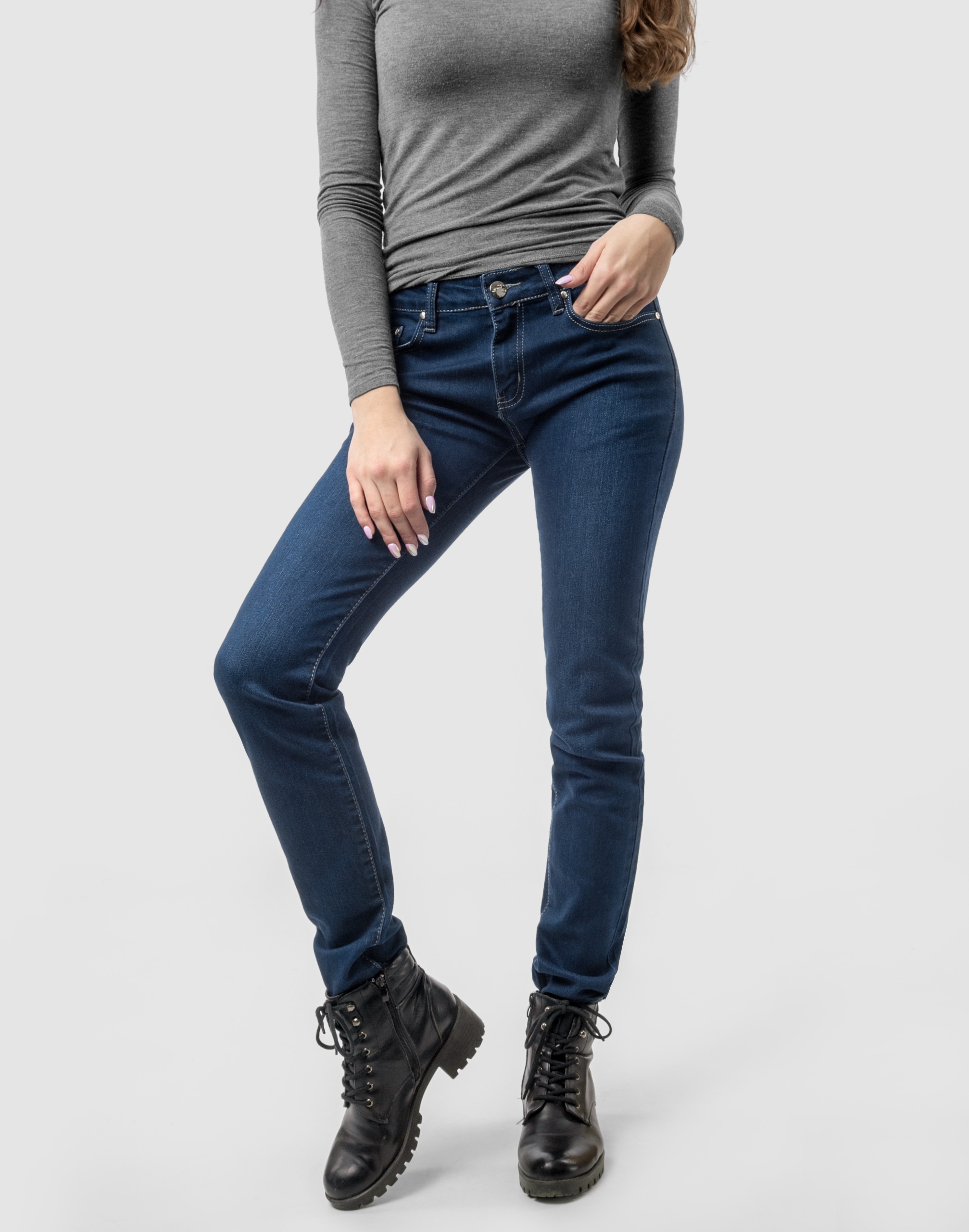 Spodnie damskie model 9129 to klasyczne, bardzo szykowne jeansy damskie w kolorze granatowym "Dark Blue" ze zwężanymi ku dołowi nogawkami o wyszczuplającym optycznie kobiecą sylwetkę fasonie i średnim stanie. Zapinane są na kryty zamek błyskawiczny i metalowy guzik sygnowany logiem firmy. Z przodu mają dwie kieszonki zaokrąglone oraz mniejszą kieszonkę tzw. bilonówkę, a na tyle klasyczne kieszenie naszywane jak w typowych spodniach jeansowych. W pasie szlufki umożliwiające stylizacje z paskiem. Najbardziej podatne na uszkodzenia miejsca wzmocnione są dodatkowymi przeszyciami oraz ozdobnymi nitami.