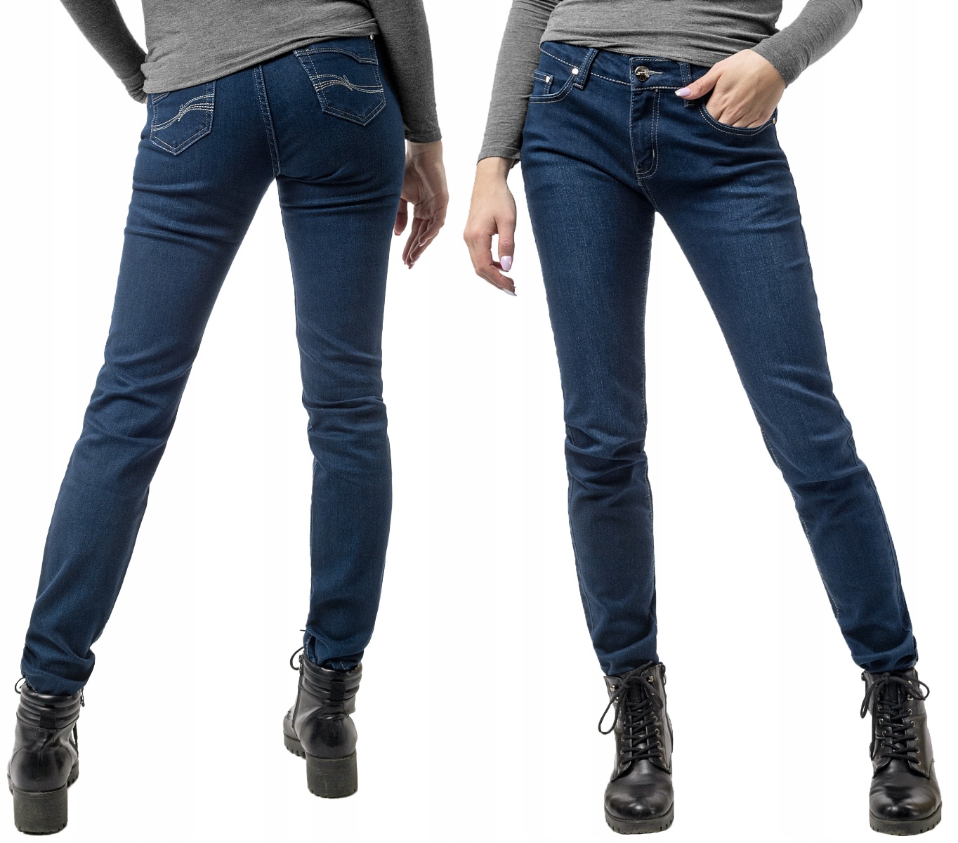 Oferowane przez nas spodnie uszyte są z wysokiej jakości tkaniny bawełnianej typu "Dark Blue Denim" z domieszką lycry dzięki czemu spodnie są bardziej elastyczne i doskonale dopasowują się do każdej sylwetki. Pozwalają na pełną swobodę ruchów co daje komfort przy siadaniu i zapewnia ogromny komfort noszenia. Możesz je śmiało łączyć zarówno ze szpilkami (idealnie wydłużają kobiece nogi), jak i obuwiem sportowym. Dobrze wyglądają również z podwiniętymi nogawkami. Niepozorne podwinięcie nogawek nadaje stylizacjom ciekawej nonszalancji i zadziorności. Zapewniają poczucie atrakcyjności przy jednoczesnym zachowaniu wygody i pełnej swobody ruchów.