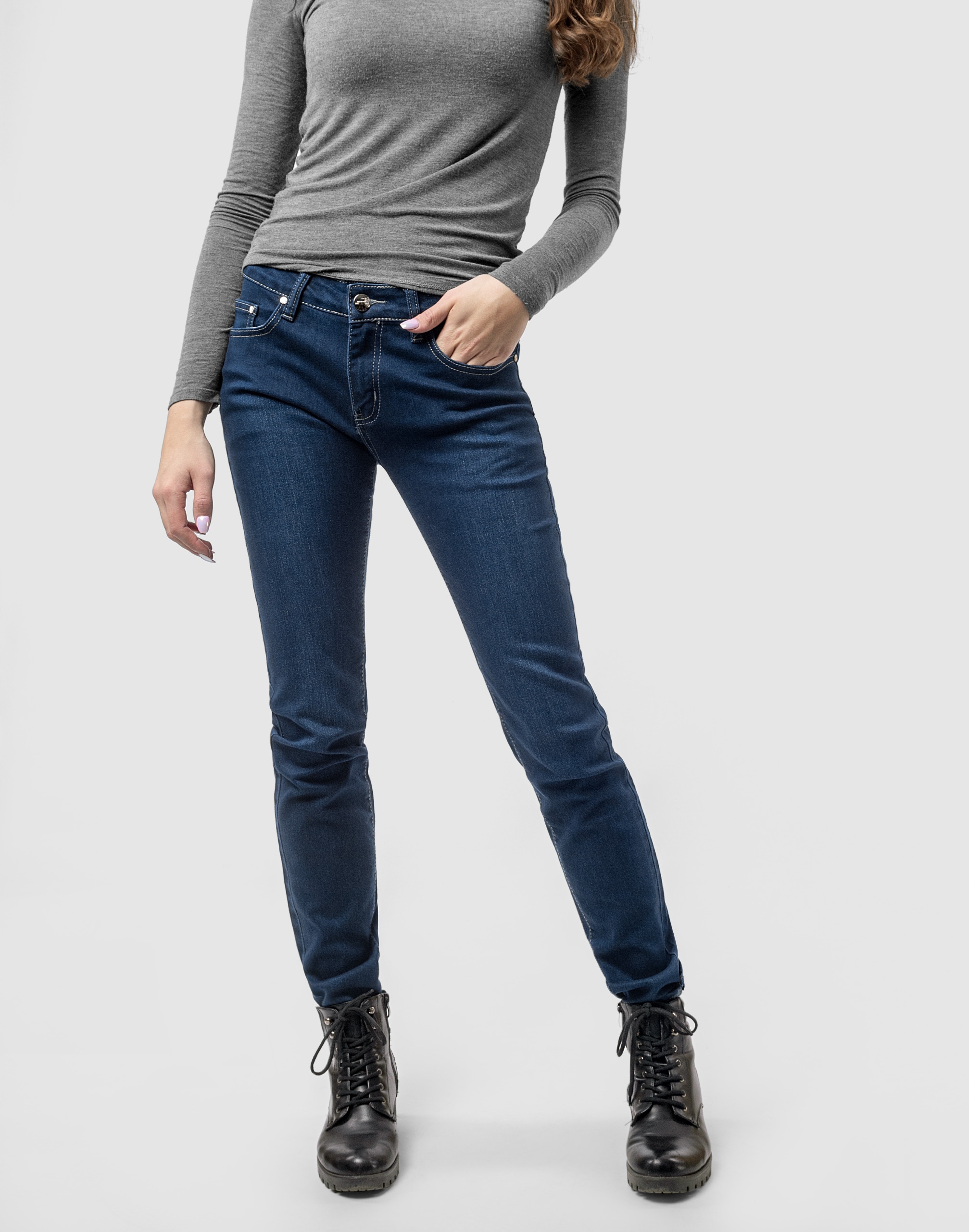 Spodnie damskie model 9129 to klasyczne, bardzo szykowne jeansy damskie w kolorze granatowym "Dark Blue" ze zwężanymi ku dołowi nogawkami o wyszczuplającym optycznie kobiecą sylwetkę fasonie i średnim stanie. Zapinane są na kryty zamek błyskawiczny i metalowy guzik sygnowany logiem firmy. Z przodu mają dwie kieszonki zaokrąglone oraz mniejszą kieszonkę tzw. bilonówkę, a na tyle klasyczne kieszenie naszywane jak w typowych spodniach jeansowych. W pasie szlufki umożliwiające stylizacje z paskiem. Najbardziej podatne na uszkodzenia miejsca wzmocnione są dodatkowymi przeszyciami oraz ozdobnymi nitami.