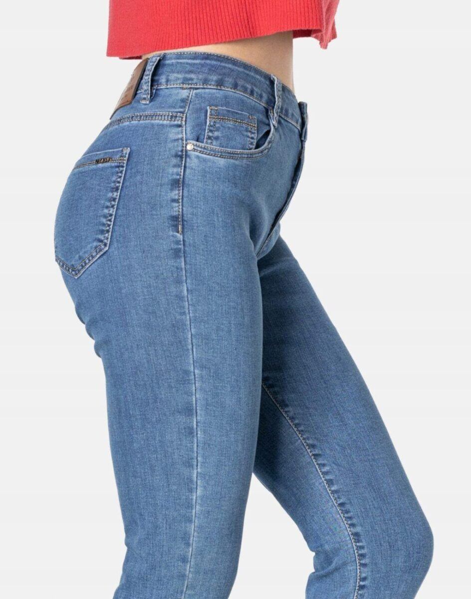 Jeansy damskie Maravis model LQ005 Skinny to klasyczne, bardzo szykowne rurki w kolorze jasno niebieskim „Light Blue” z wyższym stanem i wąskimi nogawkami 7/8 kończącymi się powyżej kostki dzięki temu sylwetka wygląda w nich lekko i zgrabnie. Zapinane są na kryty zamek błyskawiczny i metalowy guzik sygnowany logiem firmy. Z przodu mają dwie kieszonki zaokrąglone oraz mniejszą kieszonkę tzw. bilonówkę, a na tyle klasyczne kieszenie naszywane jak w typowych spodniach jeansowych. W pasie szlufki umożliwiające stylizacje z paskiem. Najbardziej podatne na uszkodzenia miejsca wzmocnione są dodatkowymi przeszyciami oraz ozdobnymi nitami.