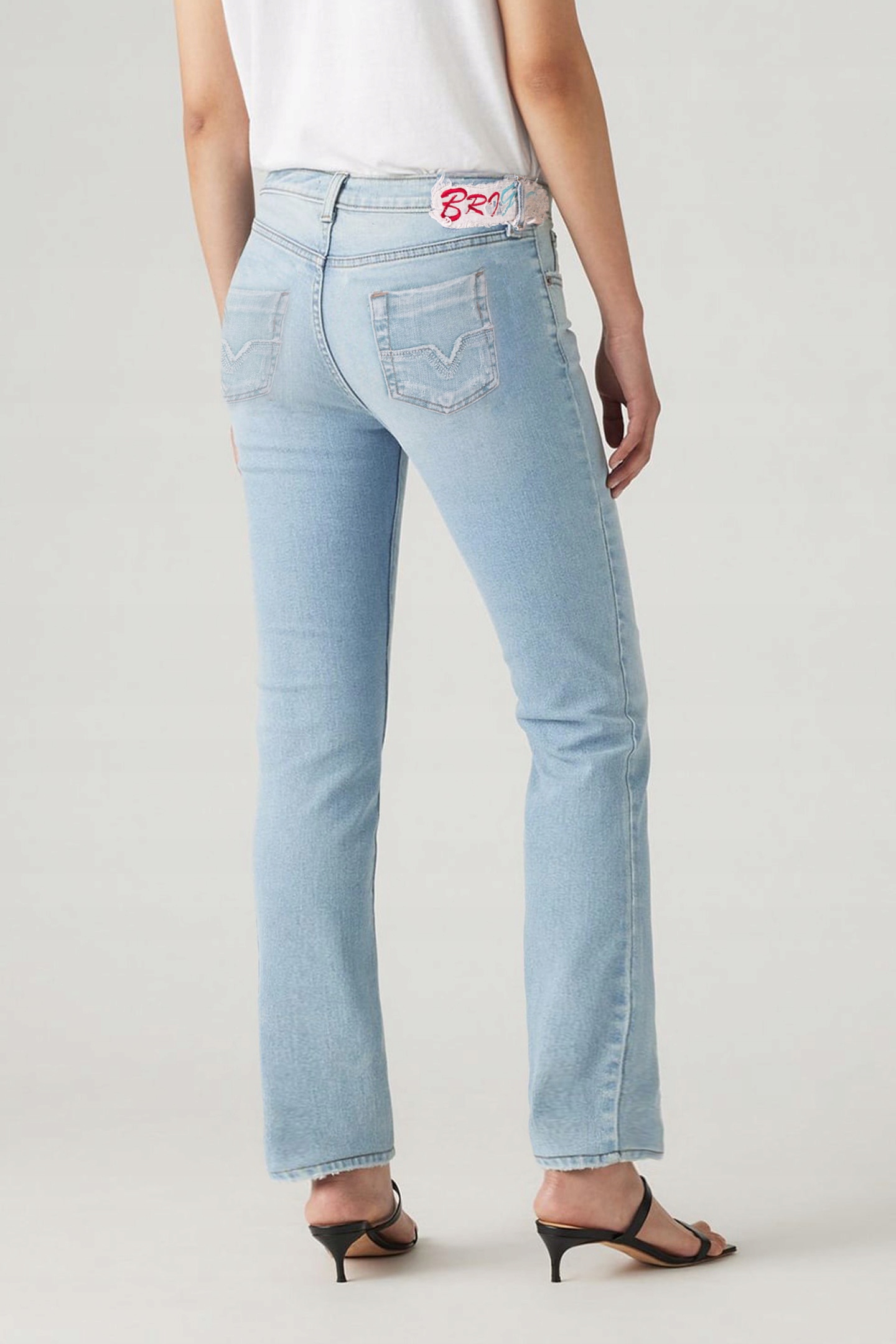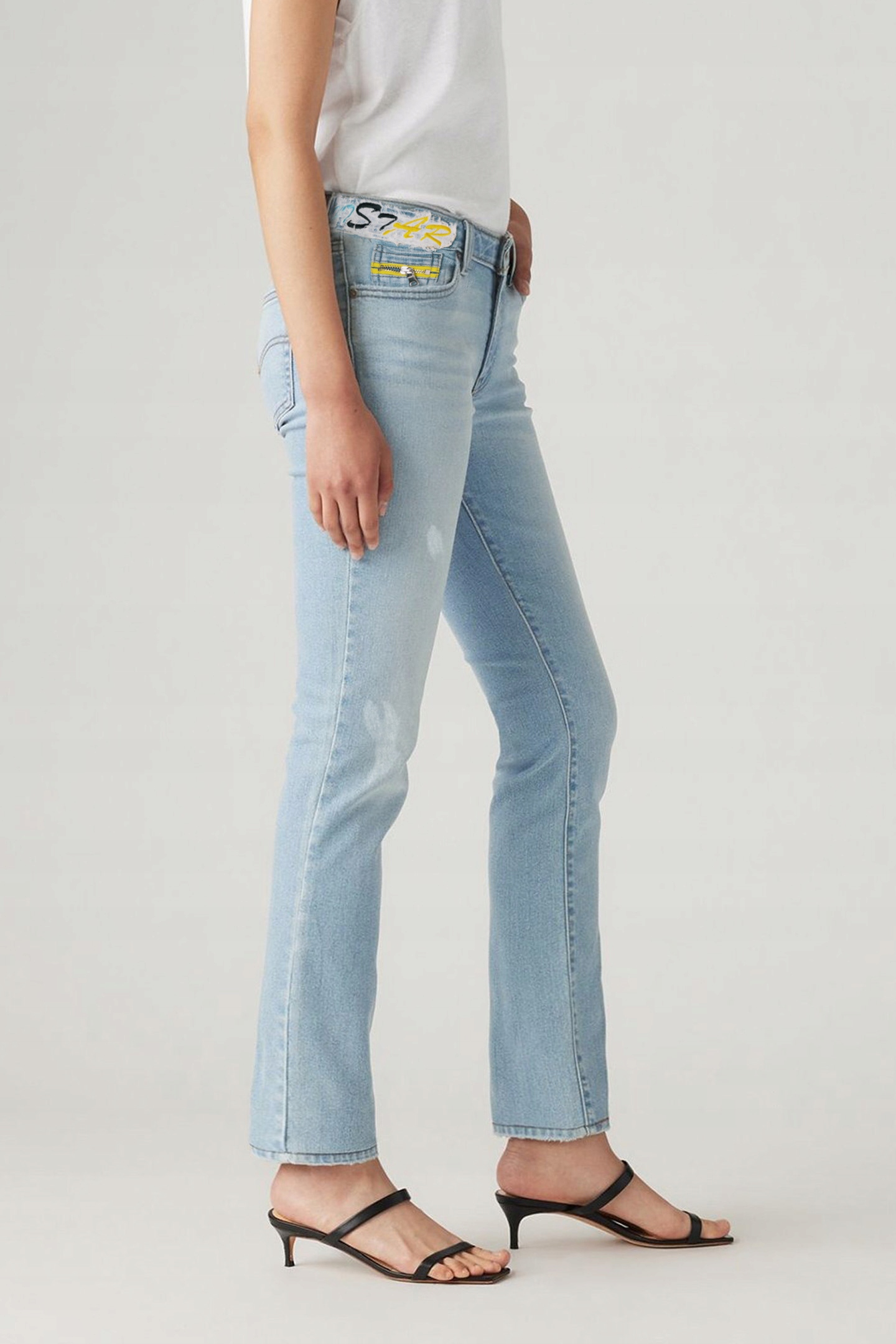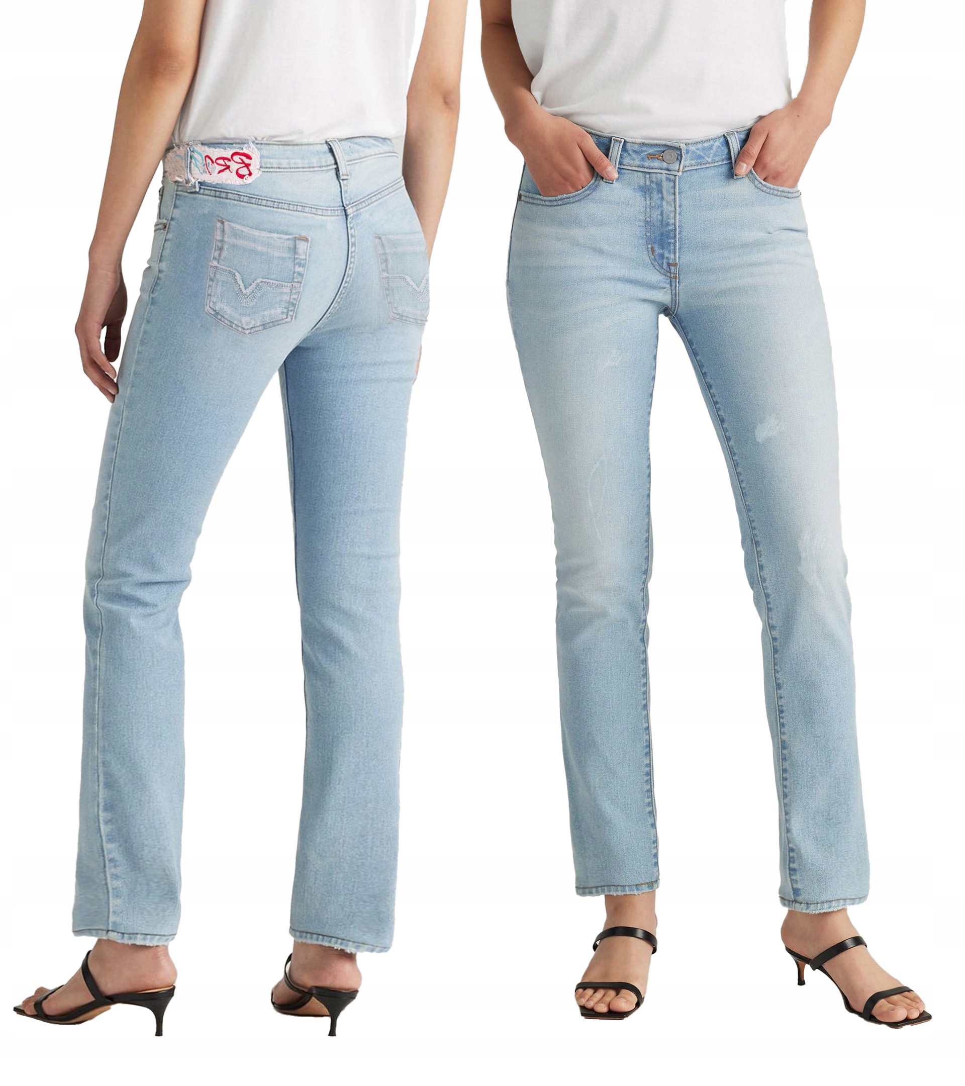 - Naszywka z logo firmy i typowe dla spodni jeansowych mocne, podwójne przeszycia