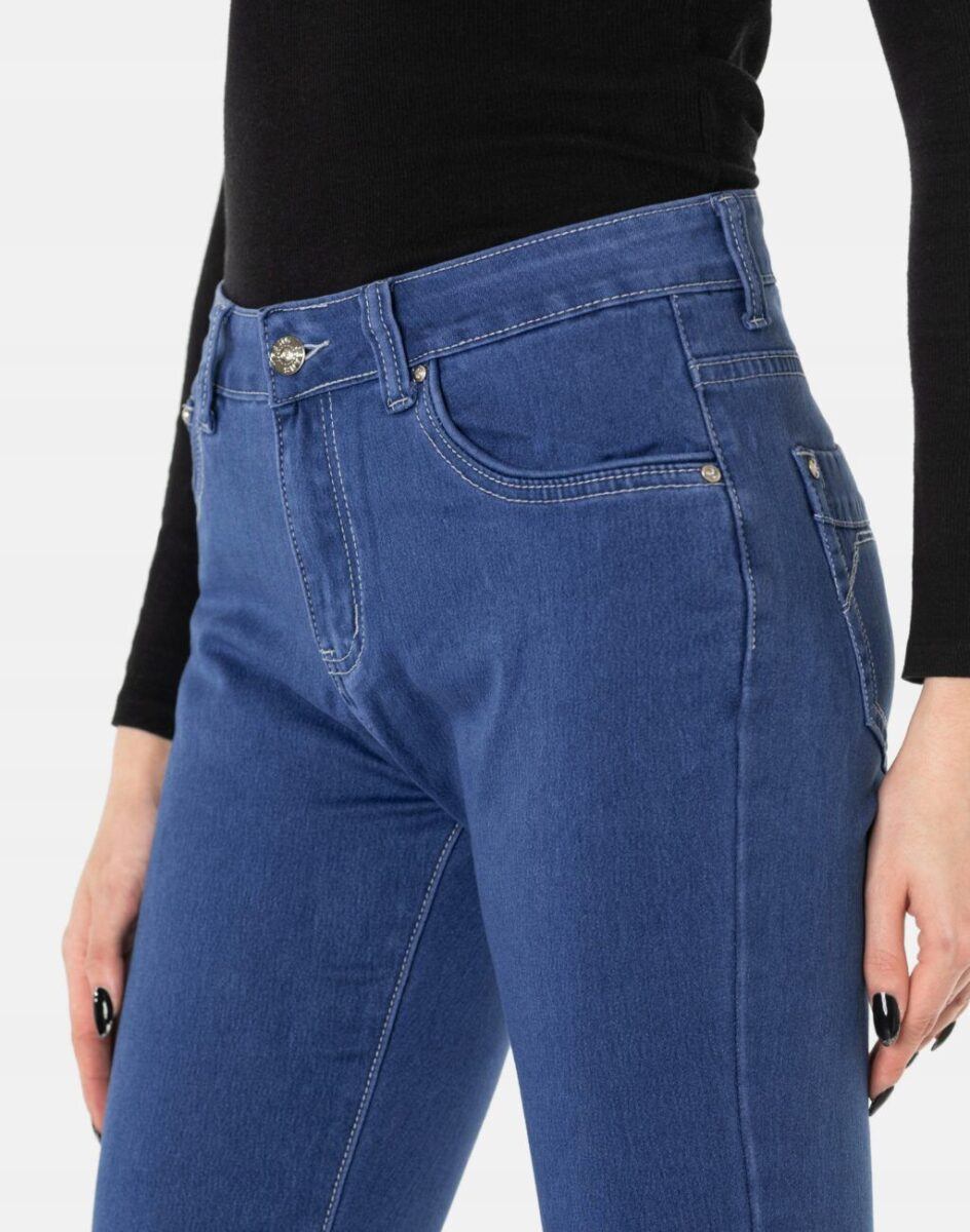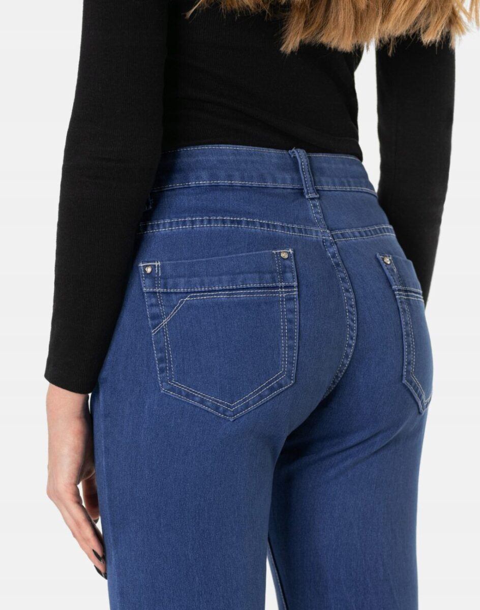 Oferowane przez nas spodnie uszyte są z wysokiej jakości tkaniny jeansowej „Blue Denim” z domieszką lycry, dzięki czemu spodnie są bardziej elastyczne. Pozwalają na pełną swobodę ruchów, co daje komfort przy siadaniu i zapewnia ogromny komfort noszenia. Modny i sprawdzony krój spodni sprawi, że w zależności od dopasowanego do nich elementu garderoby stworzysz wiele udanych stylizacji w których będziesz czuła się wygodnie i swobodnie. Możesz je śmiało łączyć zarówno z eleganckimi szpilkami (idealnie wydłużają kobiece nogi), lub w wersji bardziej „na luzie” z balerinami lub czółenkami na wysokim obcasie a Twoja stylizacja nabierze wyjątkowego charakteru. Zapewniają poczucie atrakcyjności przy jednoczesnym zachowaniu wygody i pełnej swobody ruchów. Sprawdzony przez wiele zadowolonych klientek fason spodni z klasyczną zwężaną nogawką pozwoli Ci założyć je na wiele różnych okazji a miłośniczki jeansów jednogłośnie twierdzą, że w trakcie ich noszenia pewność siebie szybuje bardzo wysoko.