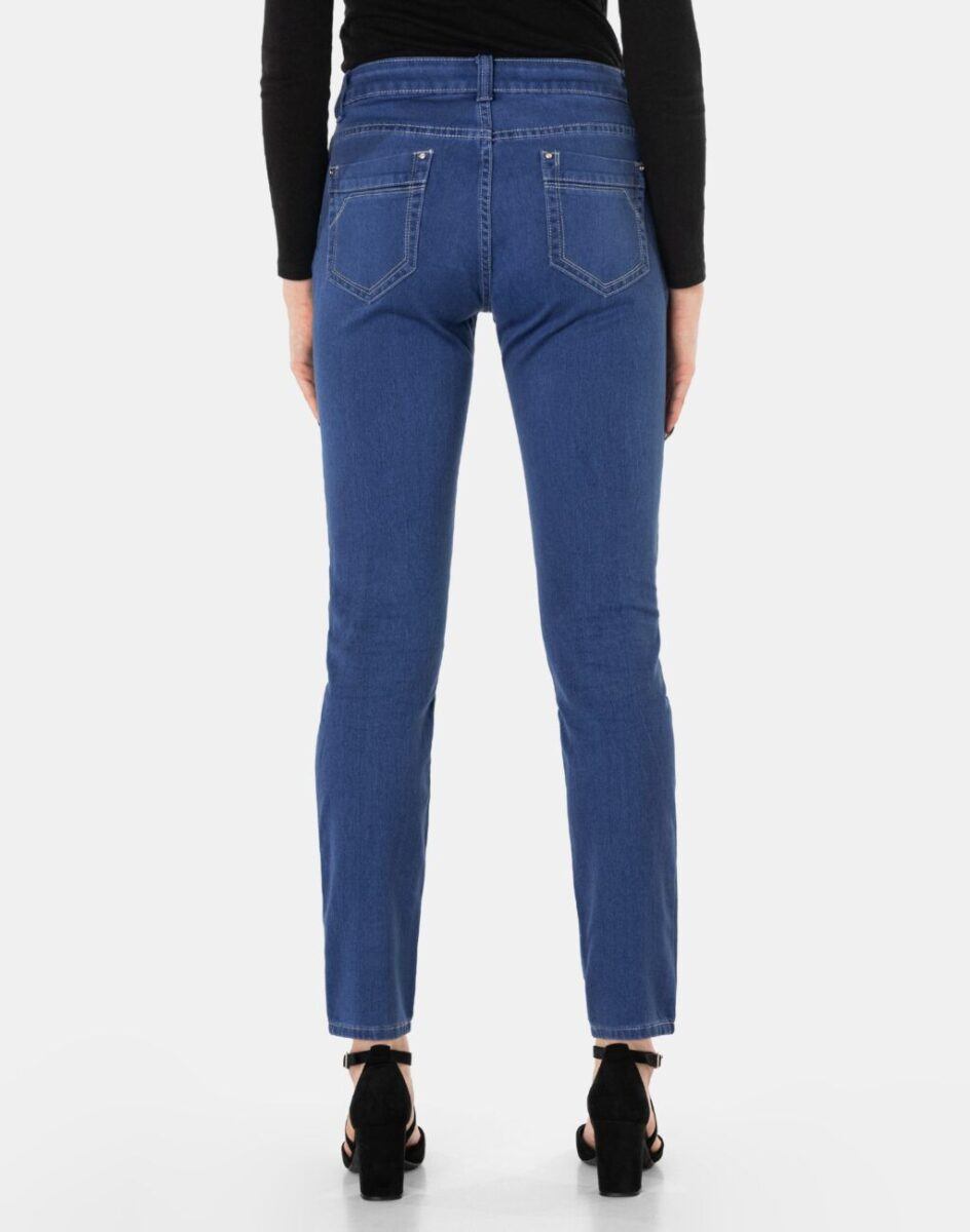 Jeansy damskie Trang model 414 to klasyczne, bardzo szykowne spodnie w kolorze niebieskim „Blue Denim” z średnim stanem i klasycznymi lekko zwężanymi nogawkami, w których sylwetka wygląda lekko i zgrabnie. Zapinane są na kryty zamek błyskawiczny i metalowy guzik sygnowany logiem firmy. Z przodu mają dwie kieszonki zaokrąglone oraz mniejszą kieszonkę tzw. bilonówkę, a na tyle klasyczne kieszenie naszywane jak w typowych spodniach jeansowych. W pasie szlufki umożliwiające stylizacje z paskiem. Najbardziej podatne na uszkodzenia miejsca wzmocnione są dodatkowymi przeszyciami oraz ozdobnymi nitami.