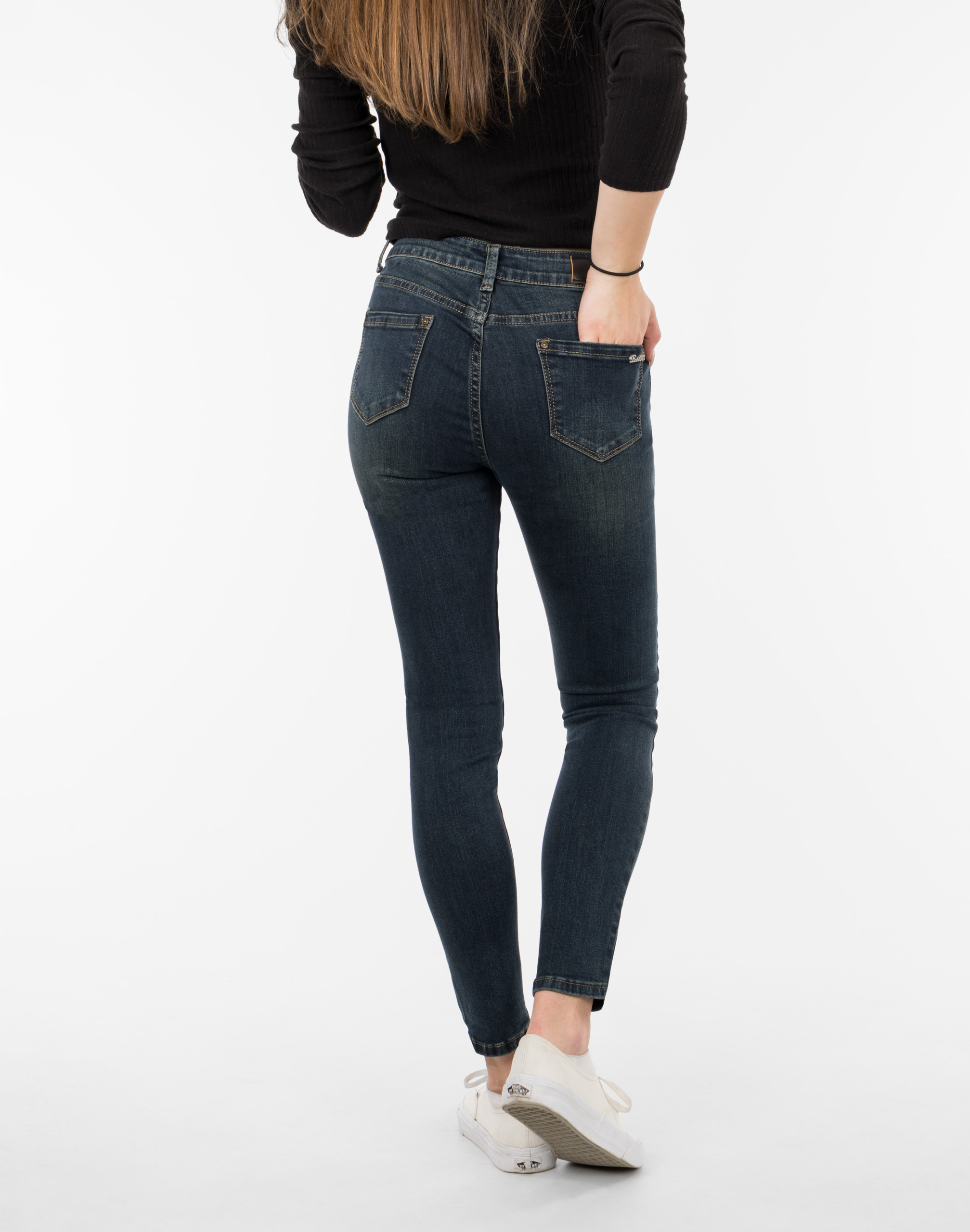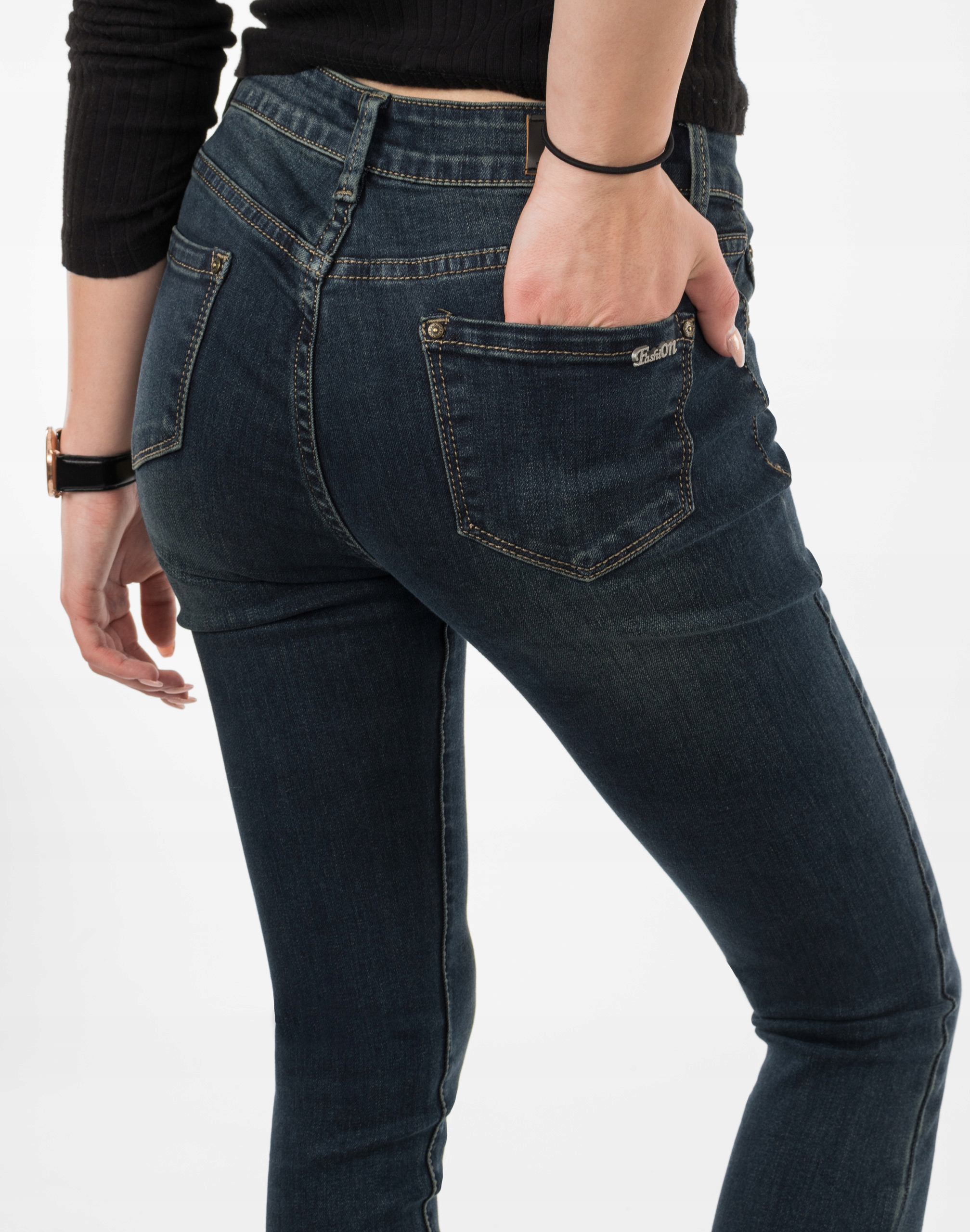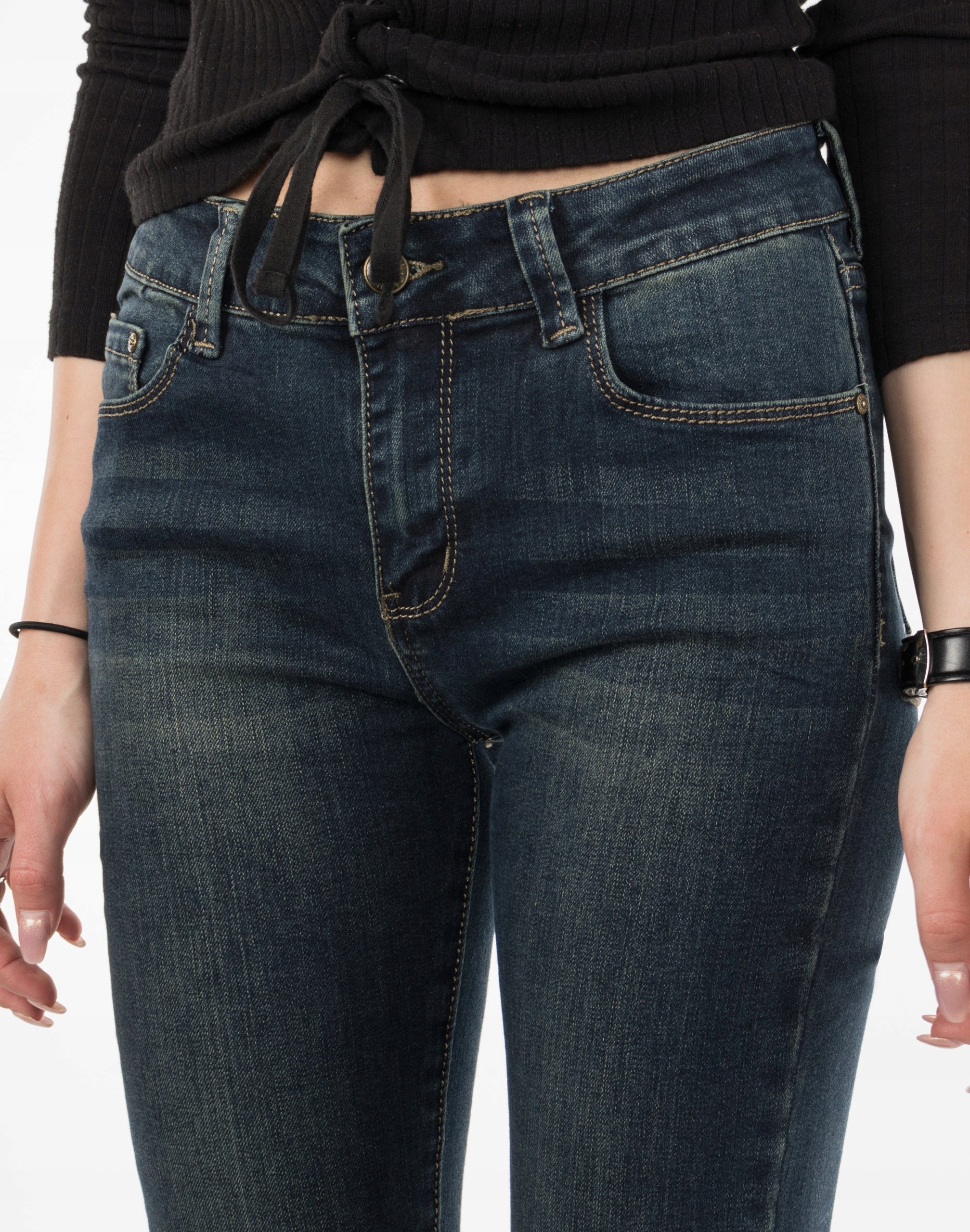 Zapinane są na kryty zamek błyskawiczny i guzik sygnowany logiem firmy. Z przodu mają dwie kieszonki zaokrąglone oraz mniejszą kieszonkę tzw. bilonówkę, a na tyle klasyczne kieszenie naszywane jak w typowych spodniach jeansowych. W pasie szlufki umożliwiające stylizacje z paskiem. Stan podwyższony zgrabnie modelujący sylwetkę w talii. Na nogawkach efektowne przetarcia w modnym stylu "used-look".