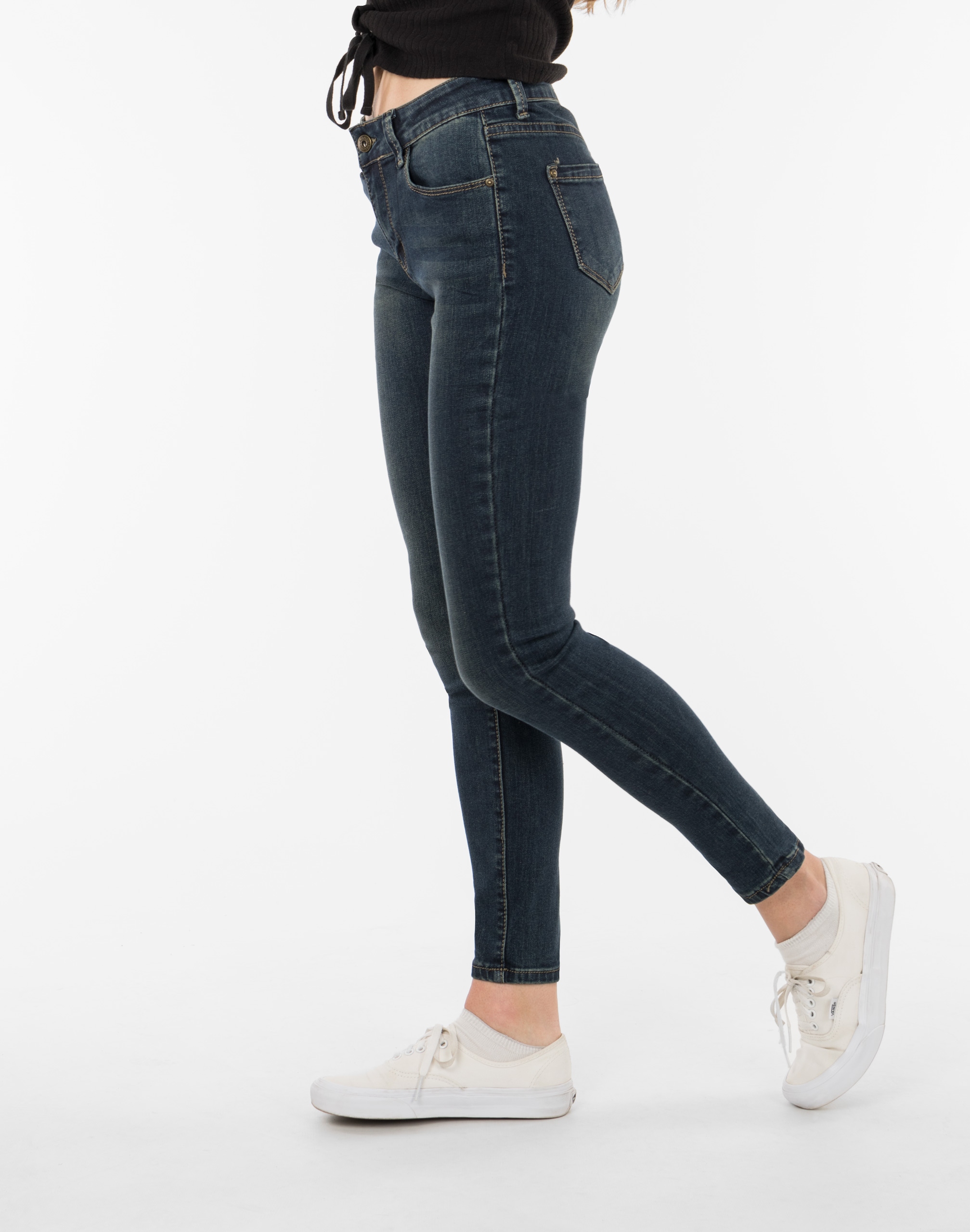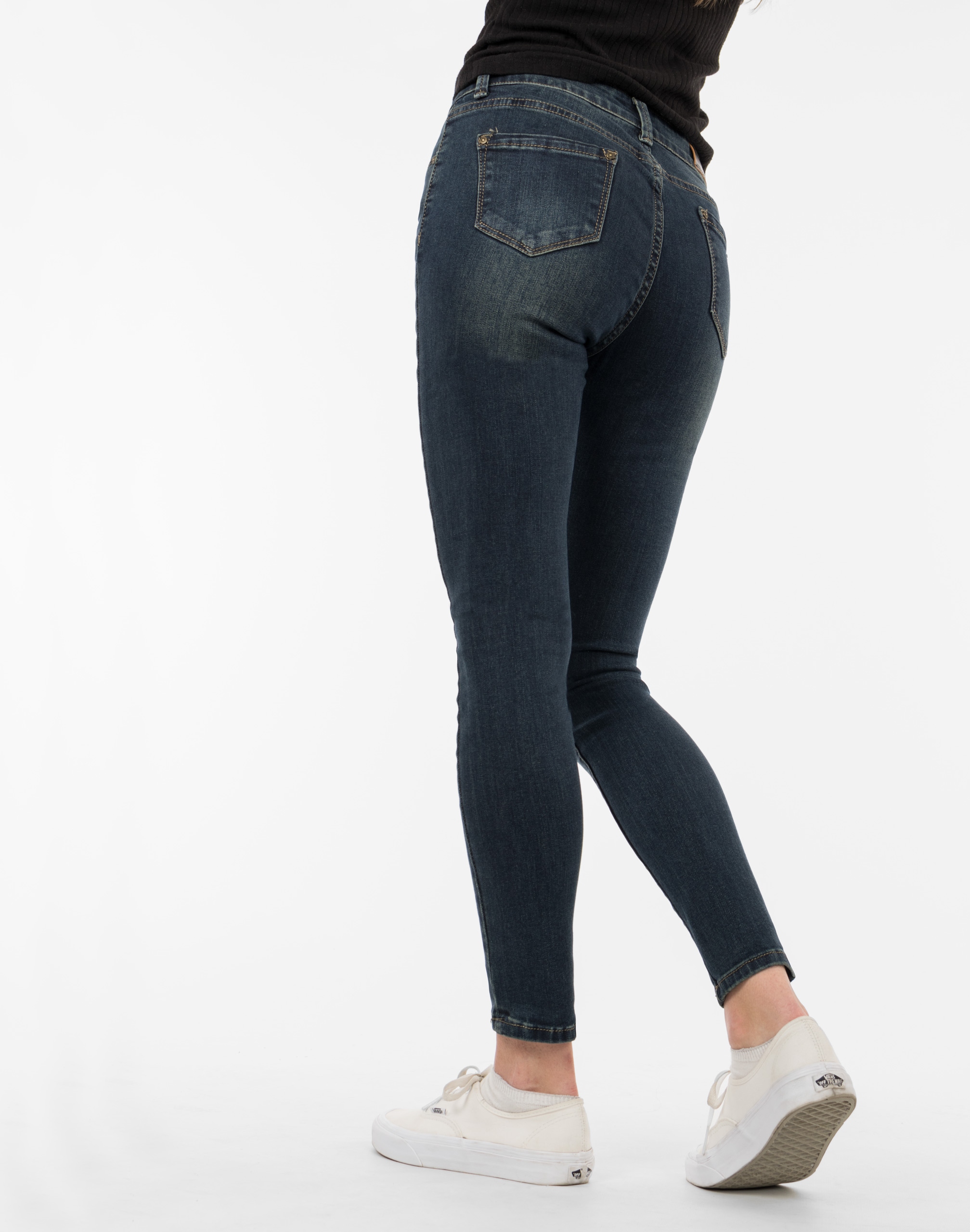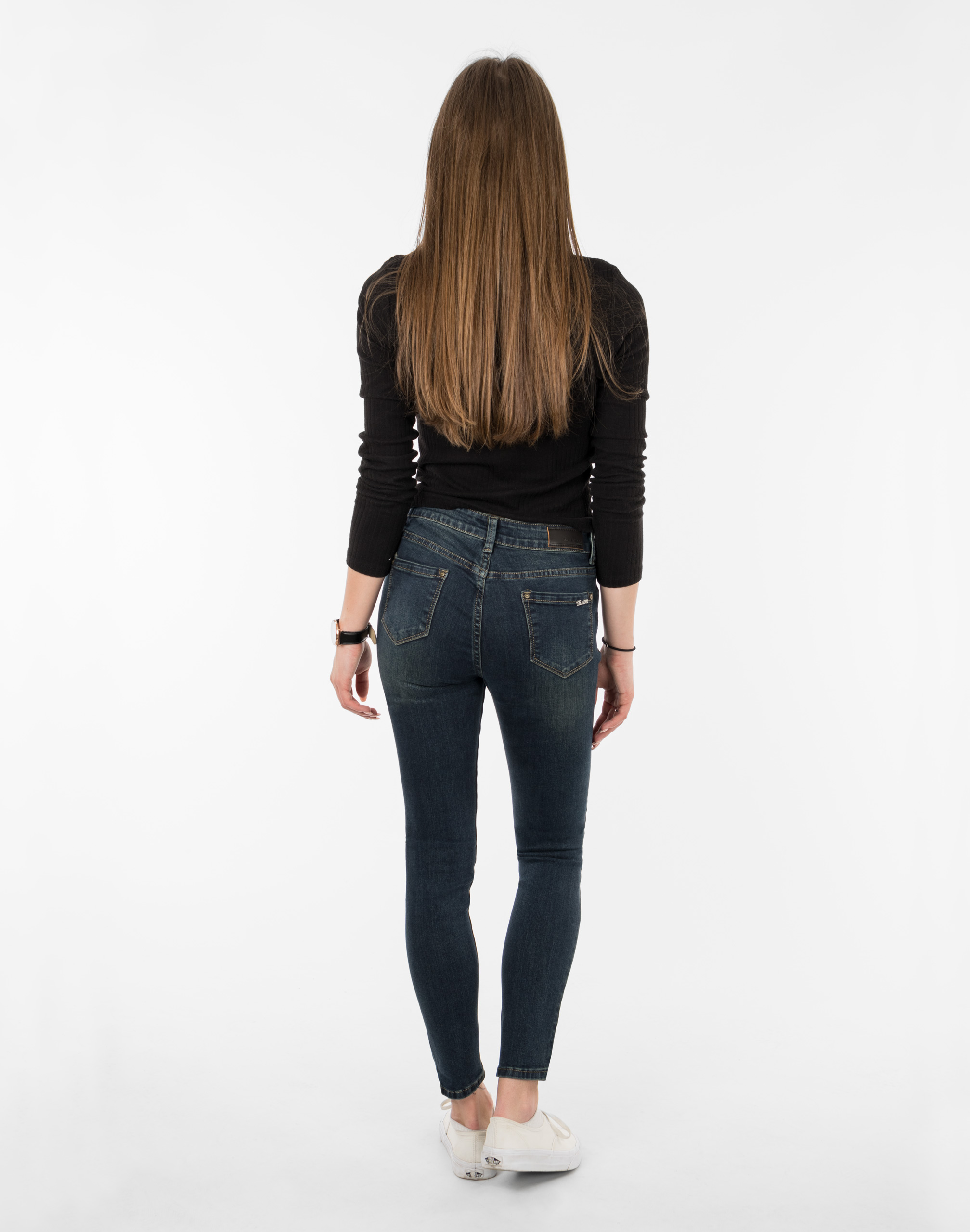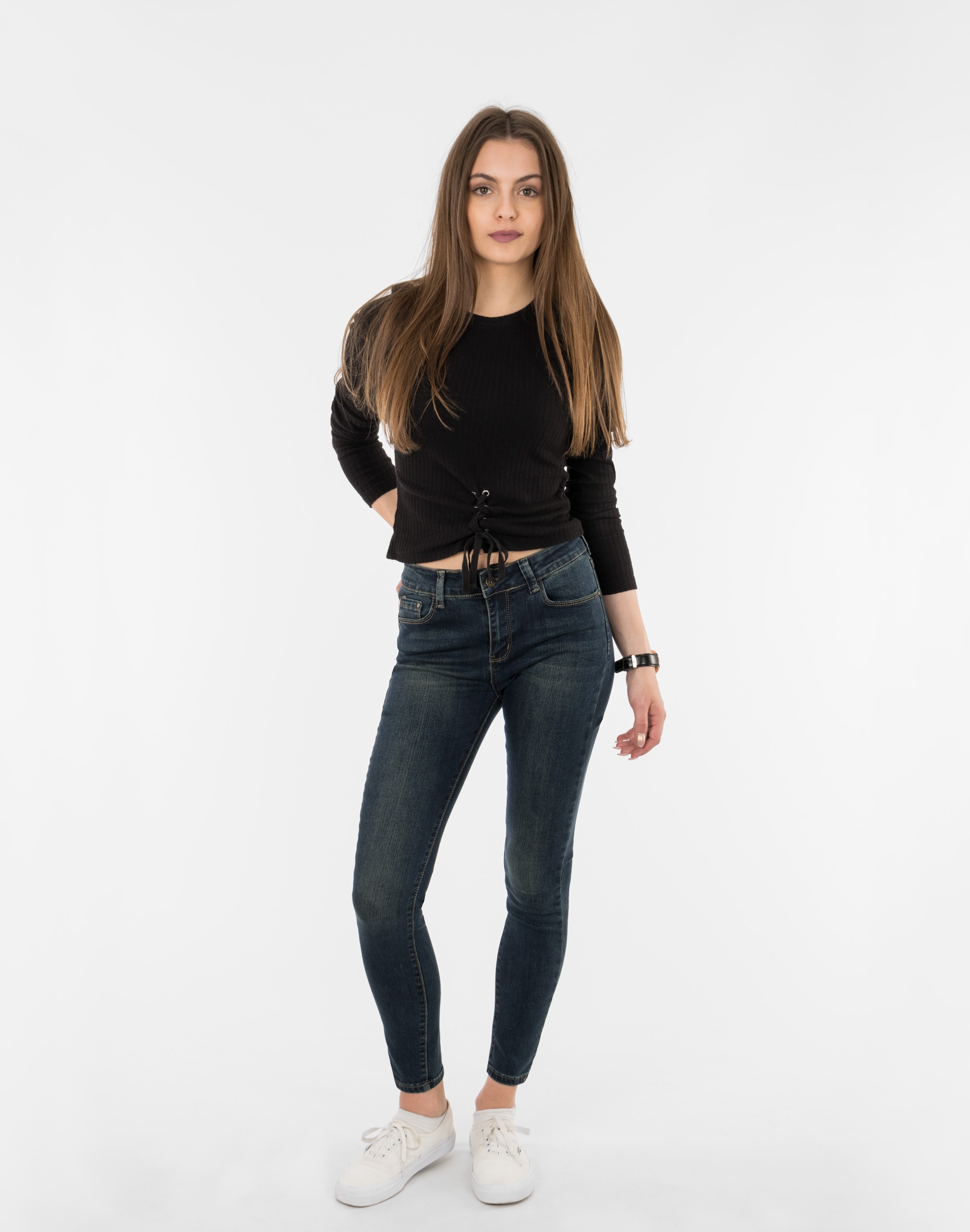 Zapinane są na kryty zamek błyskawiczny i guzik sygnowany logiem firmy. Z przodu mają dwie kieszonki zaokrąglone oraz mniejszą kieszonkę tzw. bilonówkę, a na tyle klasyczne kieszenie naszywane jak w typowych spodniach jeansowych. W pasie szlufki umożliwiające stylizacje z paskiem. Stan podwyższony zgrabnie modelujący sylwetkę w talii. Na nogawkach efektowne przetarcia w modnym stylu "used-look".
