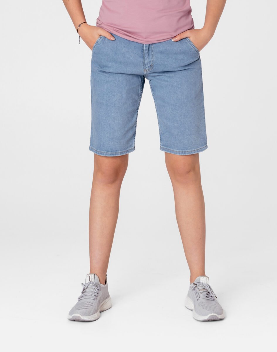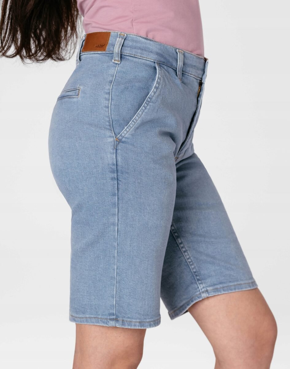 Oferowane przez nas spodenki uszyte są wysokiej jakości cienkiej tkaniny jeansowej "Denim Blue" z domieszką lycry (elastan), dzięki czemu są bardziej elastyczne i doskonale dopasowują się do każdej figury. Niewielki dodatek elastanu (lycra) sprawia że spodnie są bardziej elastyczne, dobrze dopasowują się do sylwetki, i są bardzo komfortowe w użytkowaniu. Łatwo się je zakłada i są znacznie wygodniejsze od jeansów, które lycry nie mają. Poza tym bawełna ma tendencję do kurczenia się w praniu, dlatego lycra sprawia, że spodnie są wyjątkowo praktyczne i można je bez problemu założyć zaraz po wysuszeniu. Pozwalają na pełną swobodę ruchów, co daje wygodę przy siadaniu i zapewnia ogromny komfort noszenia. Zapewniają poczucie atrakcyjności, przy jednoczesnym zachowaniu wygody i swobody ruchów. Możesz je śmiało łączyć zarówno ze szpilkami (idealnie wydłużają kobiece nogi), jak i obuwiem sportowym, a Twoja stylizacja nabierze wyjątkowego charakteru. Dbając o wygląd jednocześnie modny i naznaczony letnią swobodą, warto założyć jeansowe bermudy i nawet w mieście poczuć oddech wakacji.