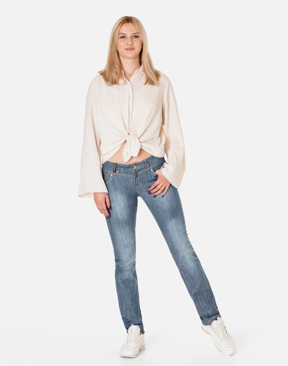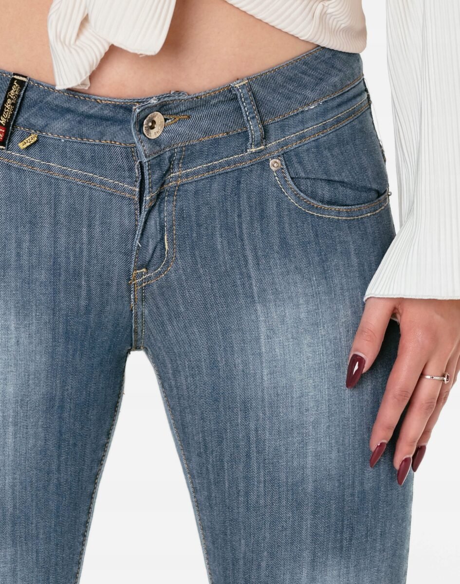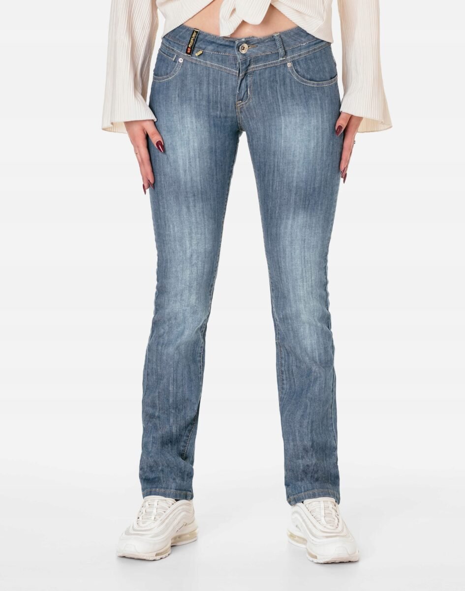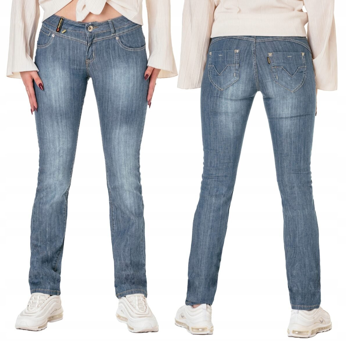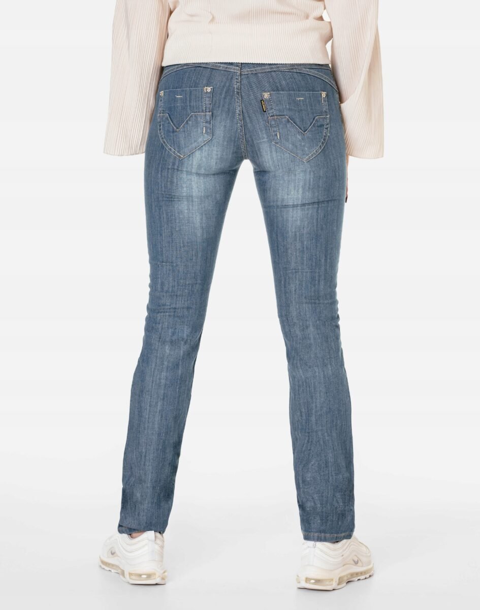 Jeansy damskie model #542 z fabrycznym efektem znoszonego, zniszczonego jeansu "used-look" (zużyty wygląd), w procesie produkcji poddane zostały specjalnym zabiegom postarzającym materiał polegającym to na wycieraniu, wypieraniu barwnika i tworzeniu efektownych rozjaśnień i przetarć. Wykonane z wysokiej jakości tkaniny jeansowej "Light Blue Denim" średniej grubości z modnym efektem sprania i przetarciami w nieśmiertelnym stylu "used-look" (zużyty wygląd). Efektowne rozjaśnienia i przetarcia mają na celu wywołanie tak modnego efektu starych, długo noszonych, zużytych jeansów. Zapinane na kryty zamek błyskawiczny i metalowy guzik sygnowany logiem firmy. Z przodu mają dwie kieszonki zaokrąglone oraz mniejszą kieszonkę tzw. bilonówkę, a na tyle klasyczne kieszenie naszywane jak w typowych spodniach jeansowych. W pasie szlufki umożliwiające stylizacje z paskiem. Najbardziej podatne na uszkodzenia miejsca wzmocnione są dodatkowymi przeszyciami oraz małymi ozdobnymi nitami.