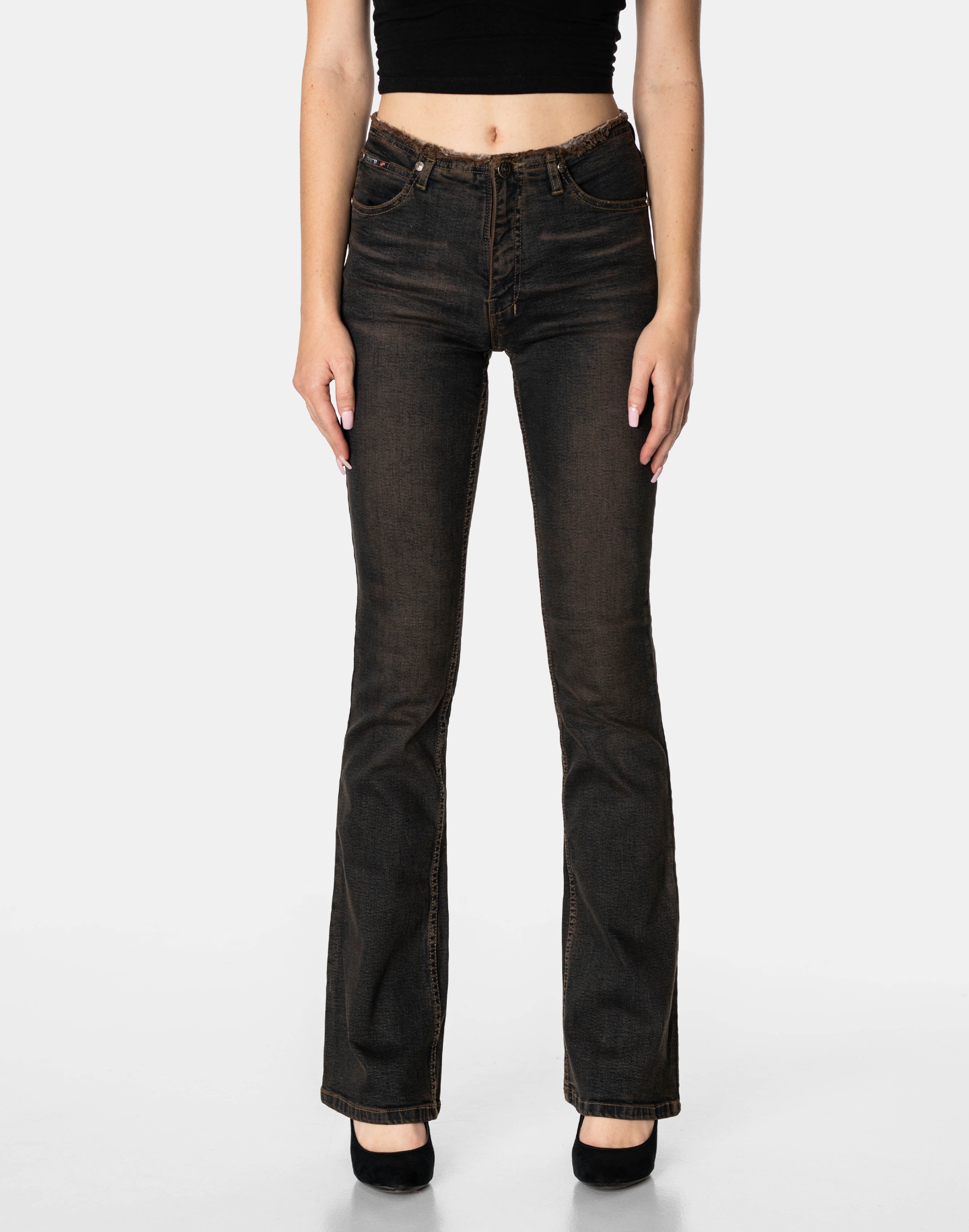 Super modne spodnie firmy TWISTER JEANS COMPANY model 12225 to powracające do łask jeansy typu "dzwony" w kolorze brązowym "Bad Wash Brown", o charakterystycznych dla tego modelu rozszerzających się dołem nogawkach i wyższym stanie "High Rise". Wykonane ze 100% tkaniny bawełnianej typu Denim Jeans, poddanej w procesie produkcji obróbce chemicznej-dekatyzacji celem uzyskania zamierzonego efektu "BAD WASH". Wykorzystując metodę "BAD WASH" uzyskano charakter VIGTAGE czyli celowo postarzone wytarcia i pomięcia spodni w subtelnie brązowym odcieniu. Zapinane są na kryty zamek błyskawiczny i metalowy guzik. Z przodu mają dwie zaokrąglone kieszonki, oraz mniejszą tzw. bilonówkę a z tyłu klasyczne kieszenie wpuszczane. W pasie szlufki umożliwiające stylizacje z paskiem. Stan podwyższony "High Rise" zgrabnie modelujący sylwetkę w talii.